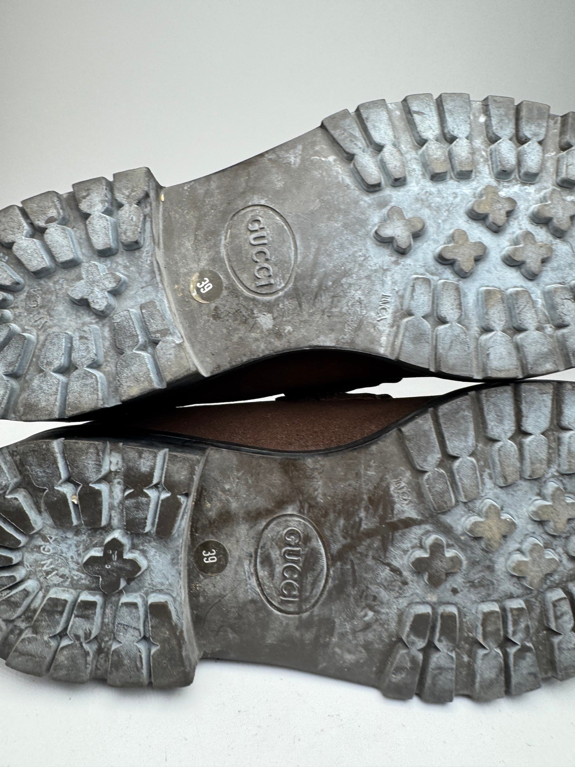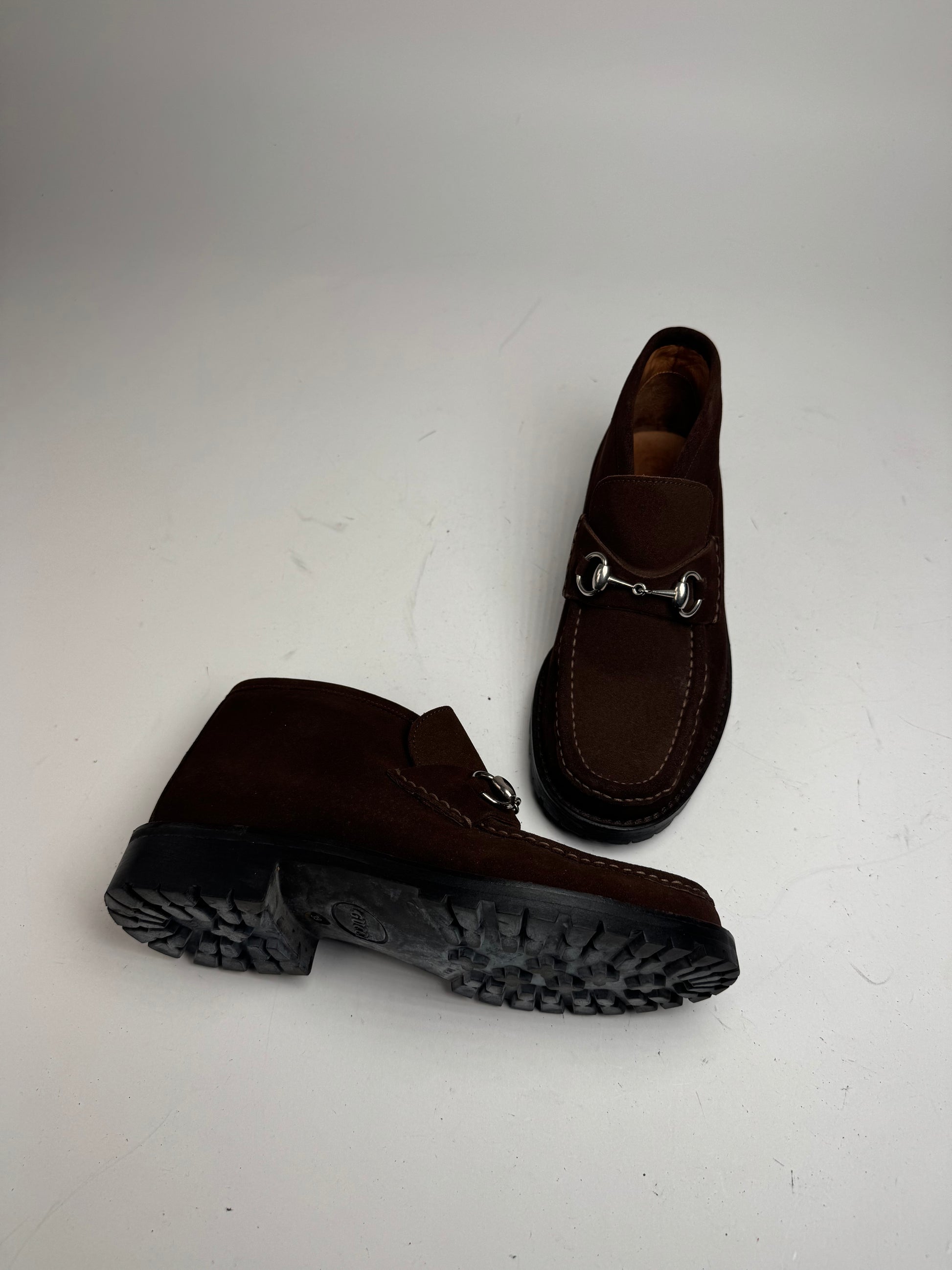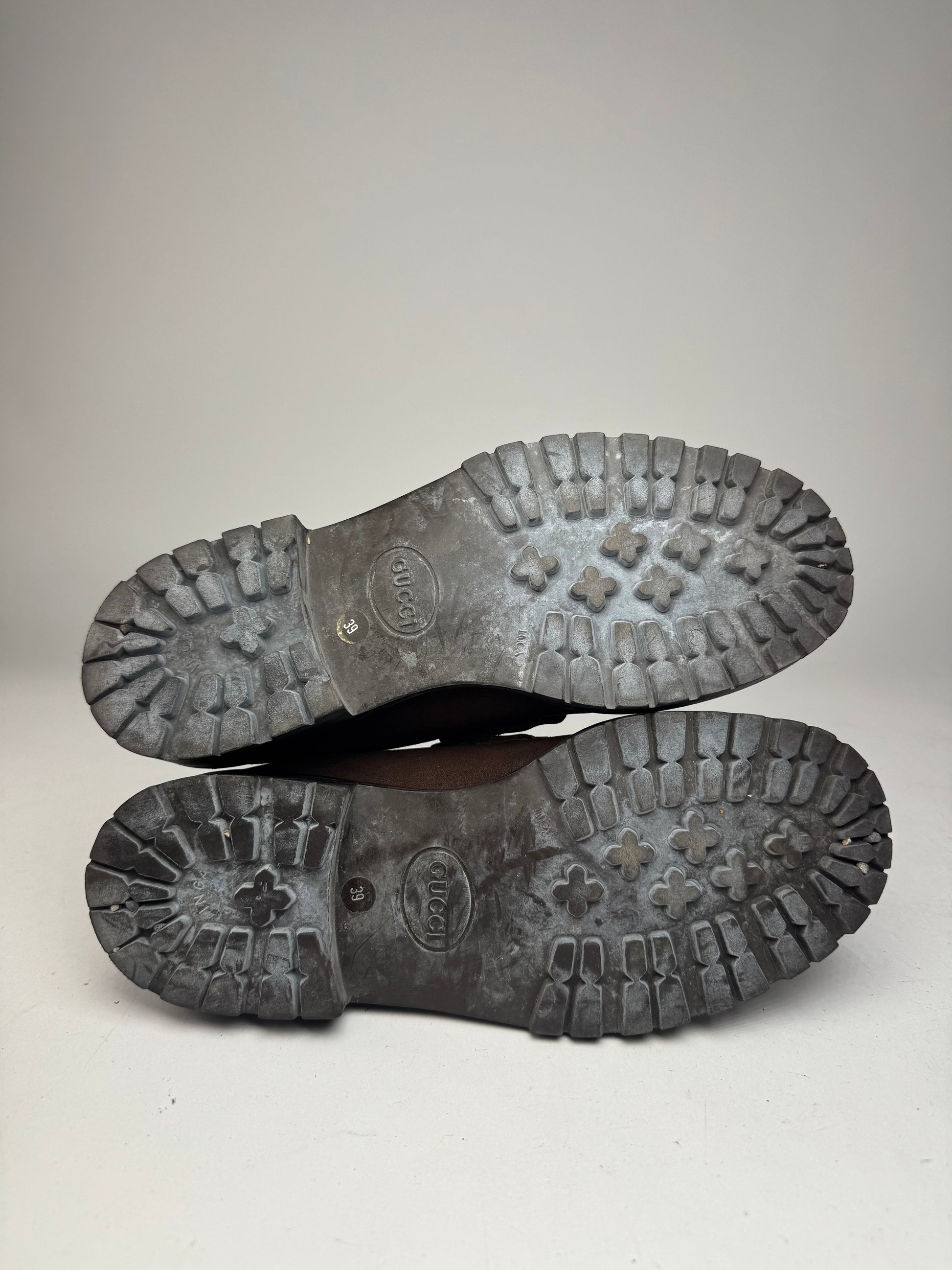 These elegant vintage boots are crafted from rich brown suede and feature Gucci’s iconic Horsebit detail in silver-tone steel across the instep — a symbol of the brand’s heritage and equestrian-inspired design. The white stitching contrasts beautifully with the dark suede, while the black rubber soles provide durability and structure. Made in Italy, the boots are lined with smooth brown leather for added comfort and refinement.