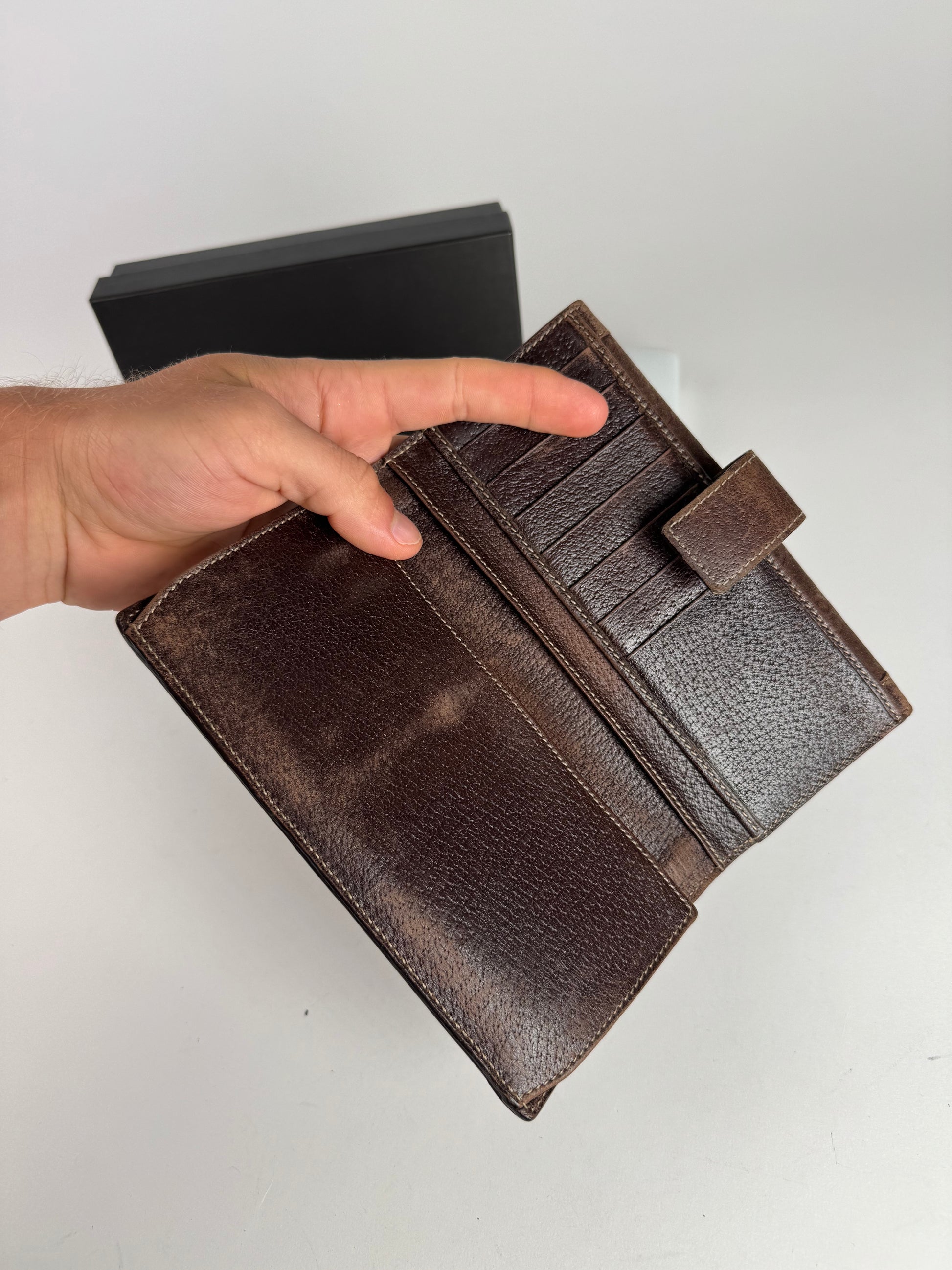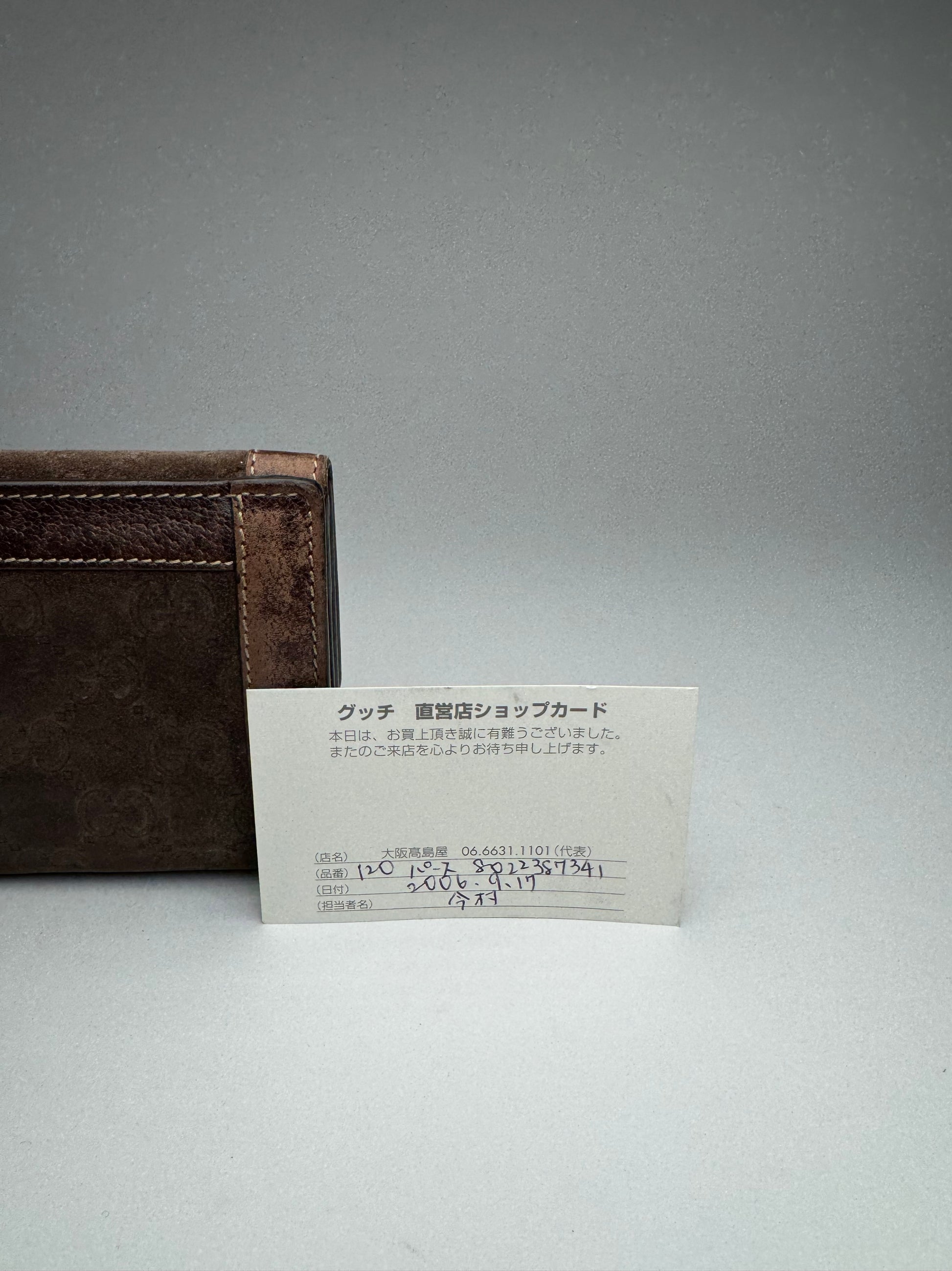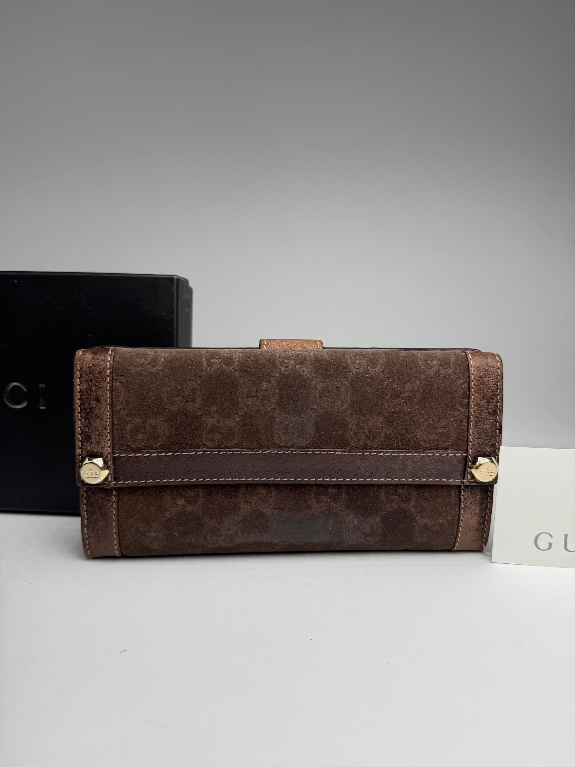 This chic wallet is finely crafted of brown leather and brown suede in the classic Gucci monogram. It features gold-tone steel hardware.