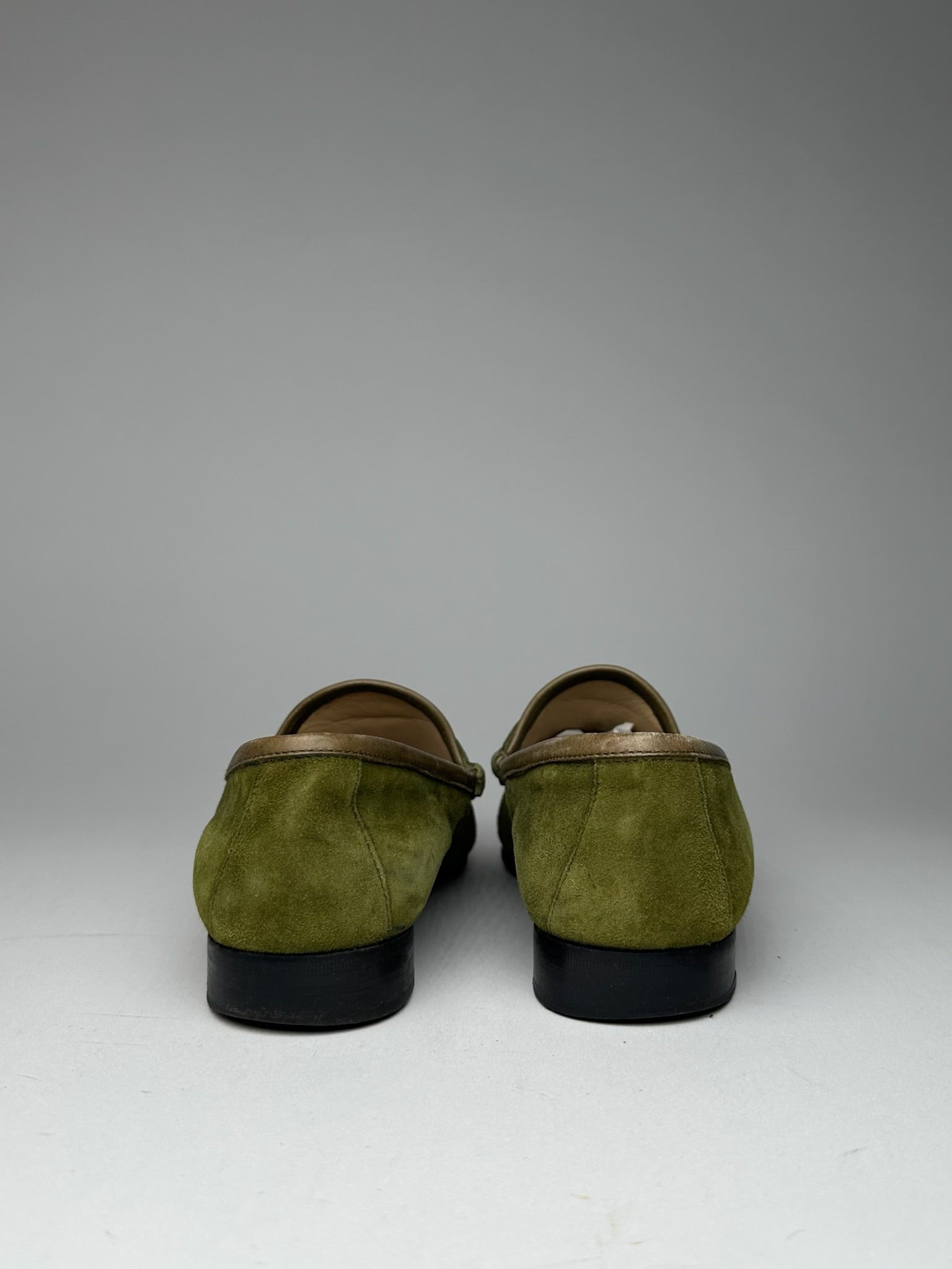 These chic loafers are crafted from dark green suede and feature the iconic gold-tone steel Horsebit detail across the upper. A timeless design with Italian craftsmanship and a refined silhouette.