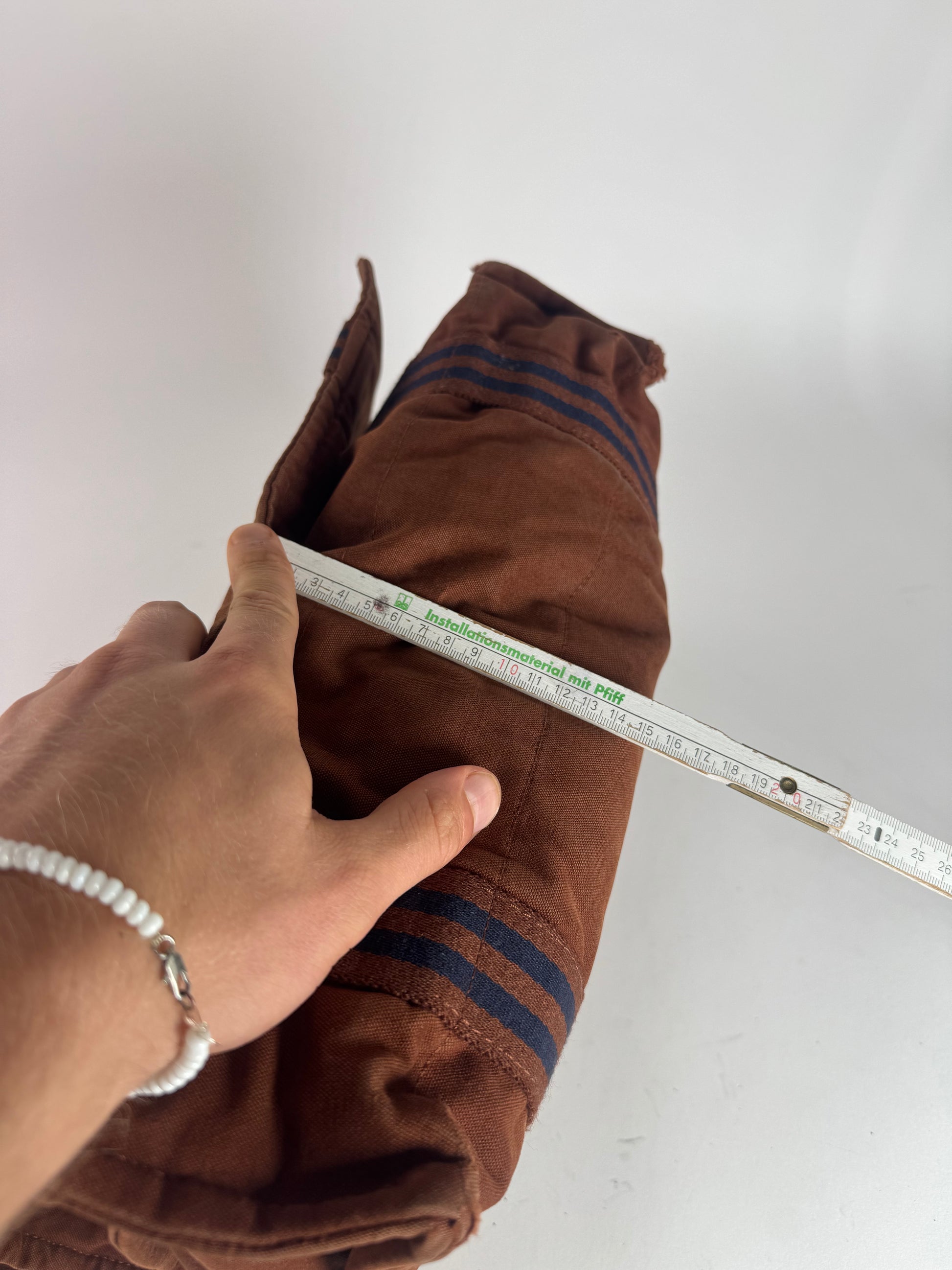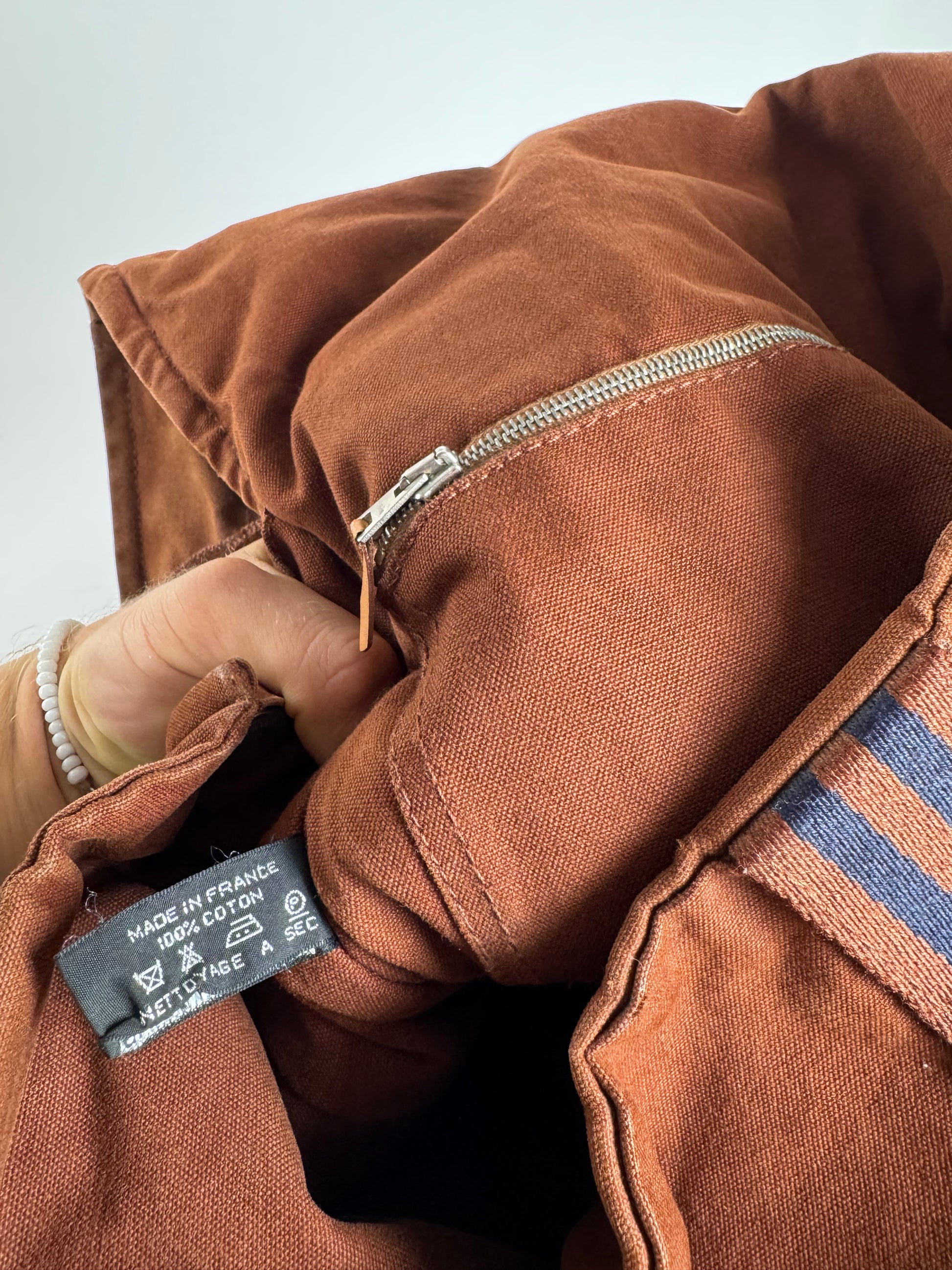 HERMÈS Orange Brown Cotton Canvas Shoulder Bag. This vintage unisex bag is crafted of 100% cotton canvas in an orange-brown tone. Hermès, founded in 1837 in Paris, is famed for its exceptional craftsmanship and timeless French luxury. The adjustable strap is woven in a navy, orange, and brown striped design. The bag features a silver-tone steel snap button closure and silver-tone hardware throughout.
