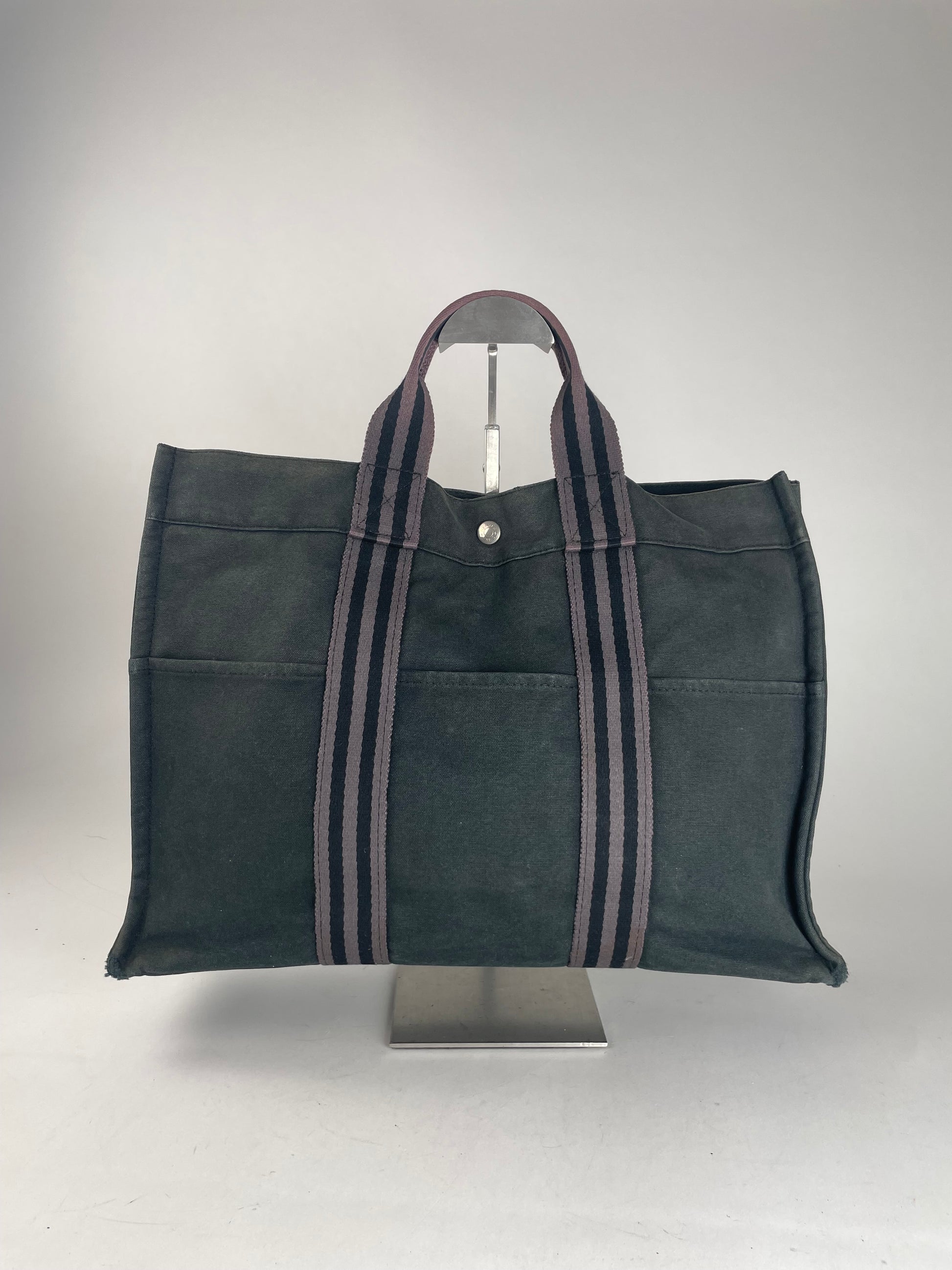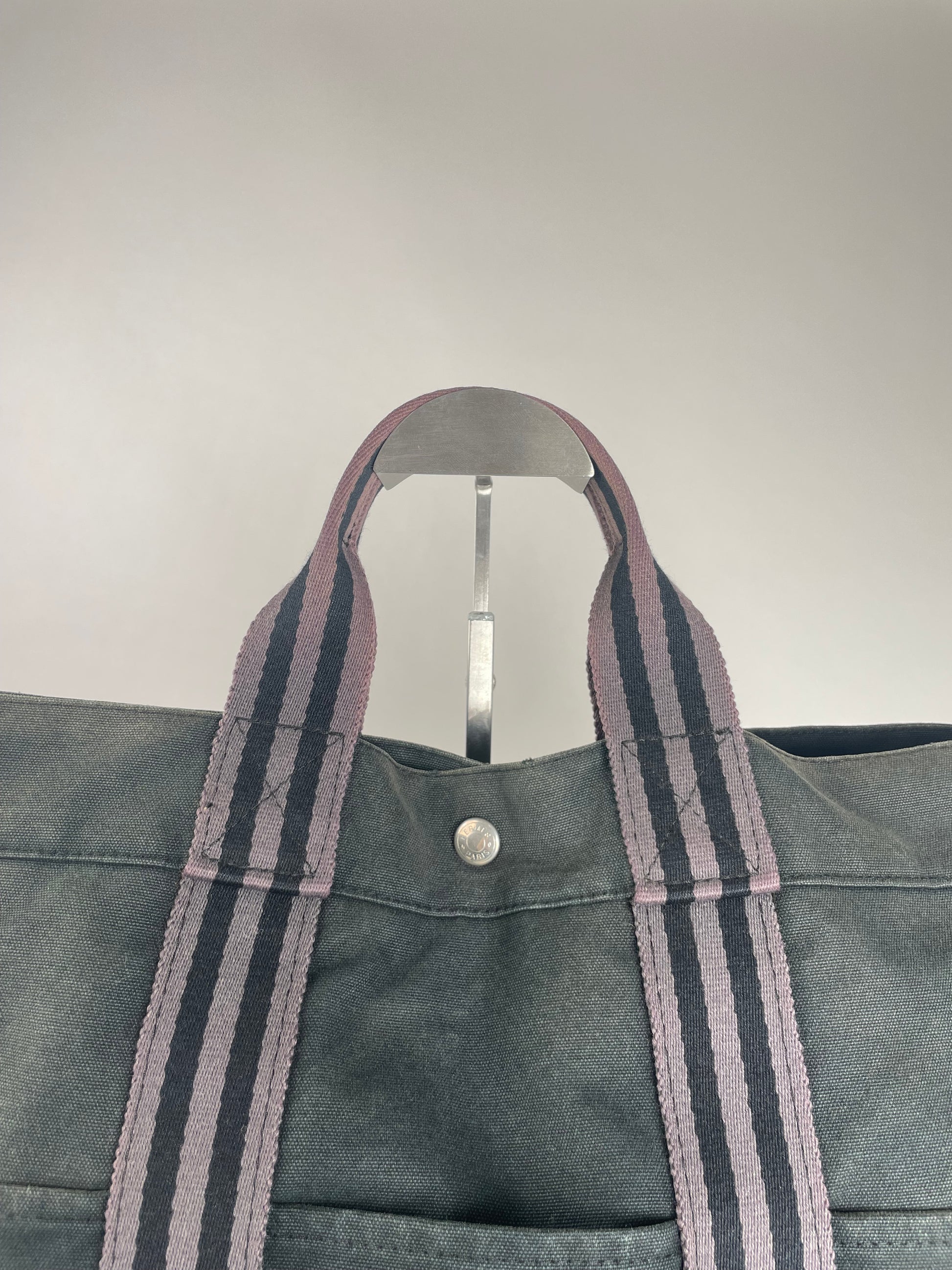HERMÈS Vintage Shopper Bag. This vintage Hermès shopper bag is crafted from black canvas, offering a timeless and versatile design. The silver-tone steel hardware adds a refined touch, while the striped handles in purple and black provide a unique contrast. Made in France from 100% canvas, the bag is lightweight yet durable. Despite some spots and slightly worn corners, it remains in very good condition.