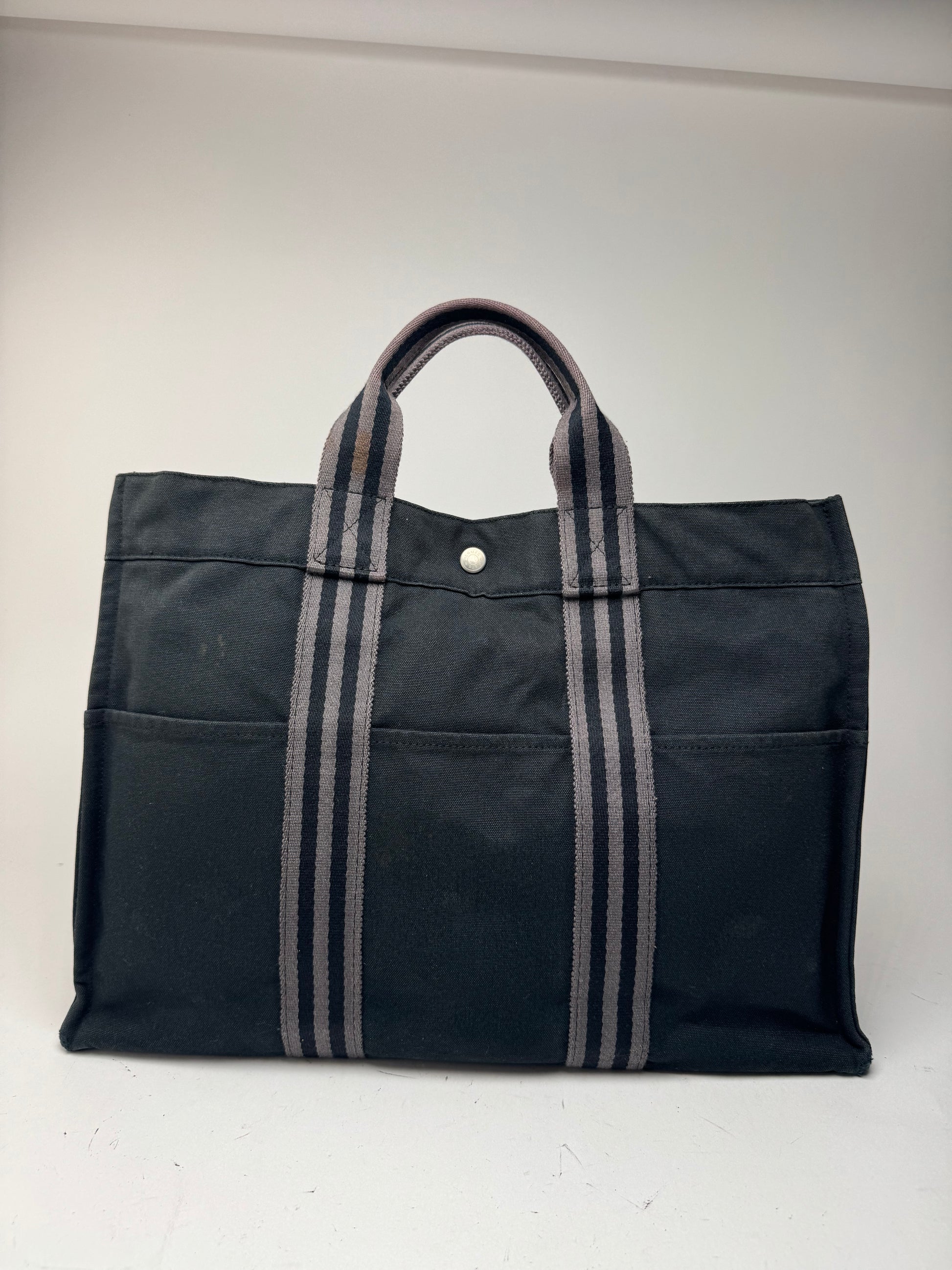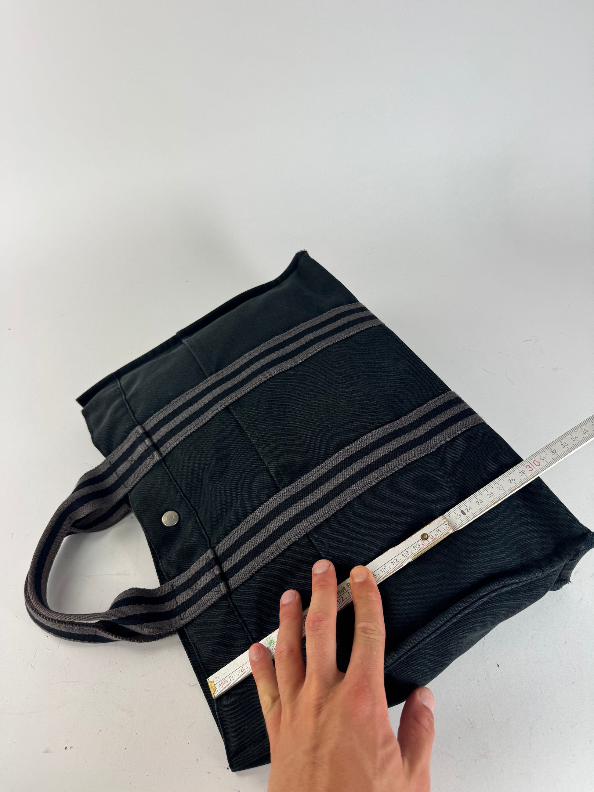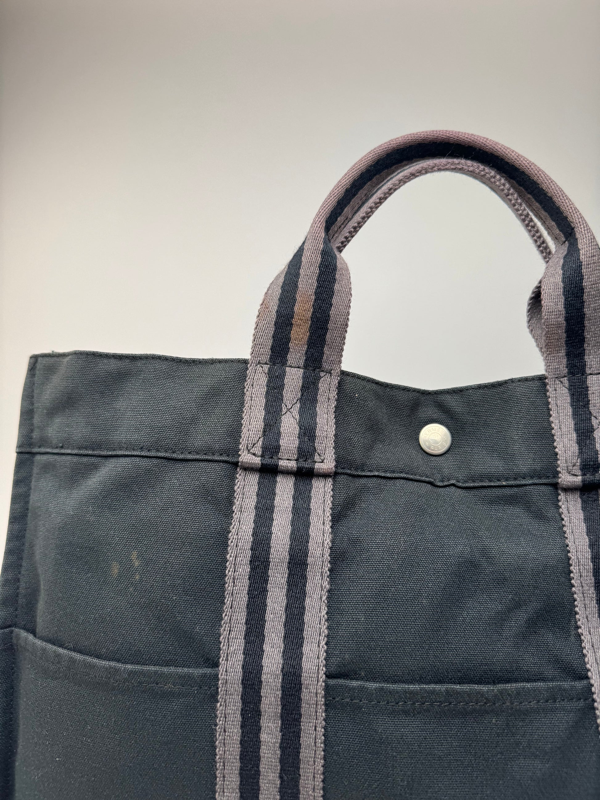 HERMÈS PARIS Vintage Cotton Shopper Bag. This casual shopper is crafted from 100% black cotton with grey-black striped handles and features a silver-tone steel snap button closure. The interior is lined in black canvas.