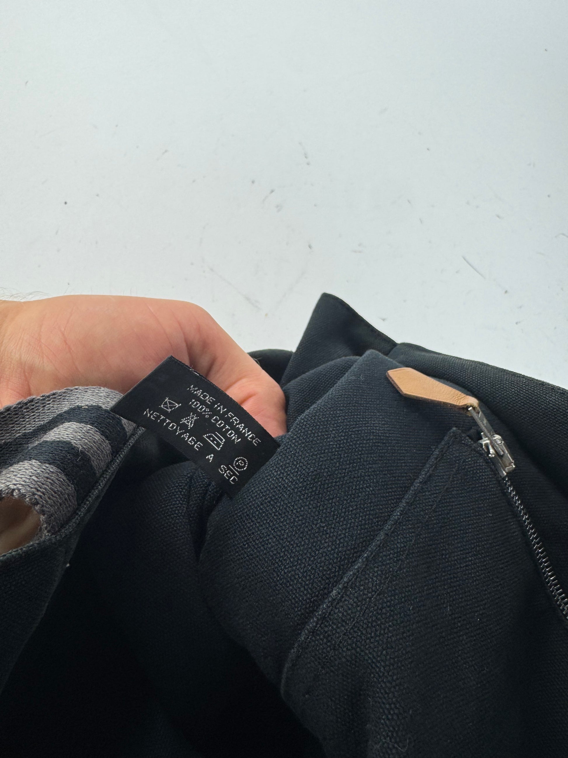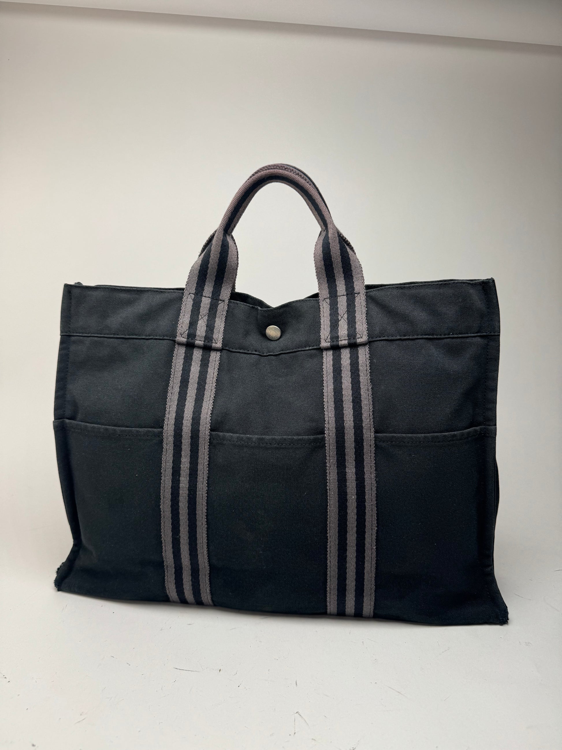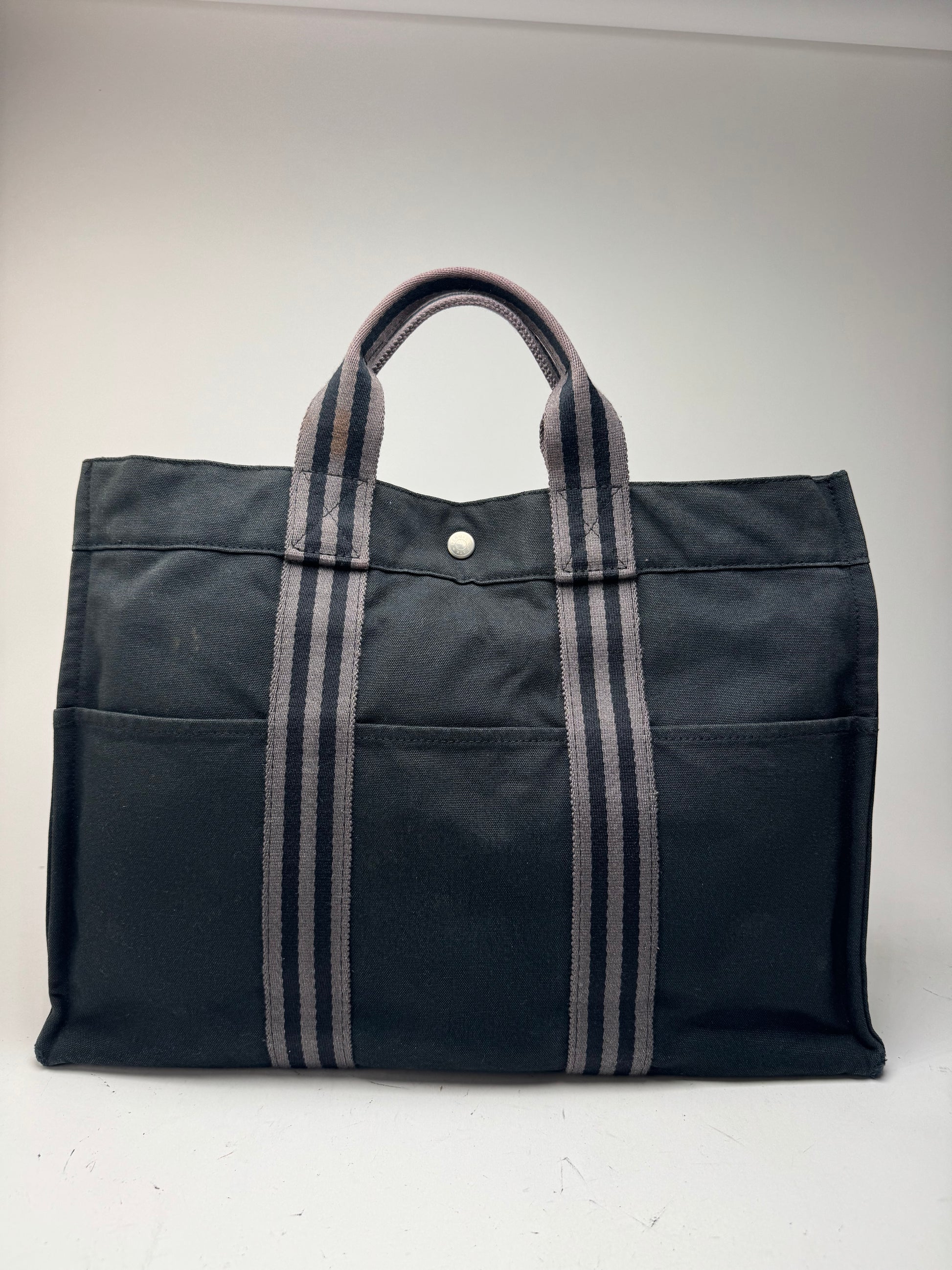 HERMÈS PARIS Vintage Cotton Shopper Bag. This casual shopper is crafted from 100% black cotton with grey-black striped handles and features a silver-tone steel snap button closure. The interior is lined in black canvas.