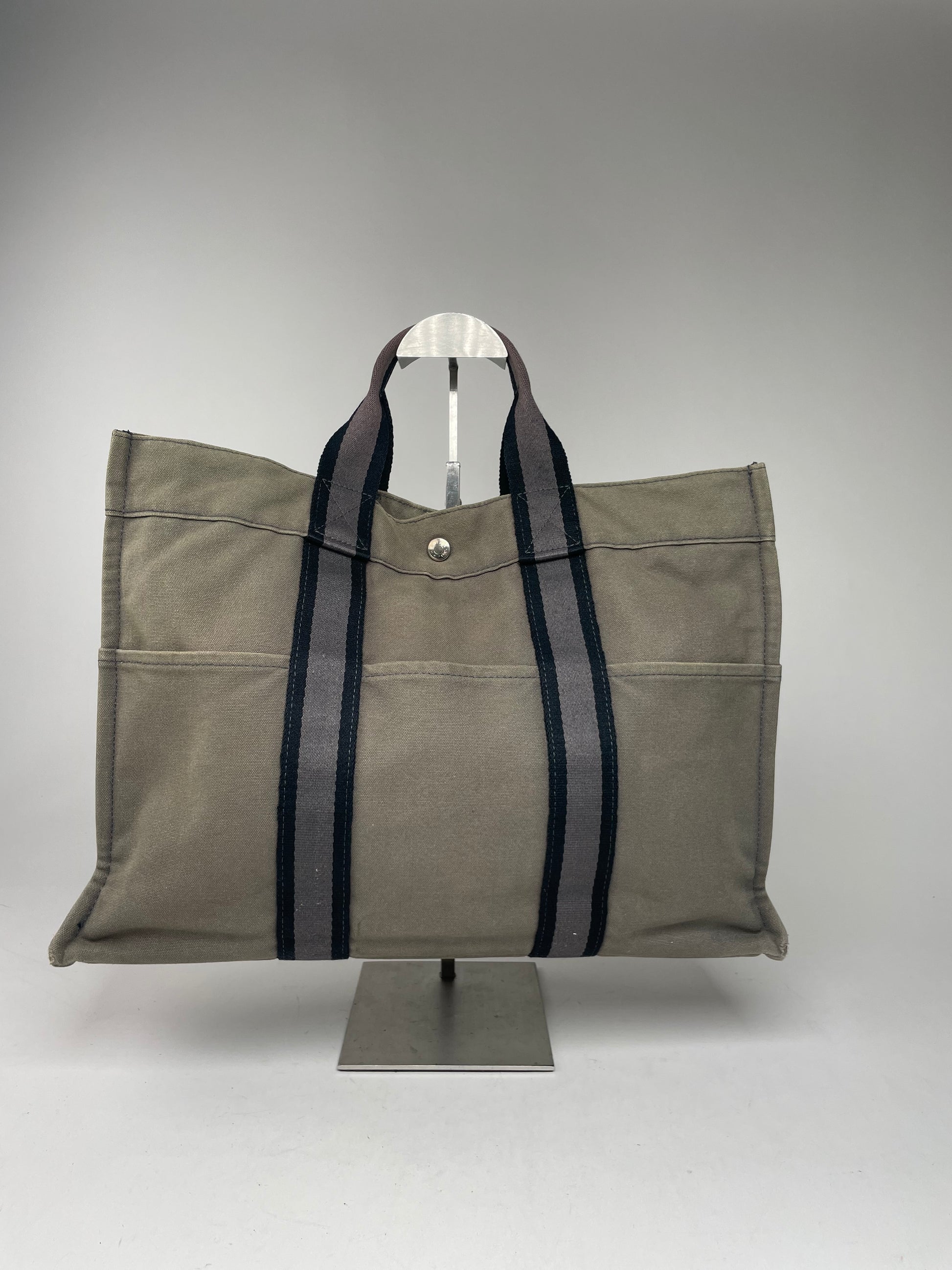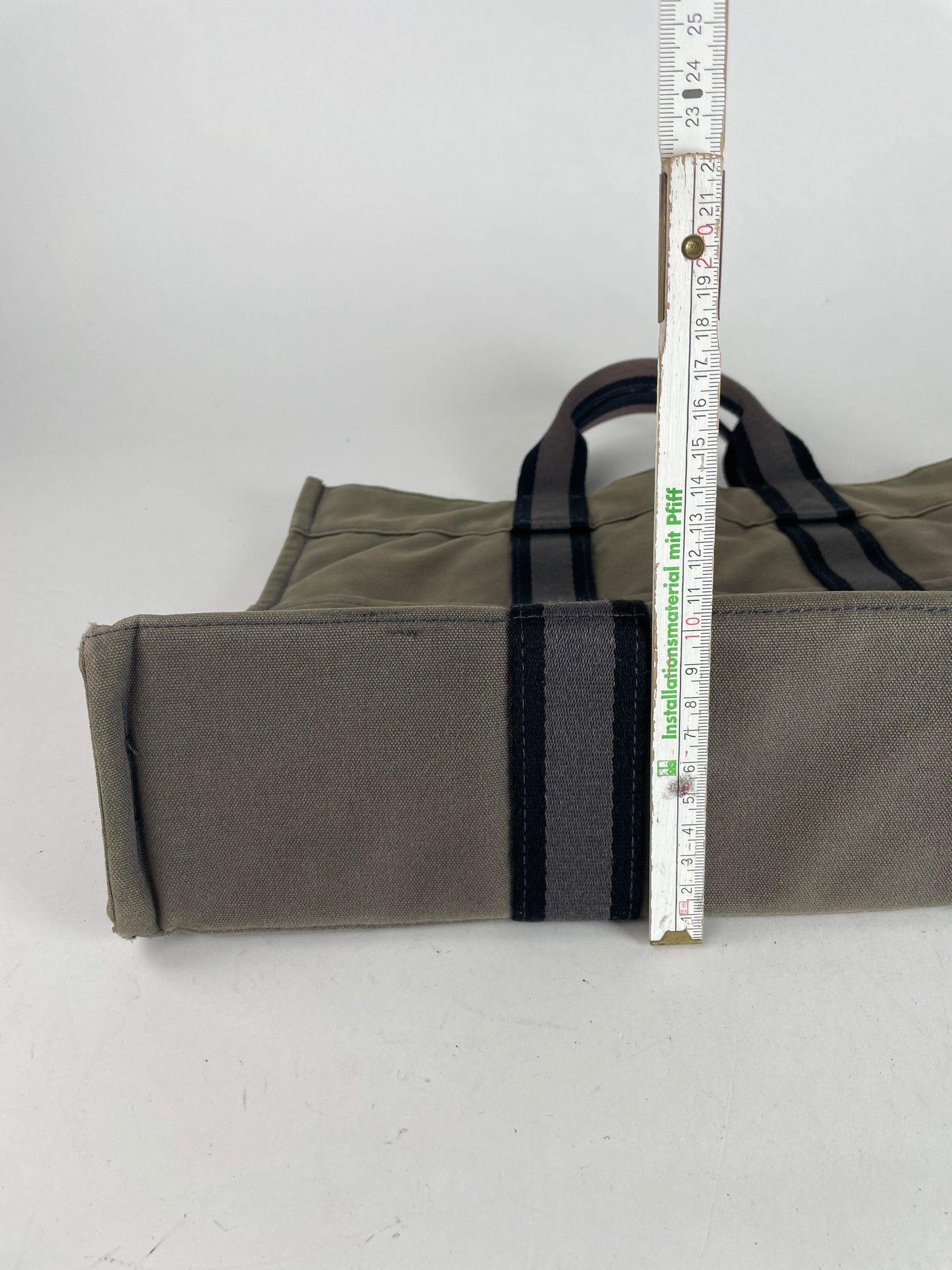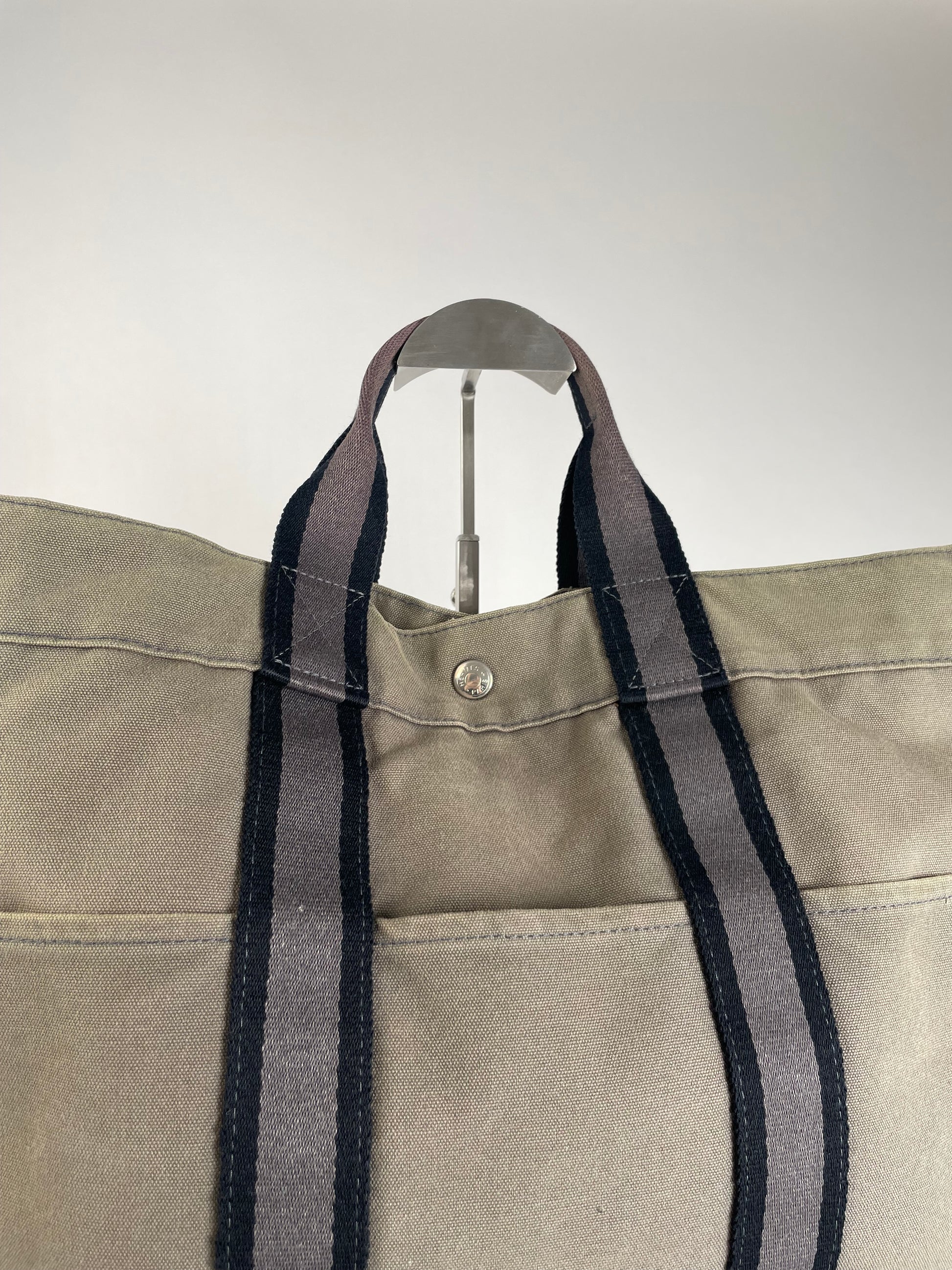 HERMÈS Vintage Shopper Bag. This vintage Hermès shopper bag is crafted from green 100% canvas, offering a stylish yet durable design. The silver-tone steel hardware adds a refined touch, while the gray and black striped handles provide a unique contrast. Despite some scuffs and spots, the bag remains in very good condition. Made in France.