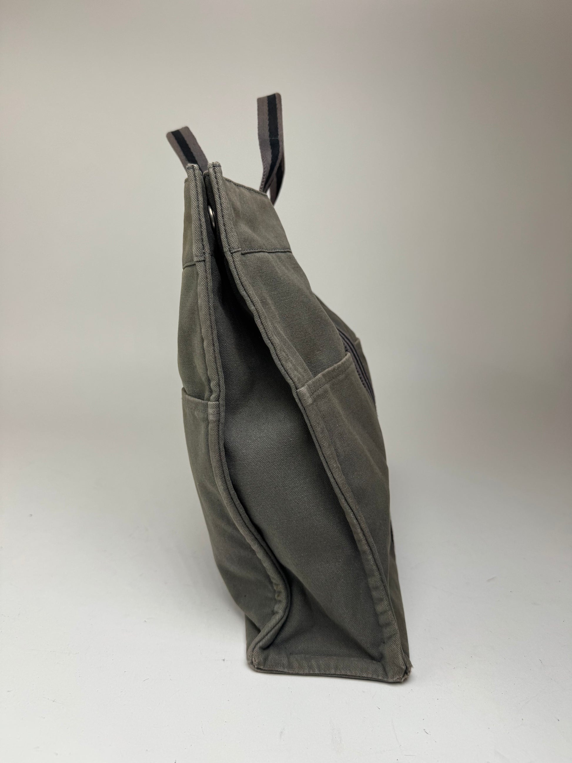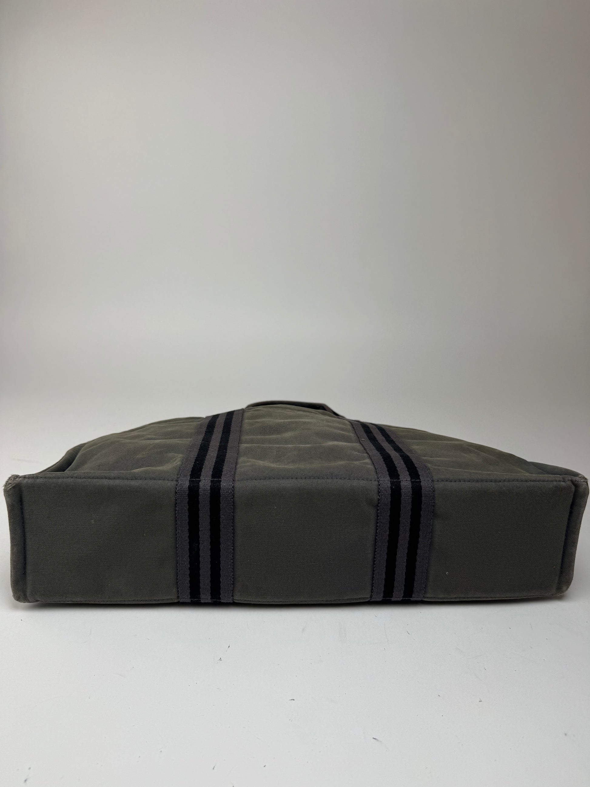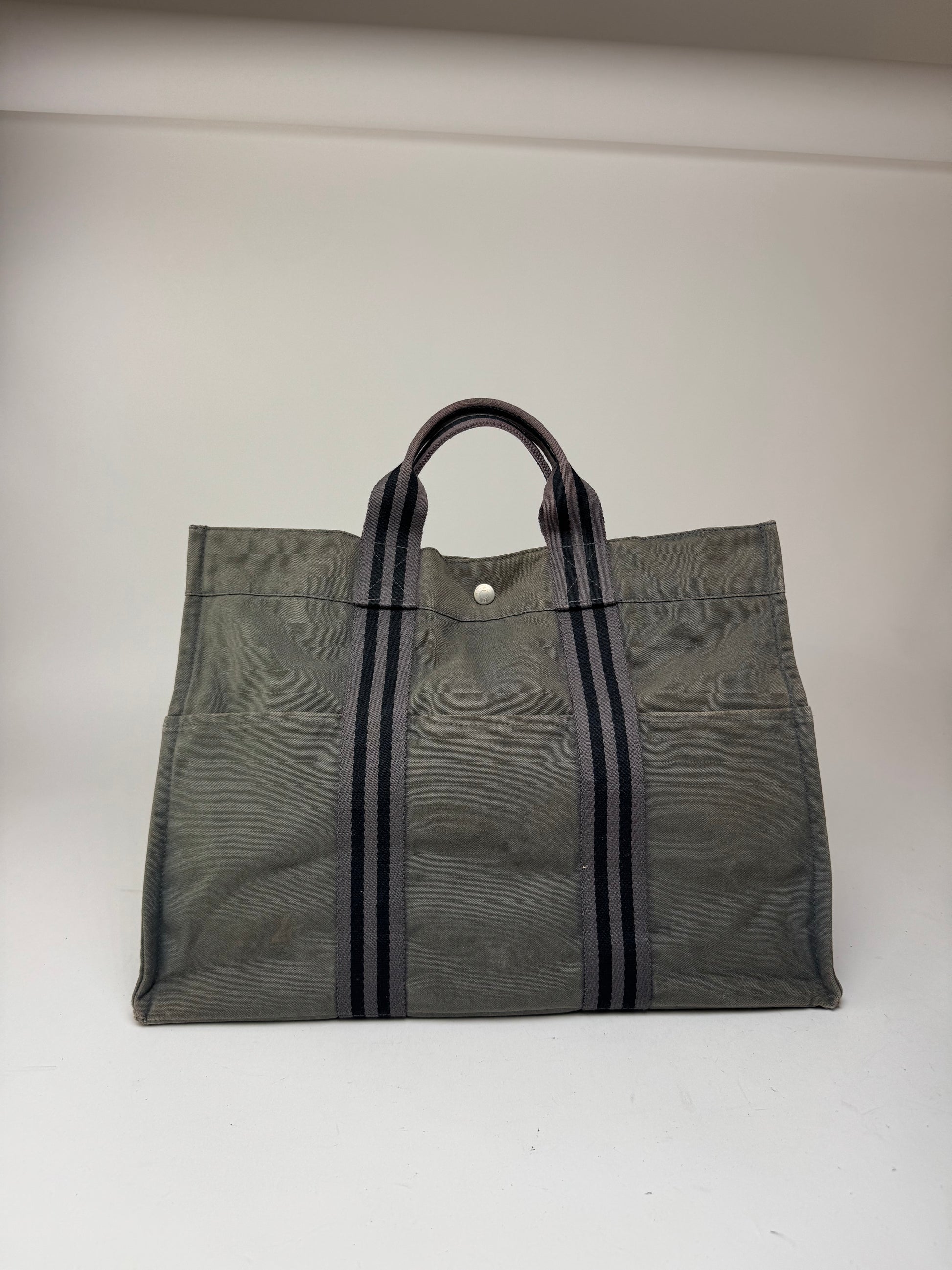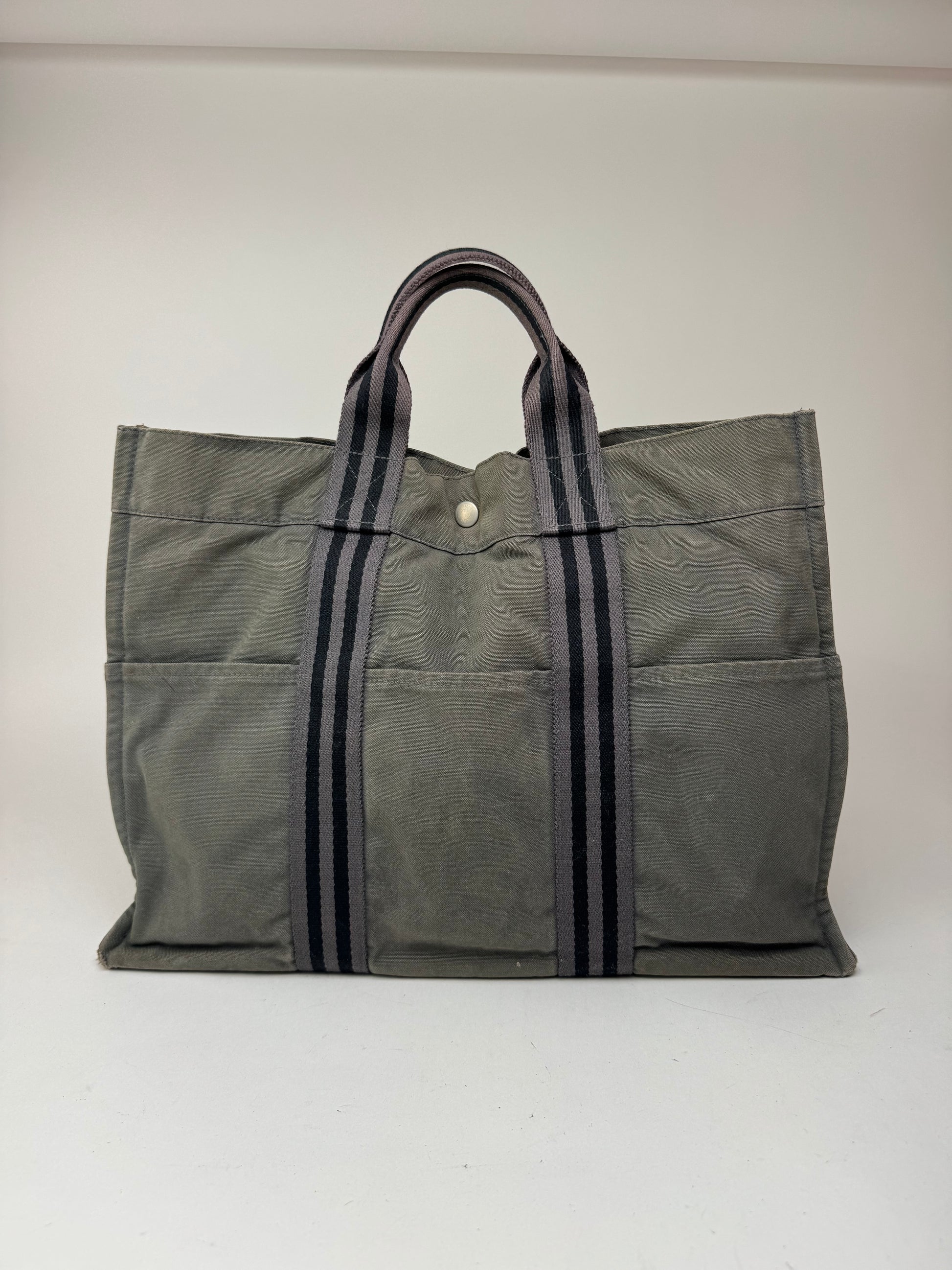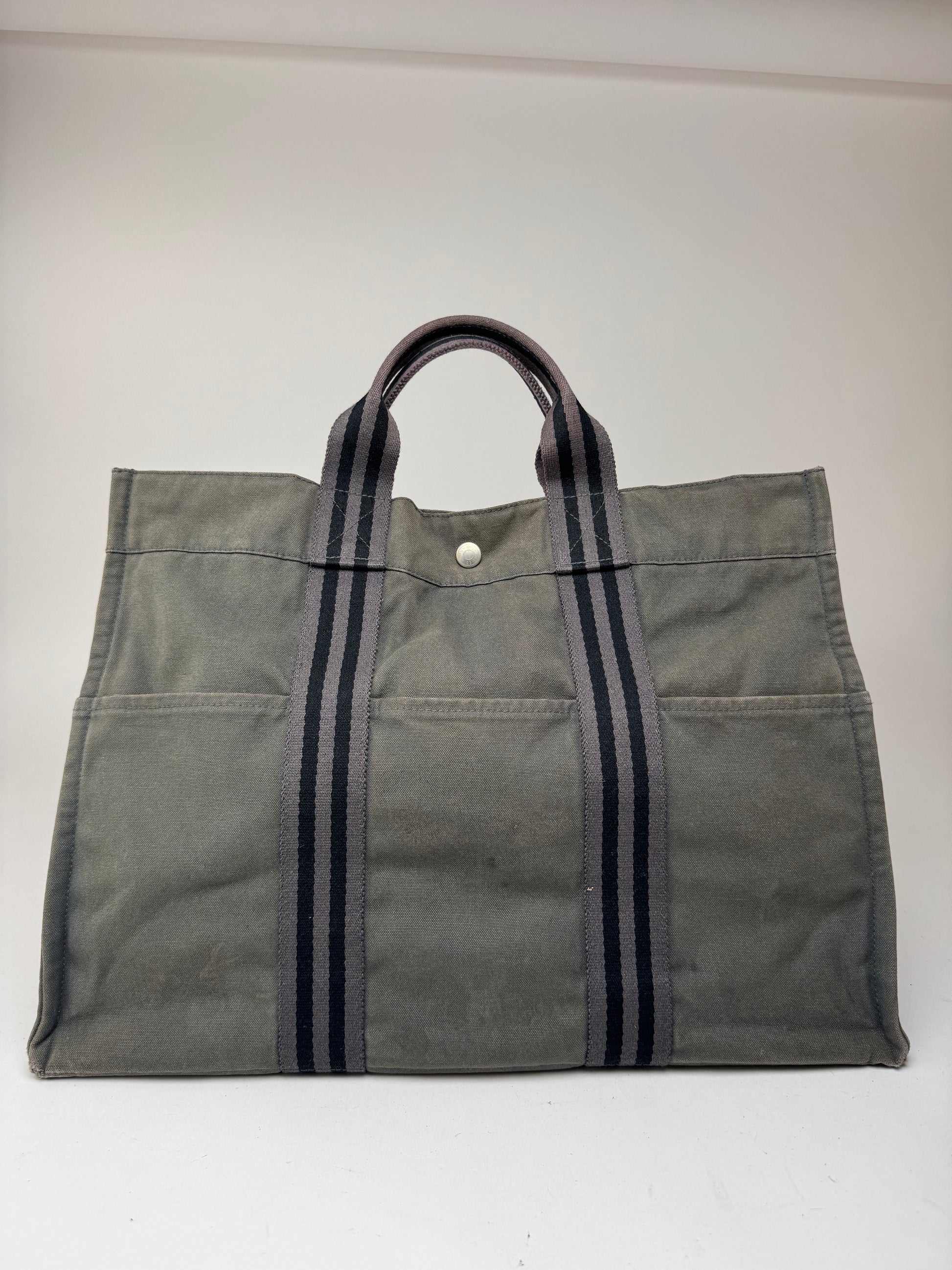 HERMÈS Vintage Tote Bag. This classic vintage tote is crafted of grey 100% canvas with black, brown, and grey striped handles. The design features silver-tone steel hardware, with two snap closures on the sides and one in the centre. Made in France.