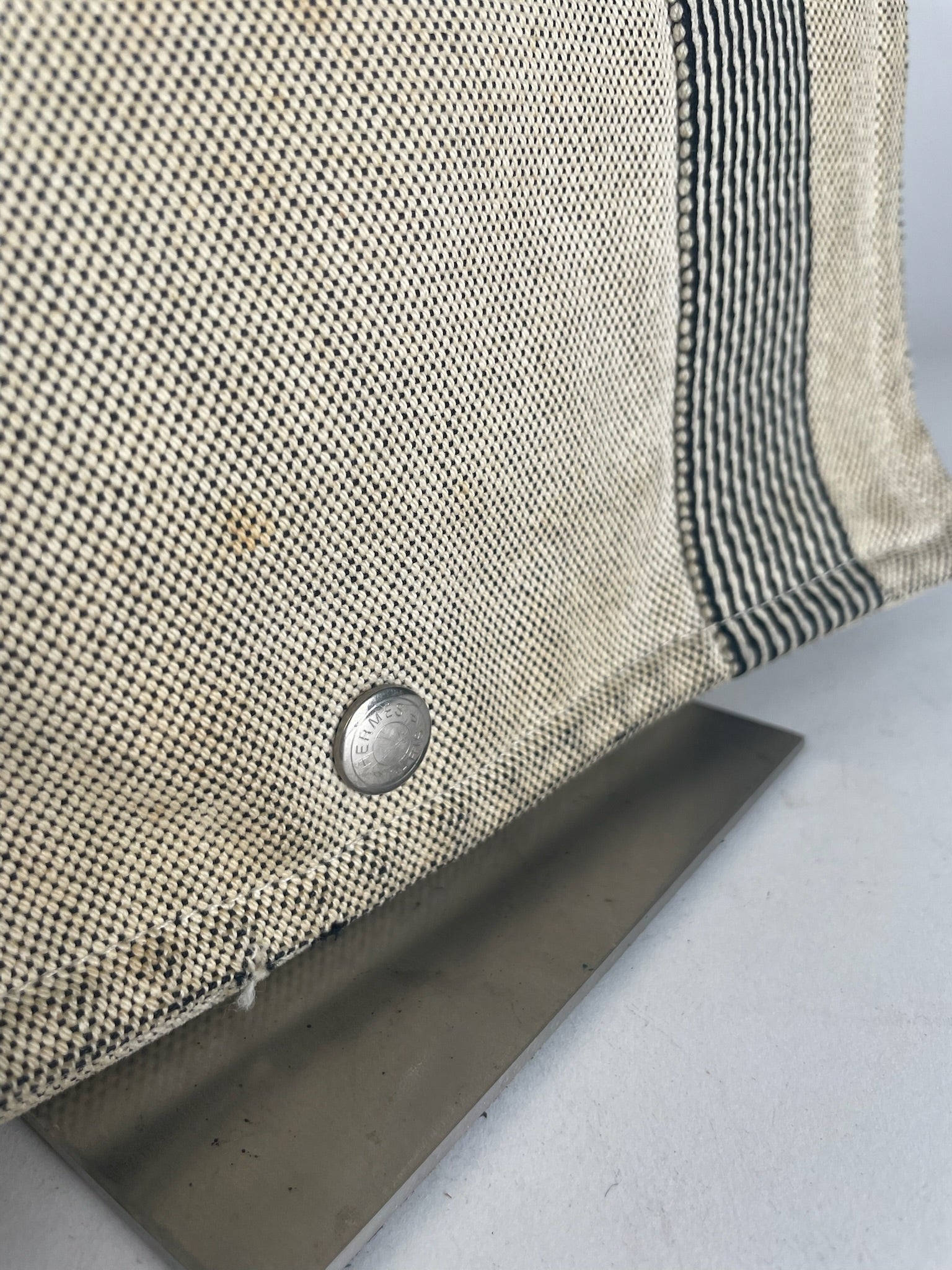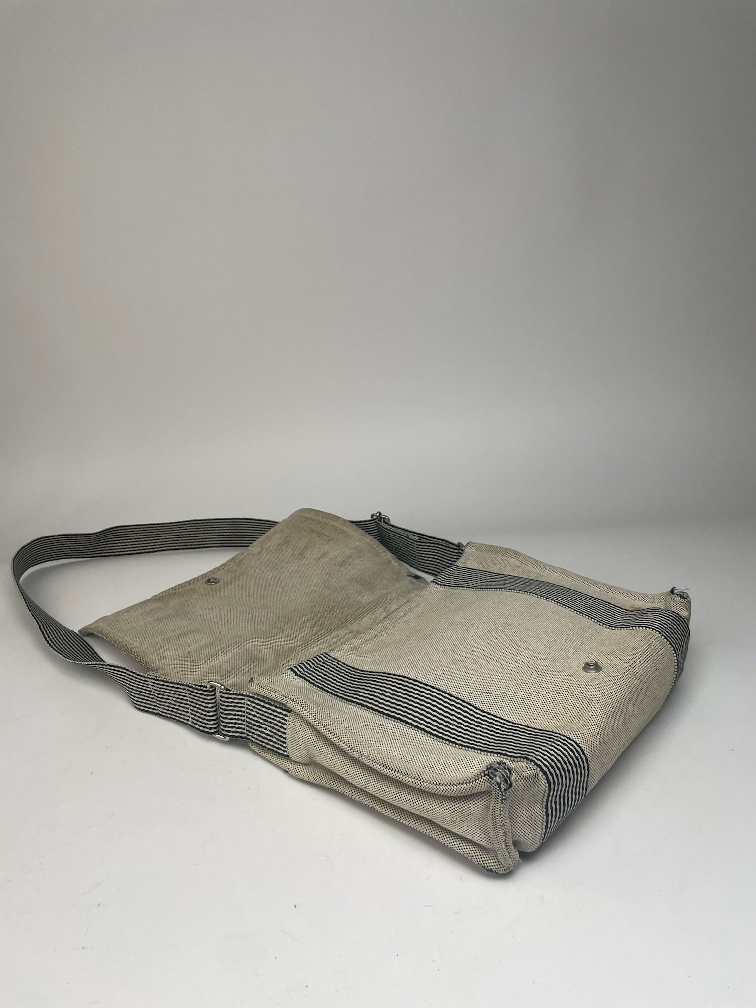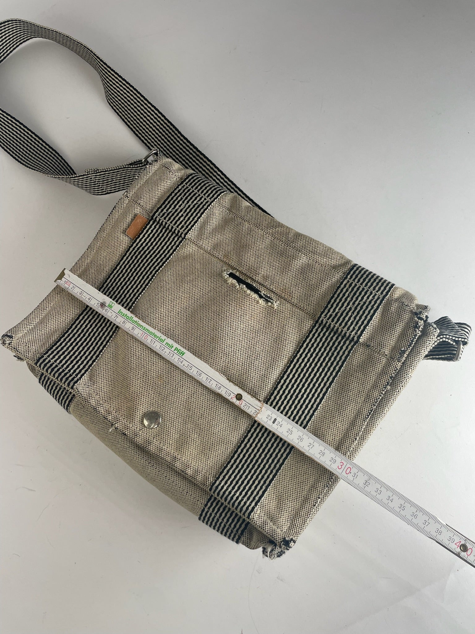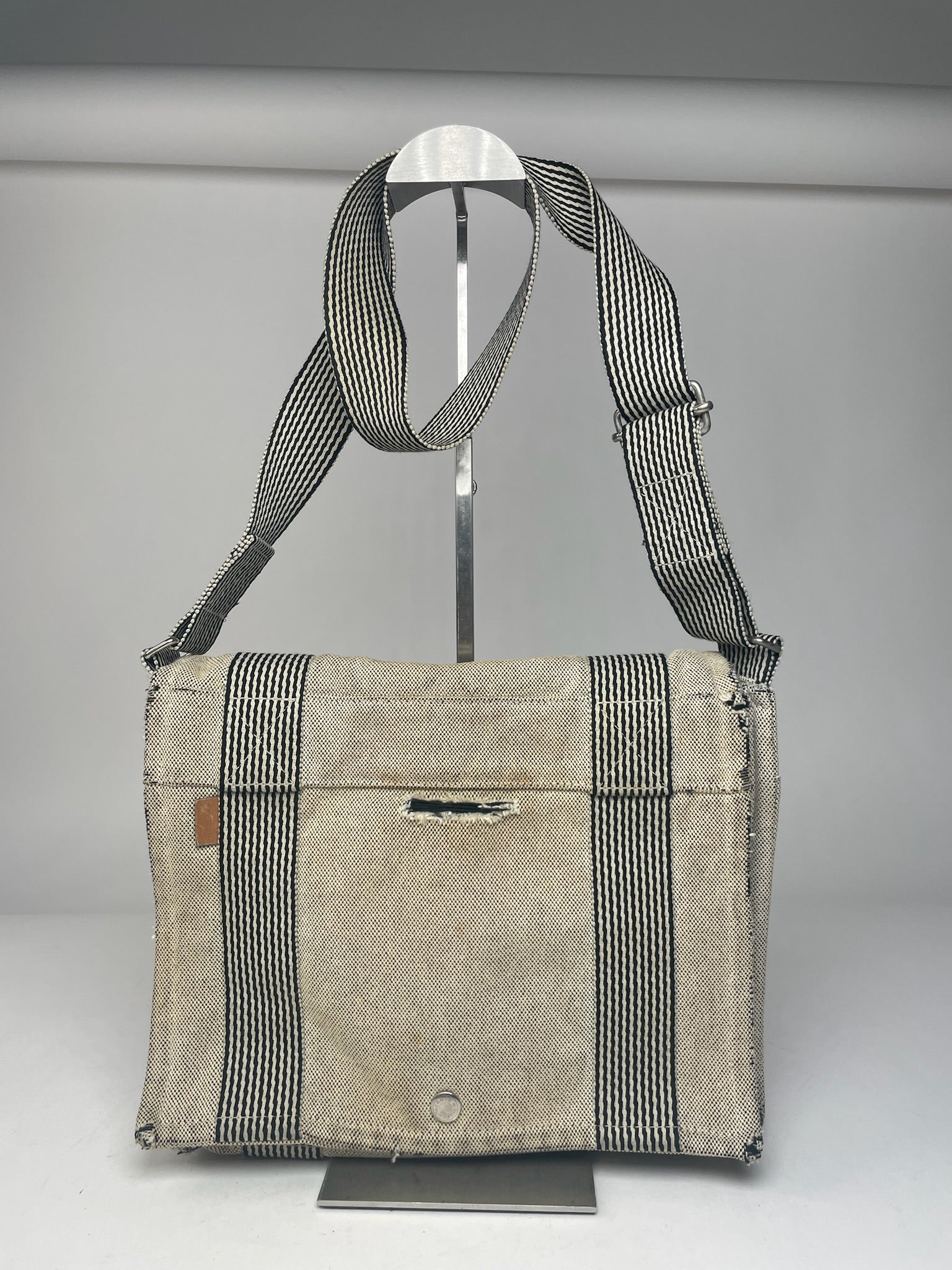 This stylish vintage shoulder bag by Hermès is crafted from beige canvas with black stripes, offering a timeless and versatile design. The bag is unisex and made in France. It is in very good condition, with some material damage and stains, but overall remains in excellent shape. The silver hardware is made of steel, and the adjustable strap allows for customizable length.