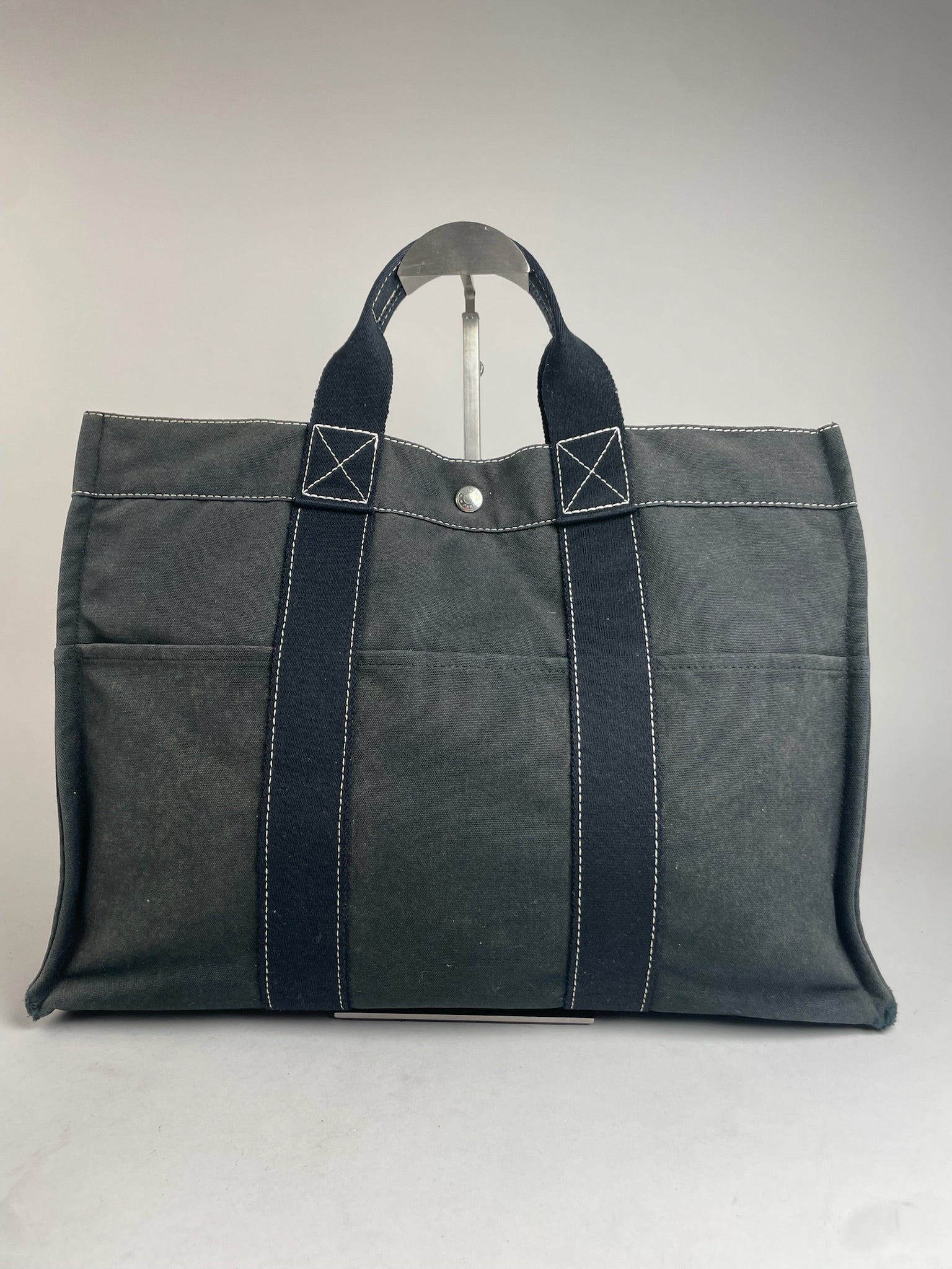 HERMÈS Vintage Tote Bag. This refined vintage tote bag is crafted from 100% cotton in a classic navy colourway and features matching navy handles with contrasting white stitching. Designed with a top snap button closure and additional snap buttons on the sides, it reflects Hermès’ timeless craftsmanship and functional elegance.
