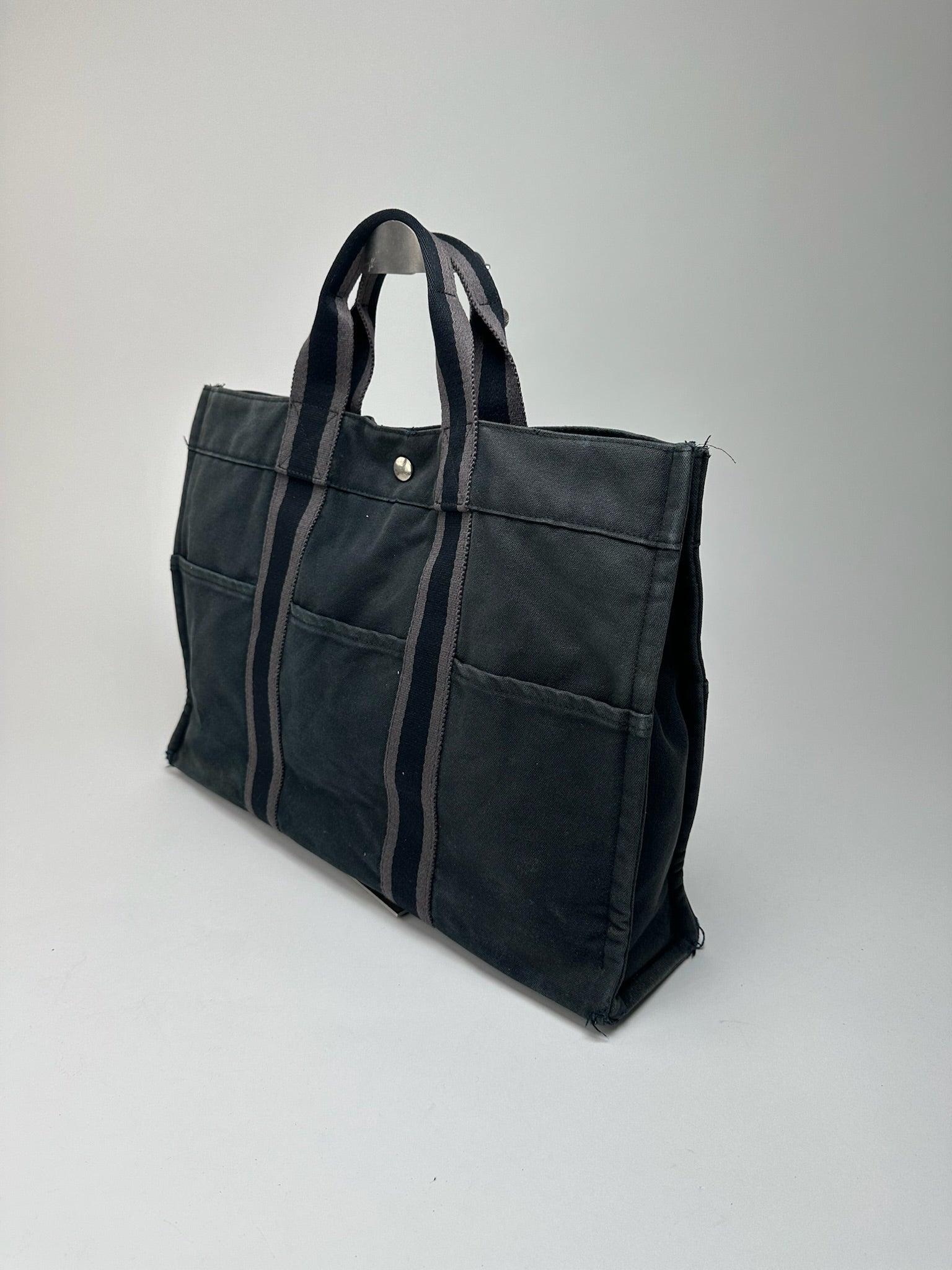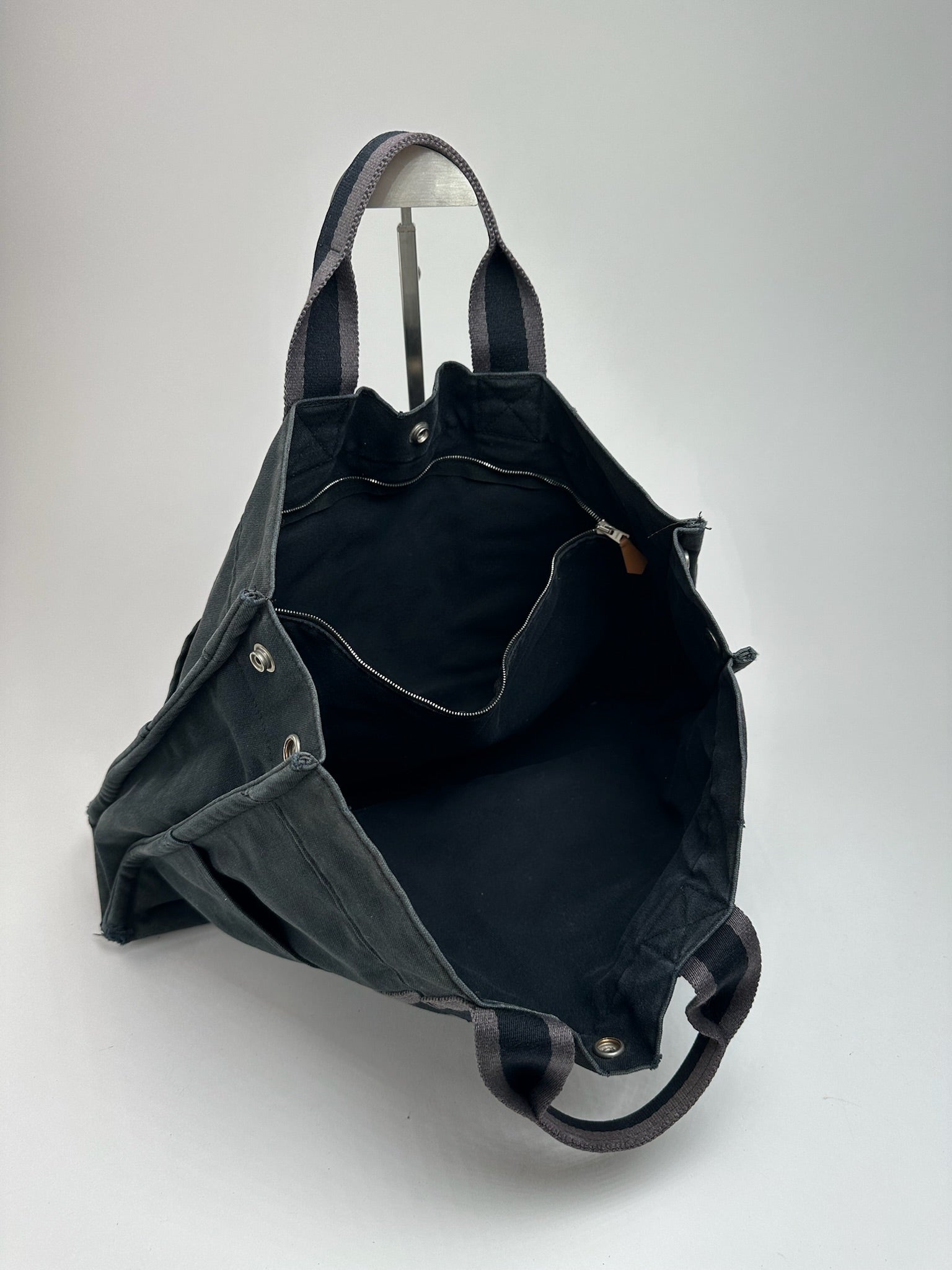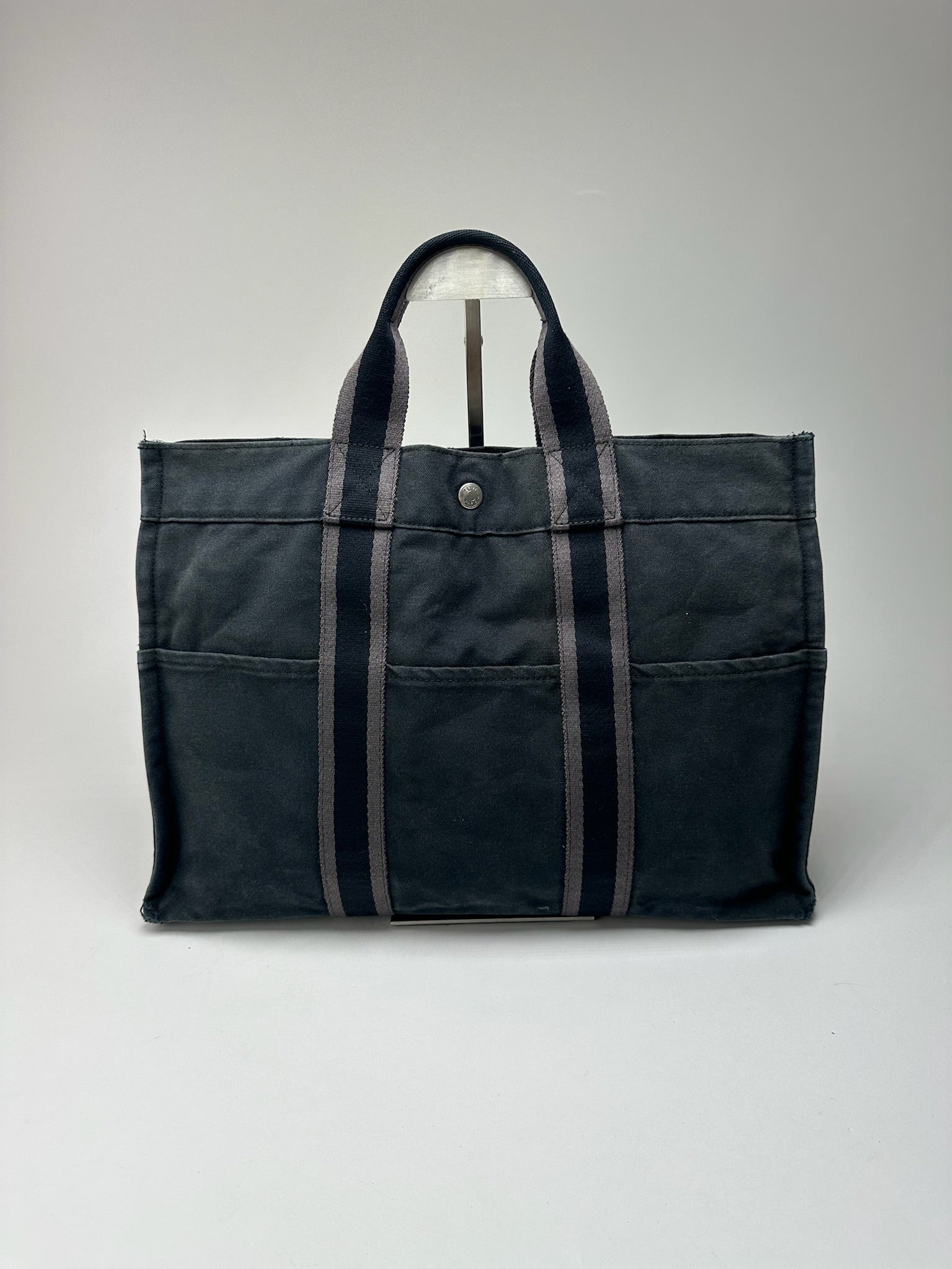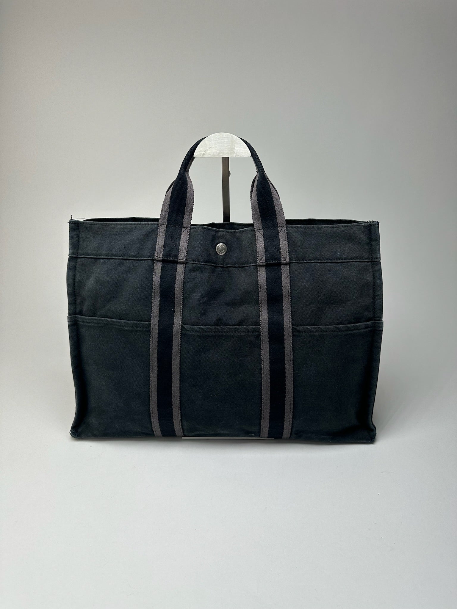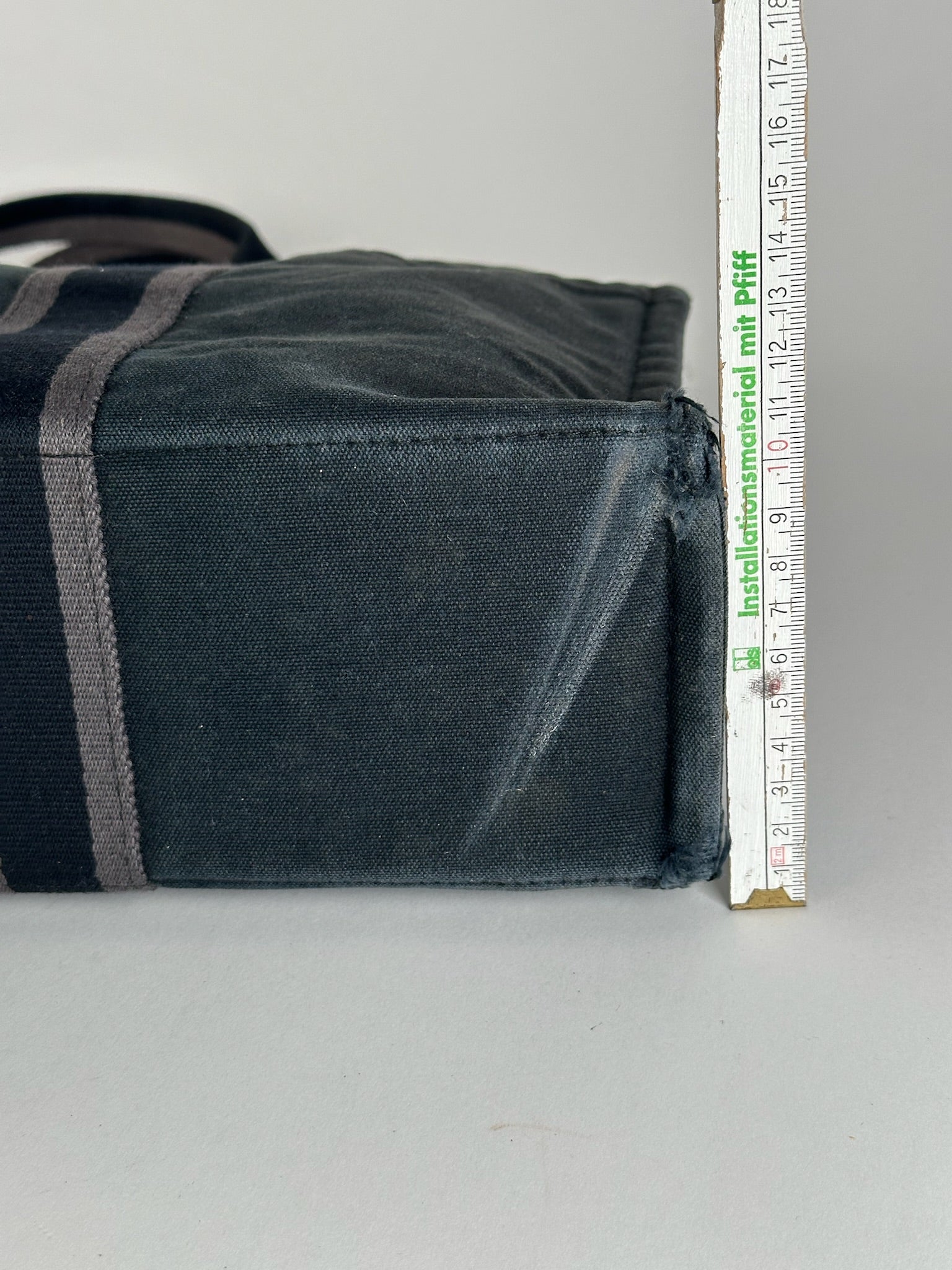 HERMÈS Vintage Cotton Handbag. This chic handbag is finely crafted of black 100% cotton fabric with grey and black striped handles. It features silver-tone steel hardware and a snap button closure.