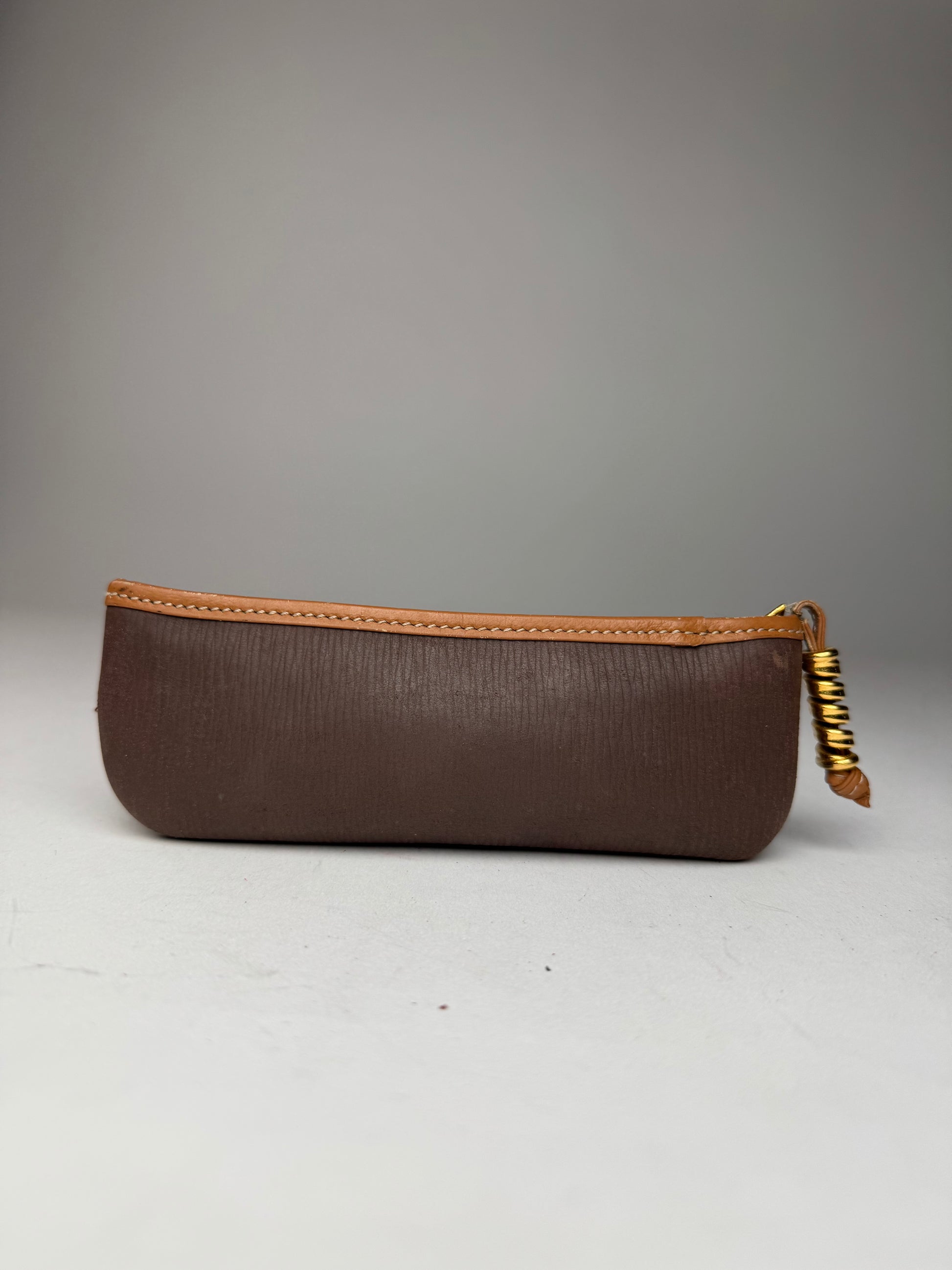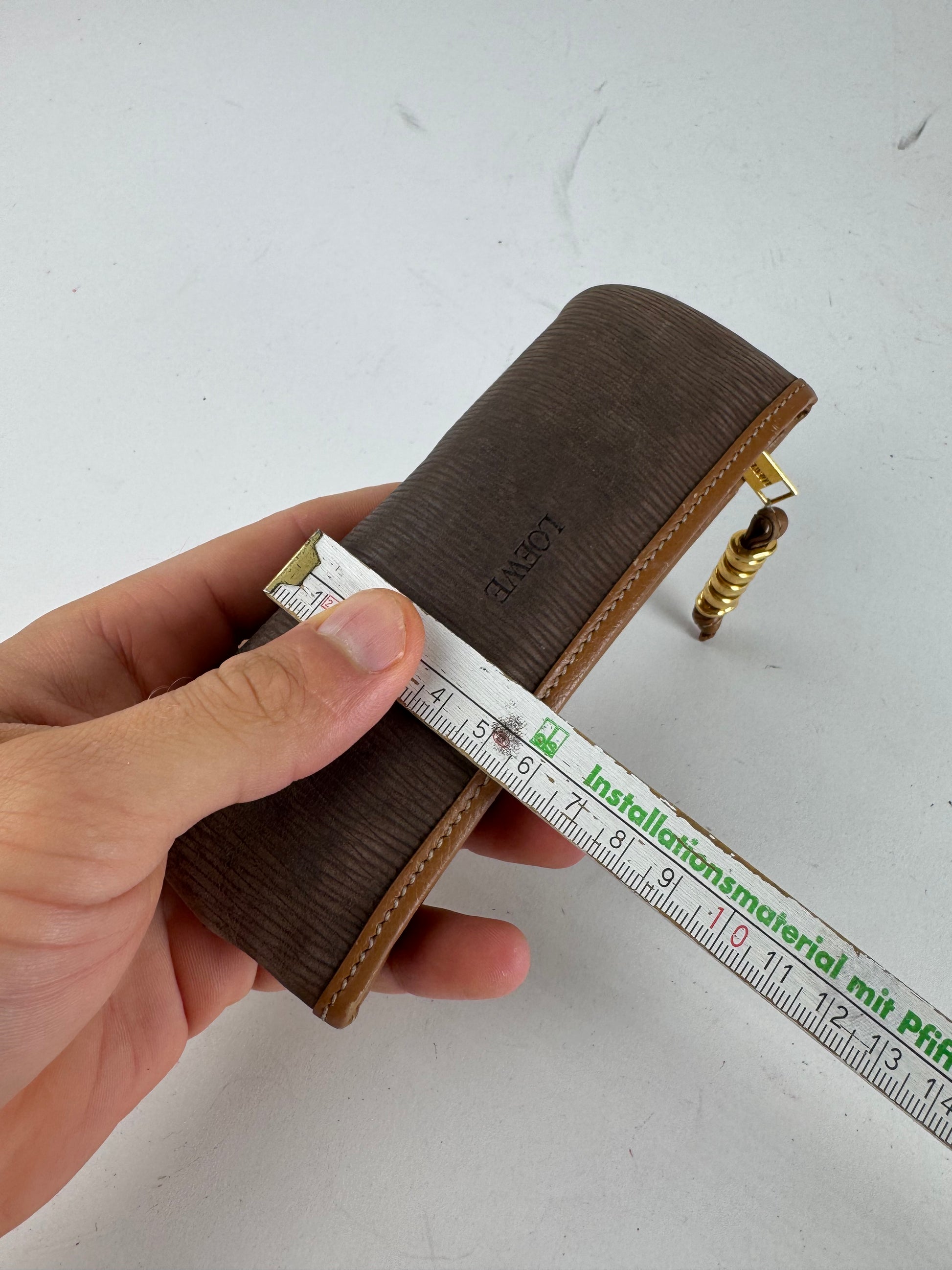 This vintage purse is finely crafted of ribbed brown leather with beige-brown leather details. It features golden steel hardware and a top zipper closure. The interior is lined with brown canvas decorated with colorful stripes and orange Loewe logos. Made in Spain, this piece reflects Loewe’s long-standing heritage of Spanish craftsmanship and luxury leatherwork.