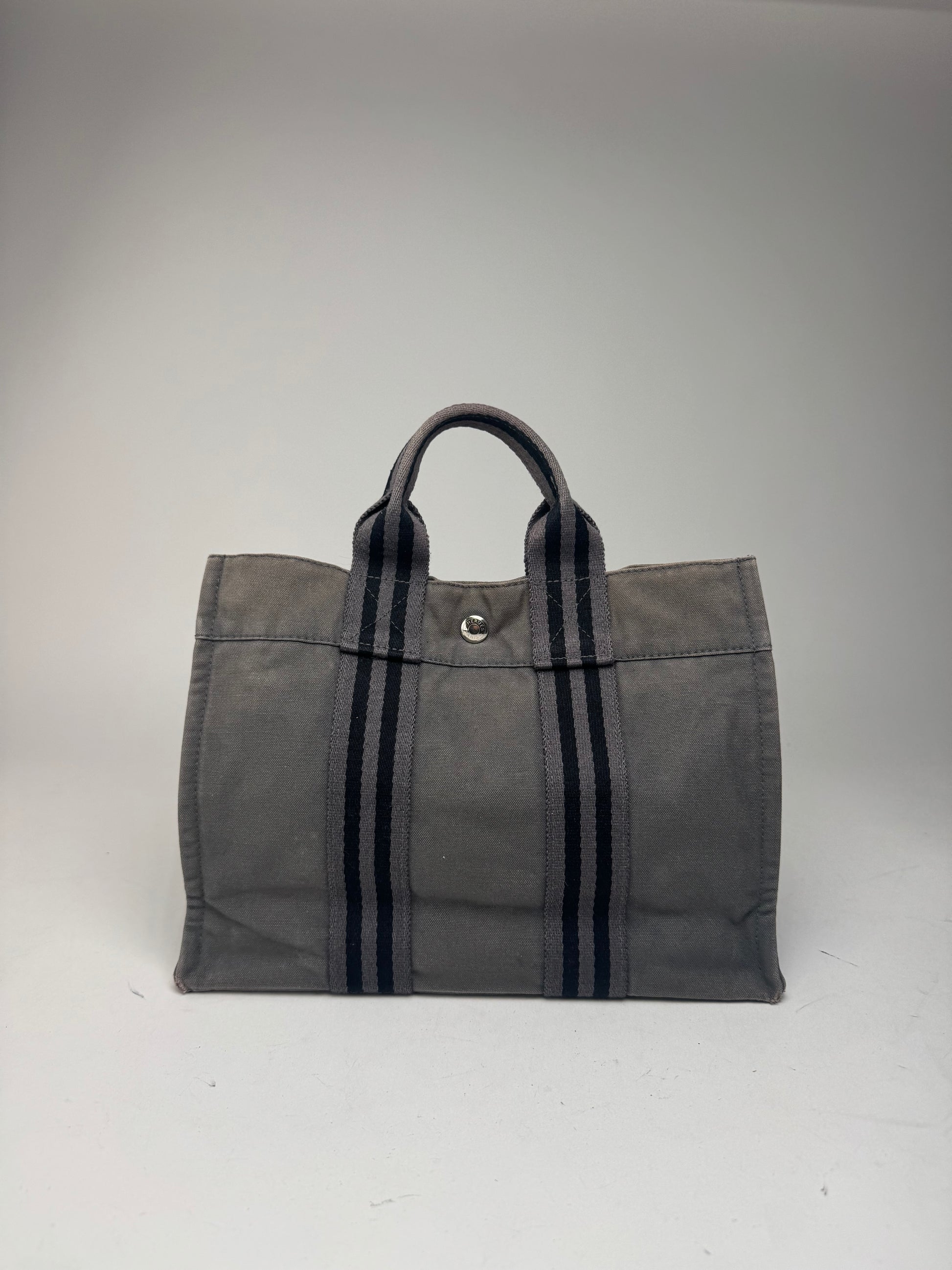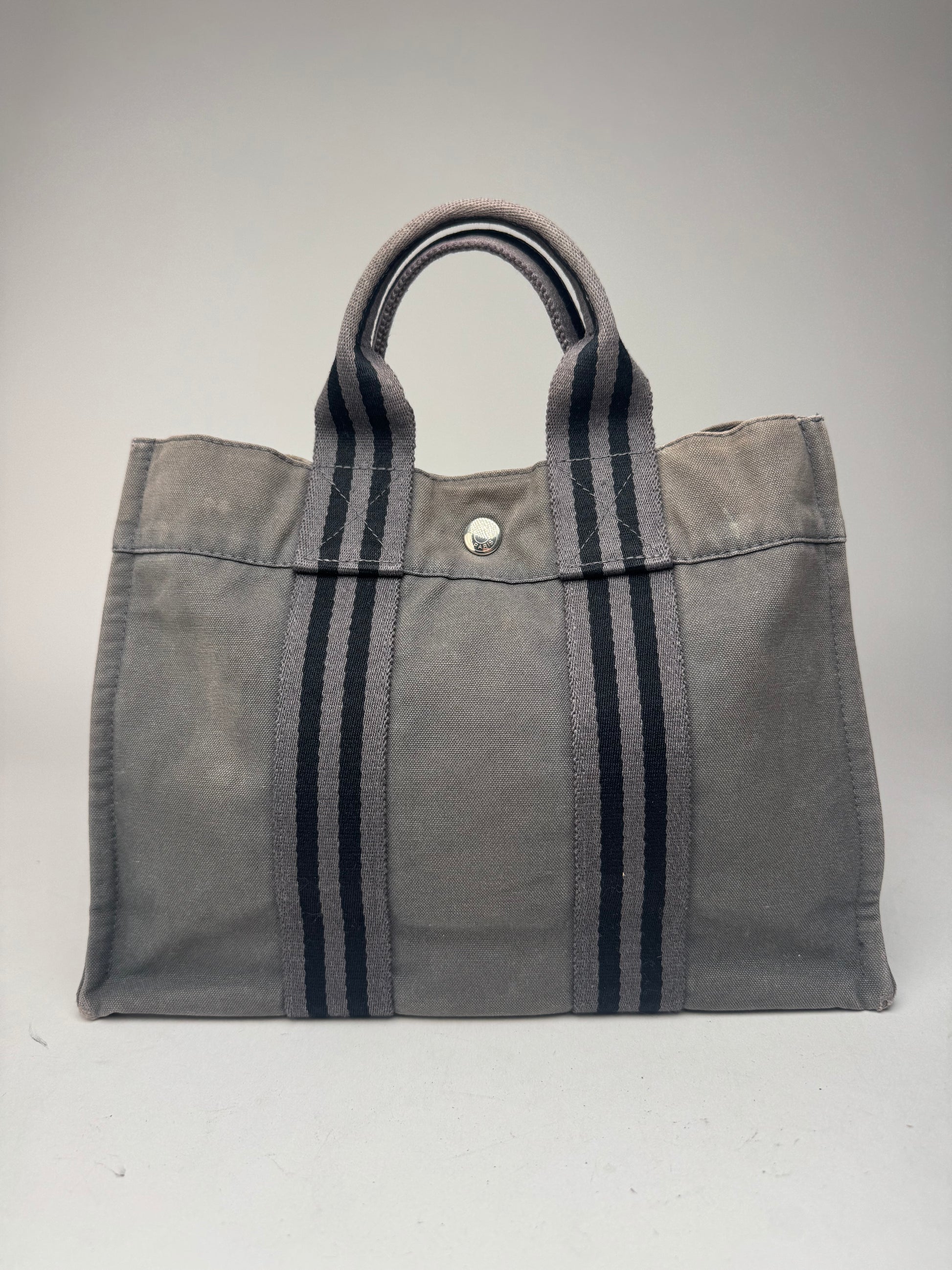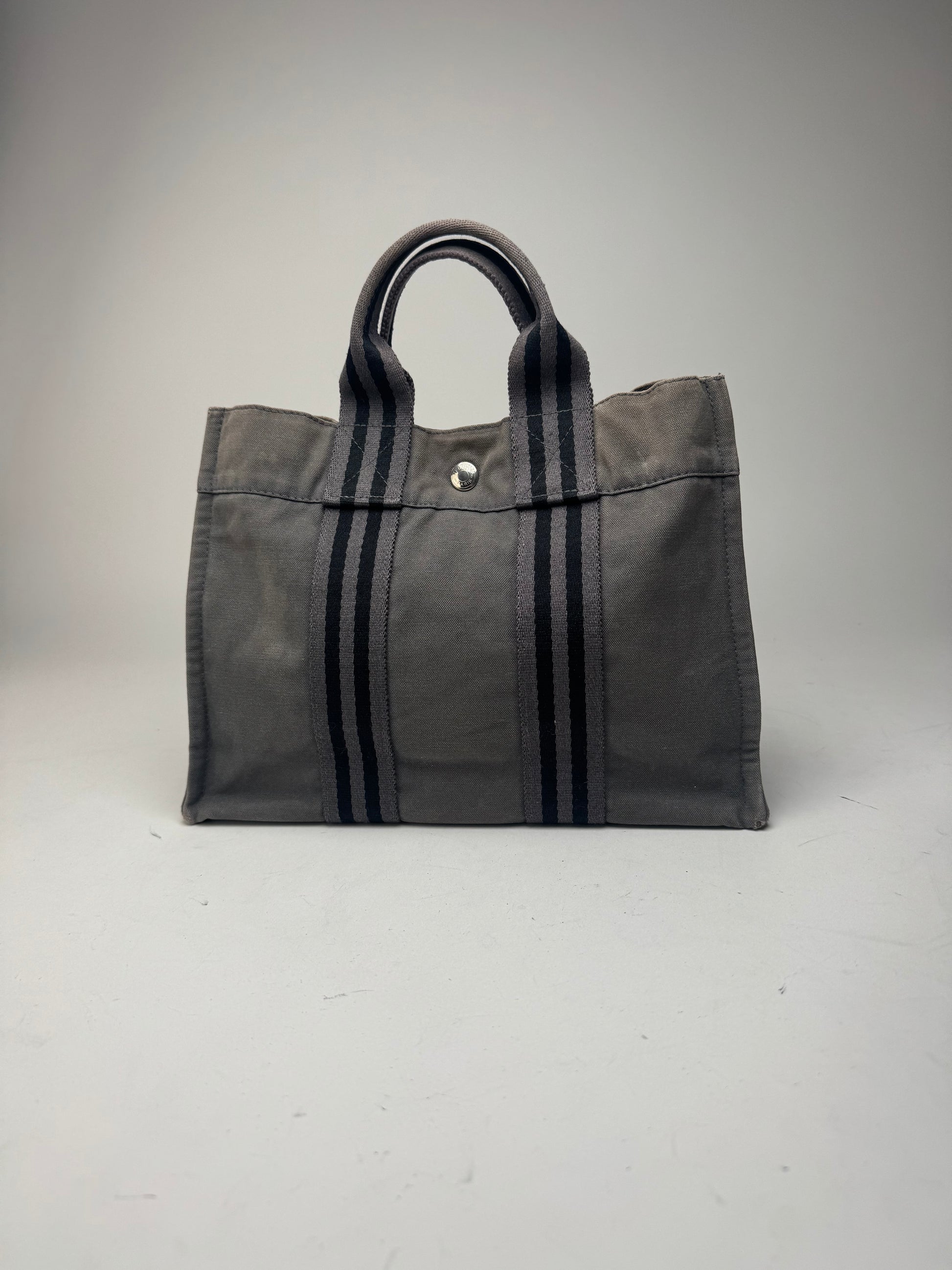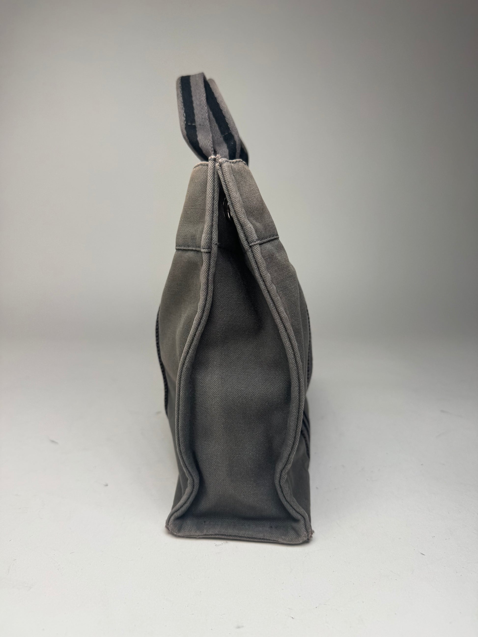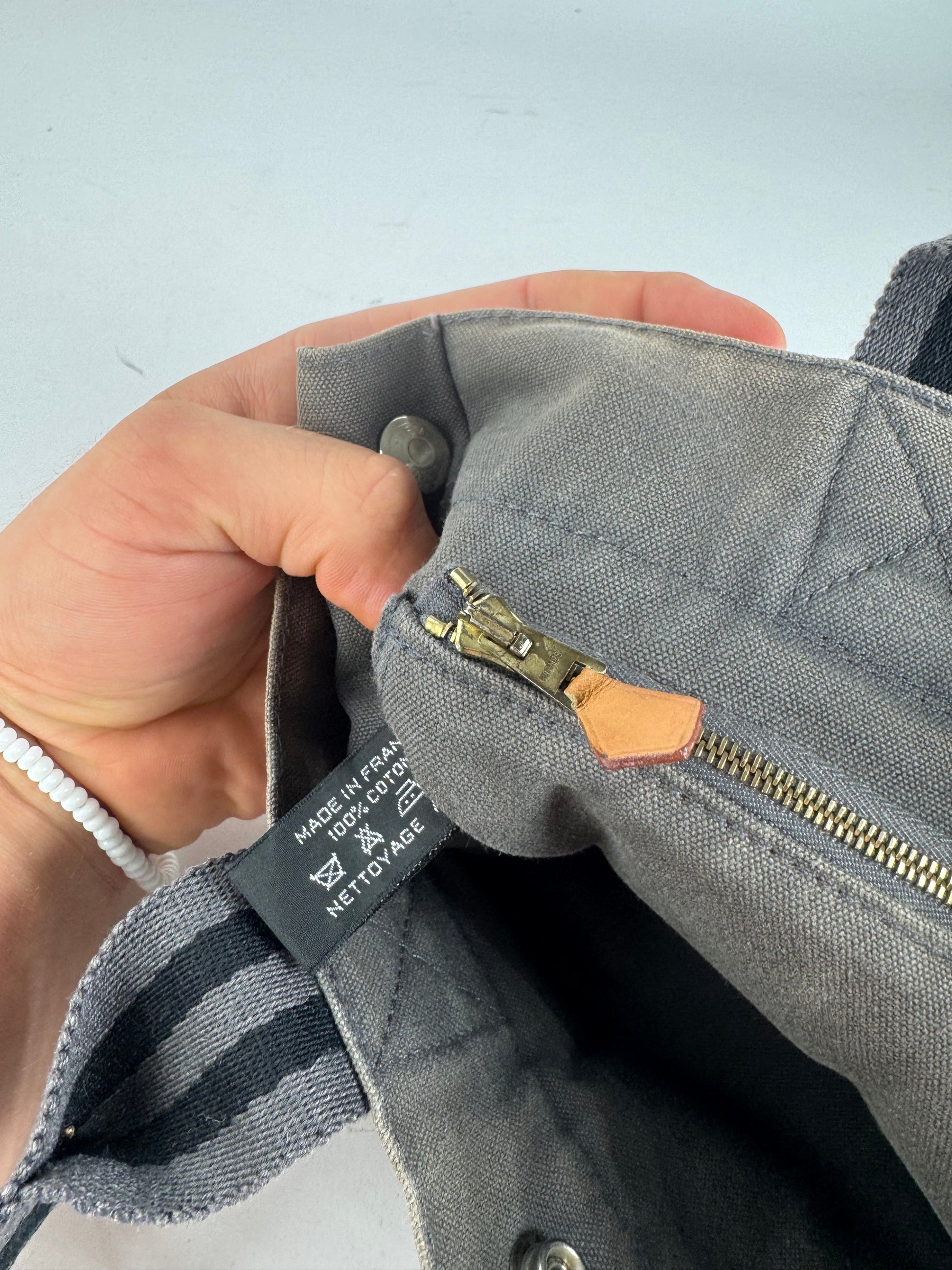 This chic tote is finely crafted of grey 100% cotton canvas. The bag features grey and black striped handles, silver-tone steel hardware, snap button closures on each side, and a central snap button at the top. The tote is made in France.