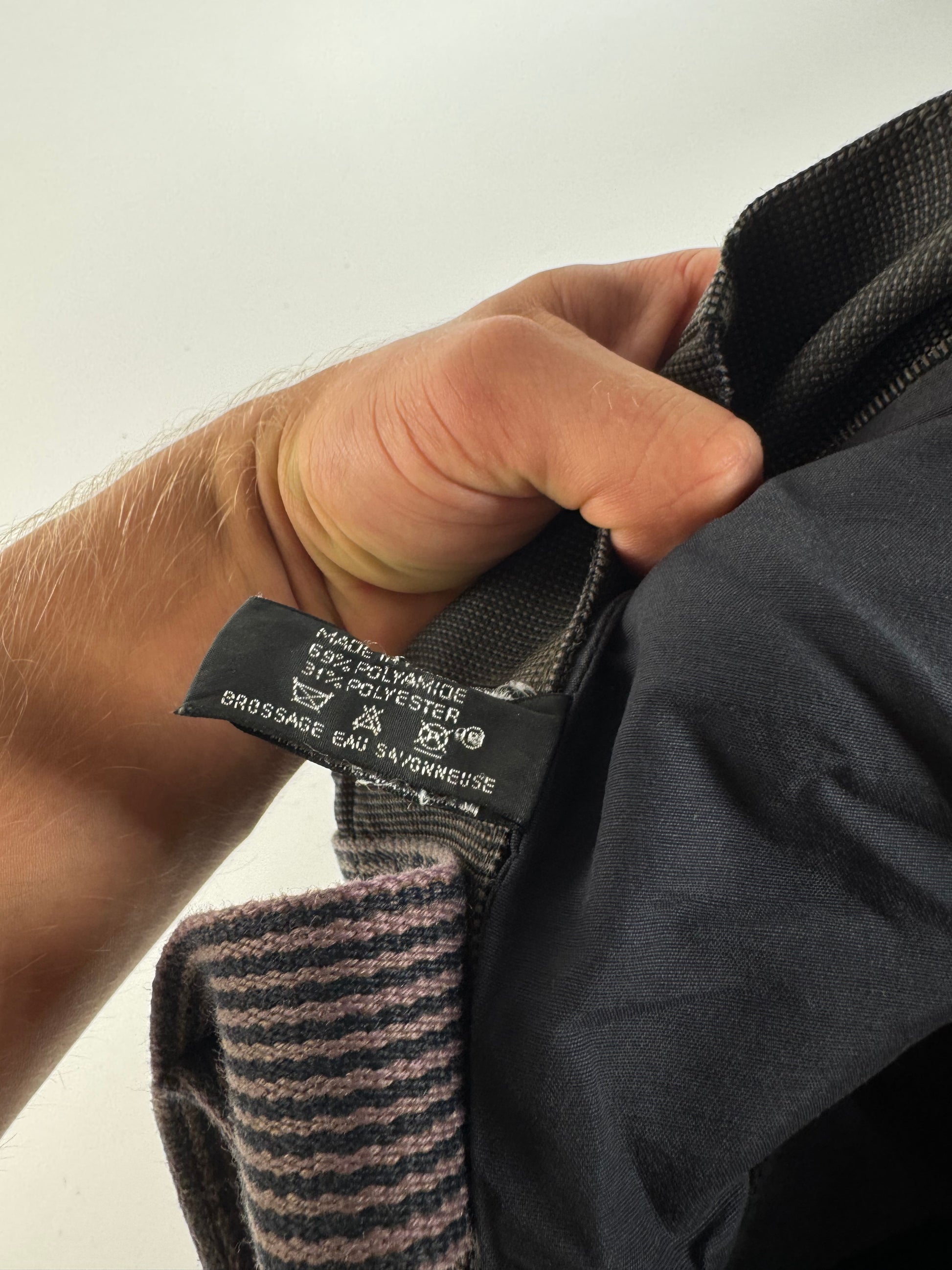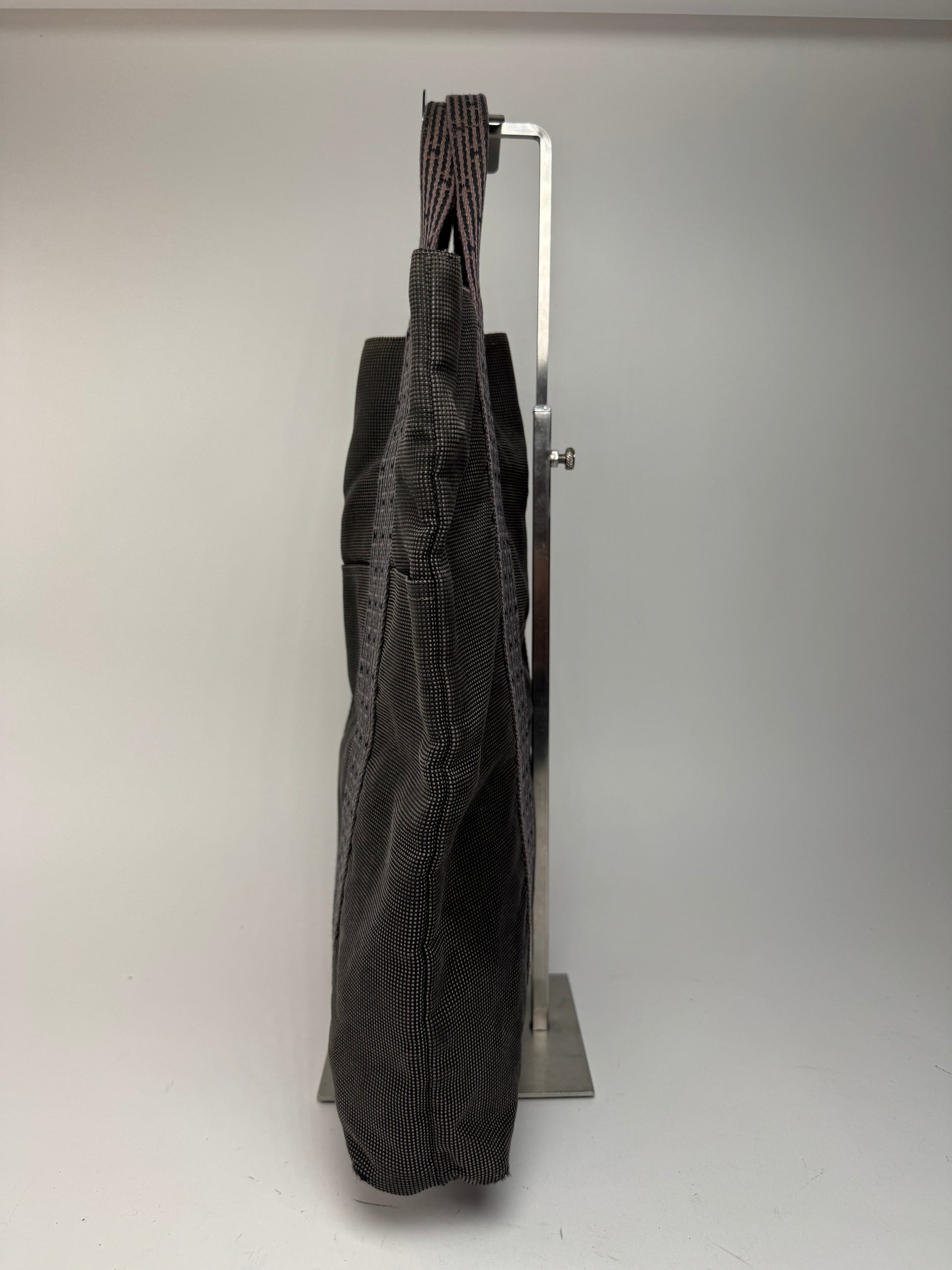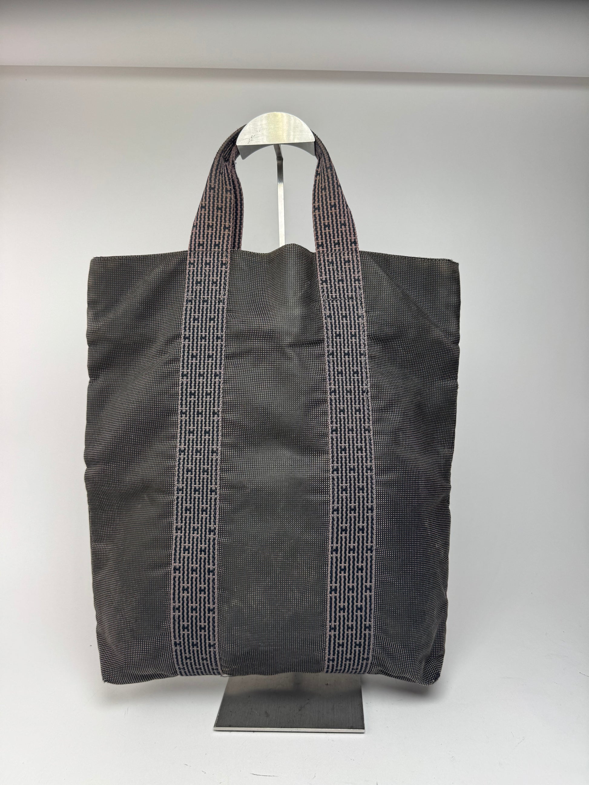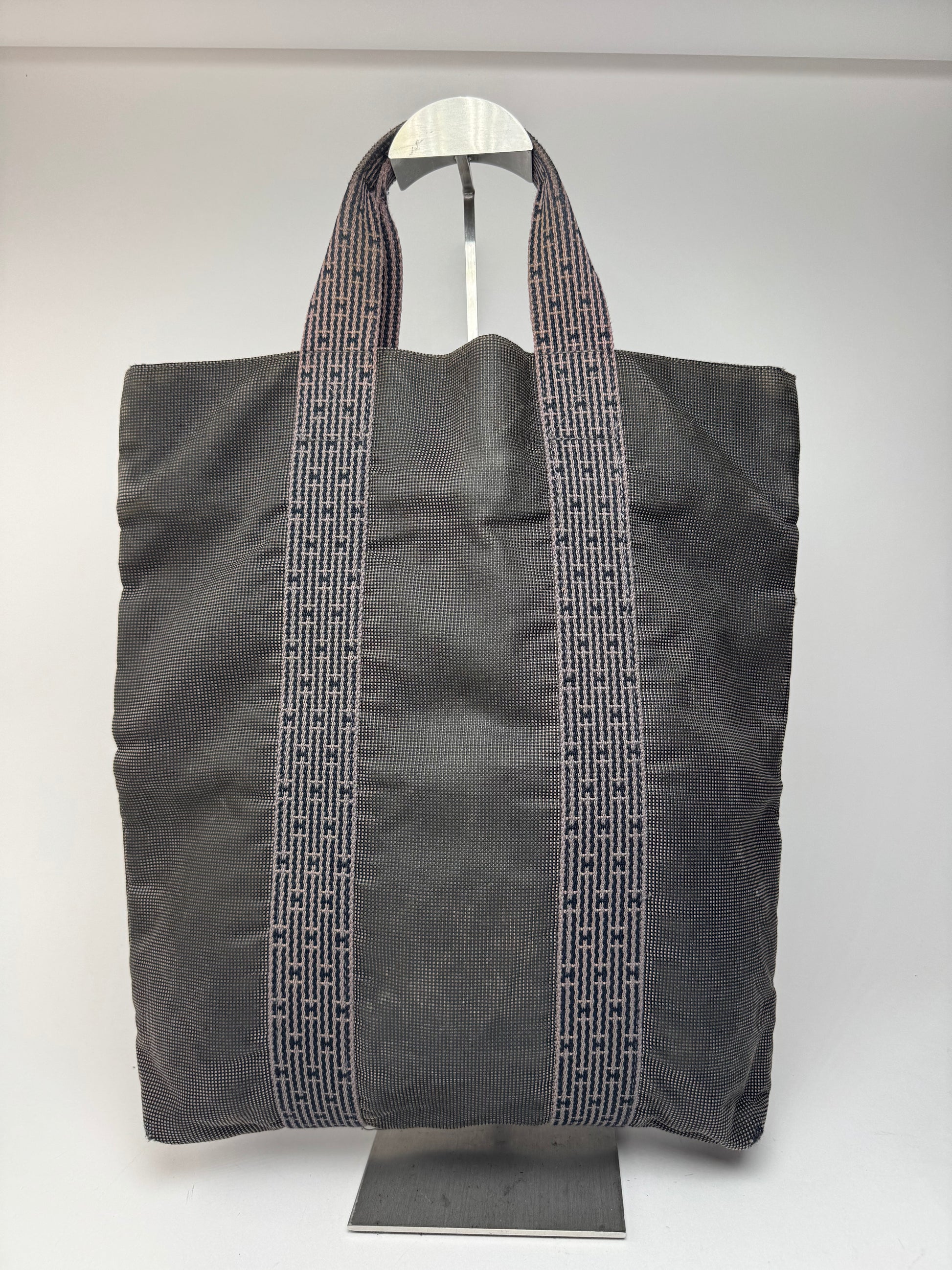 HERMÈS Vintage Shopper Bag. This chic handbag is finely crafted of anthracite patterned polyester fabric. The shoulder bag features silver-tone steel hardware.