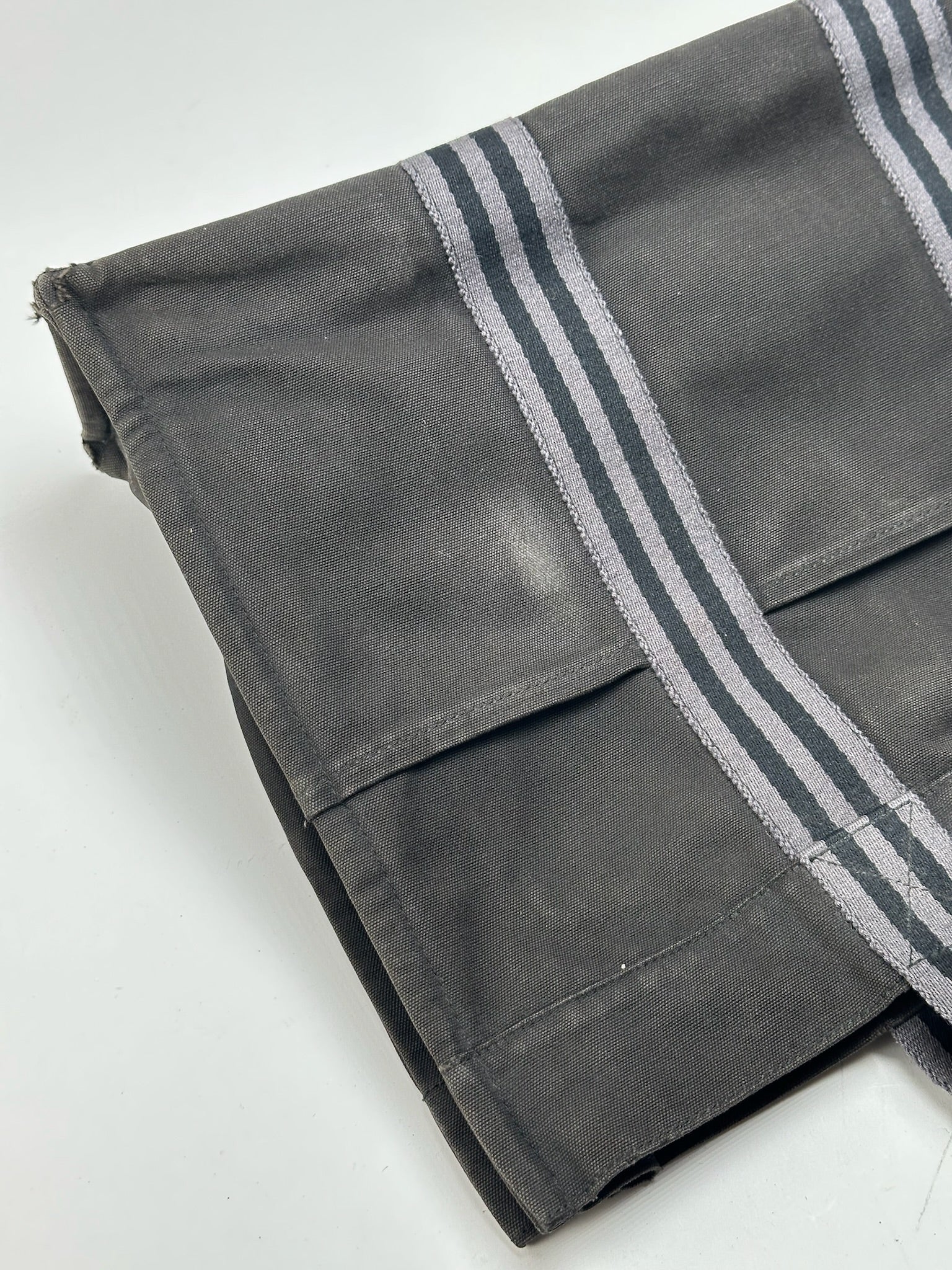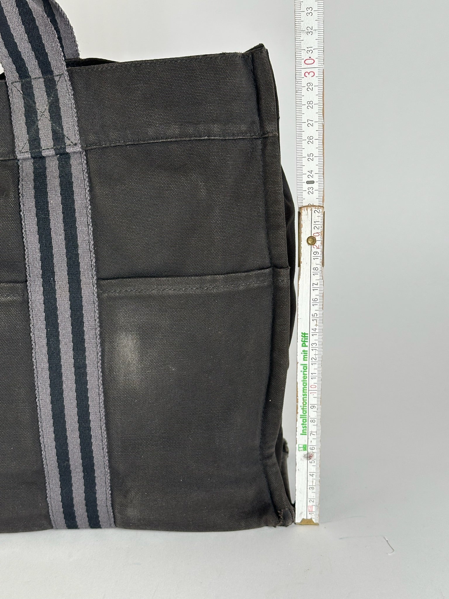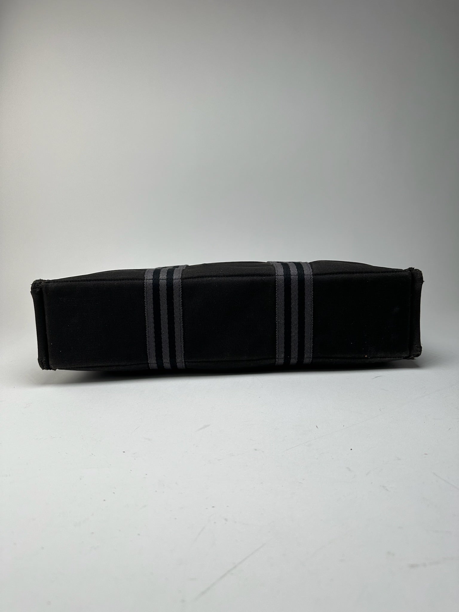 HERMÈS Vintage Black Canvas Handbag. This casual-chic vintage handbag is crafted from 100% black canvas and features signature black and grey striped top handles. The hardware is silver-tone steel. Made in France, this piece blends timeless functionality with understated elegance.