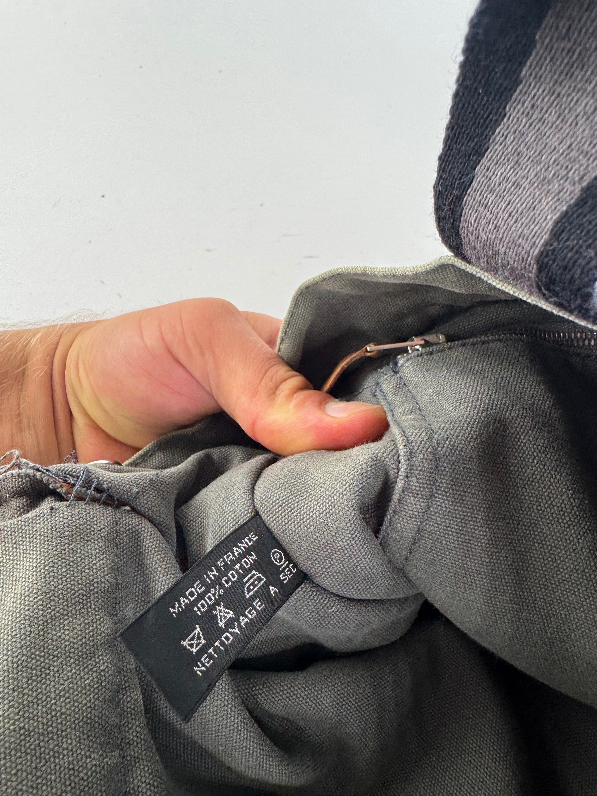 HERMÈS Vintage Canvas Shopper. This timeless shopper bag is finely crafted of 100% grey canvas. It features grey and black striped handles and silver-tone steel hardware for a clean, classic look.