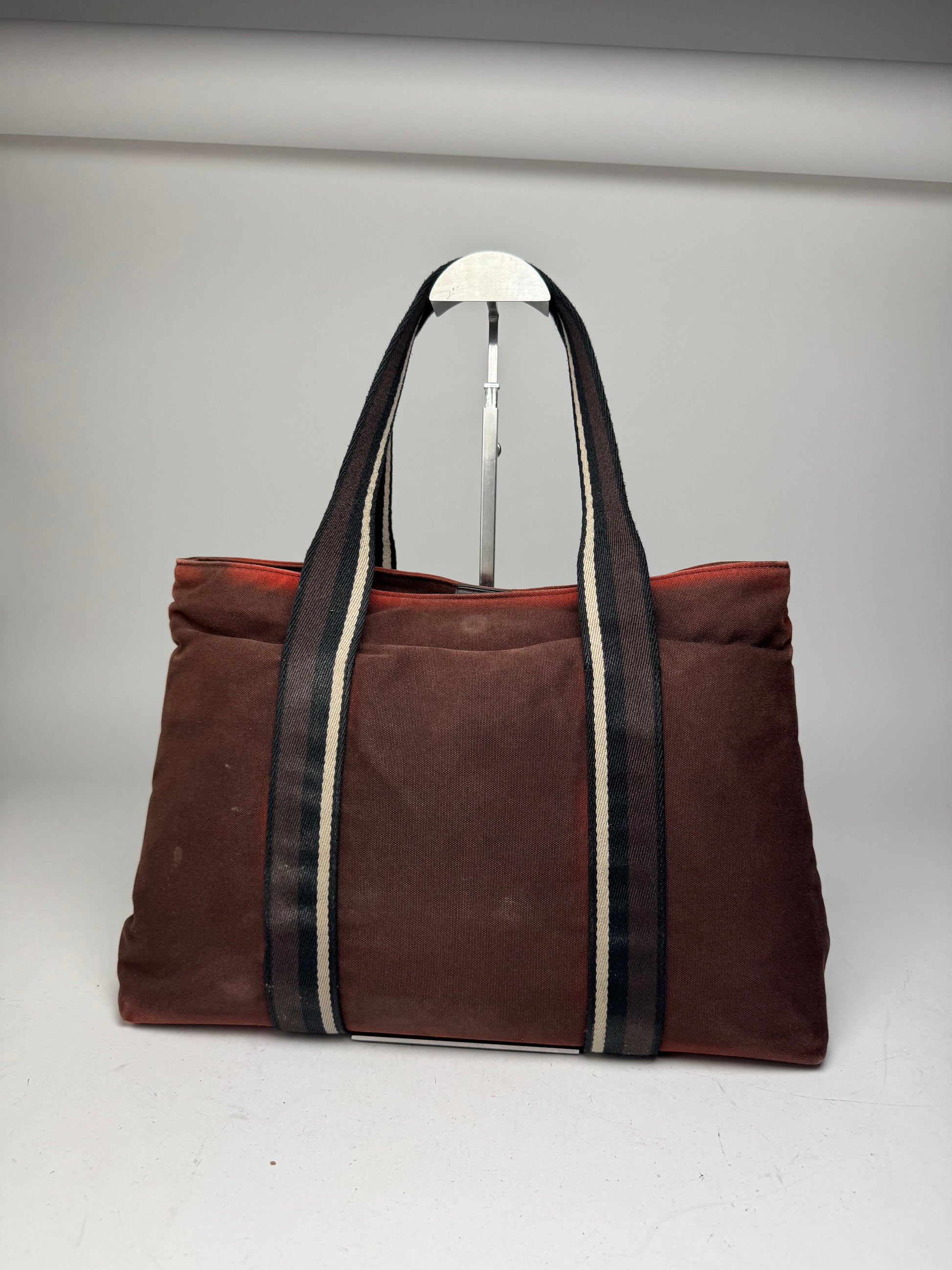 This vintage Hermès Troca bag is crafted in red-orange canvas with brown, black, and white striped handles and brown leather trim. The interior is lined in red-brown leather. Introduced as part of Hermès’ casual-chic canvas line, the Troca blends sporty functionality with refined equestrian-inspired detailing — a classic everyday silhouette with understated heritage appeal.