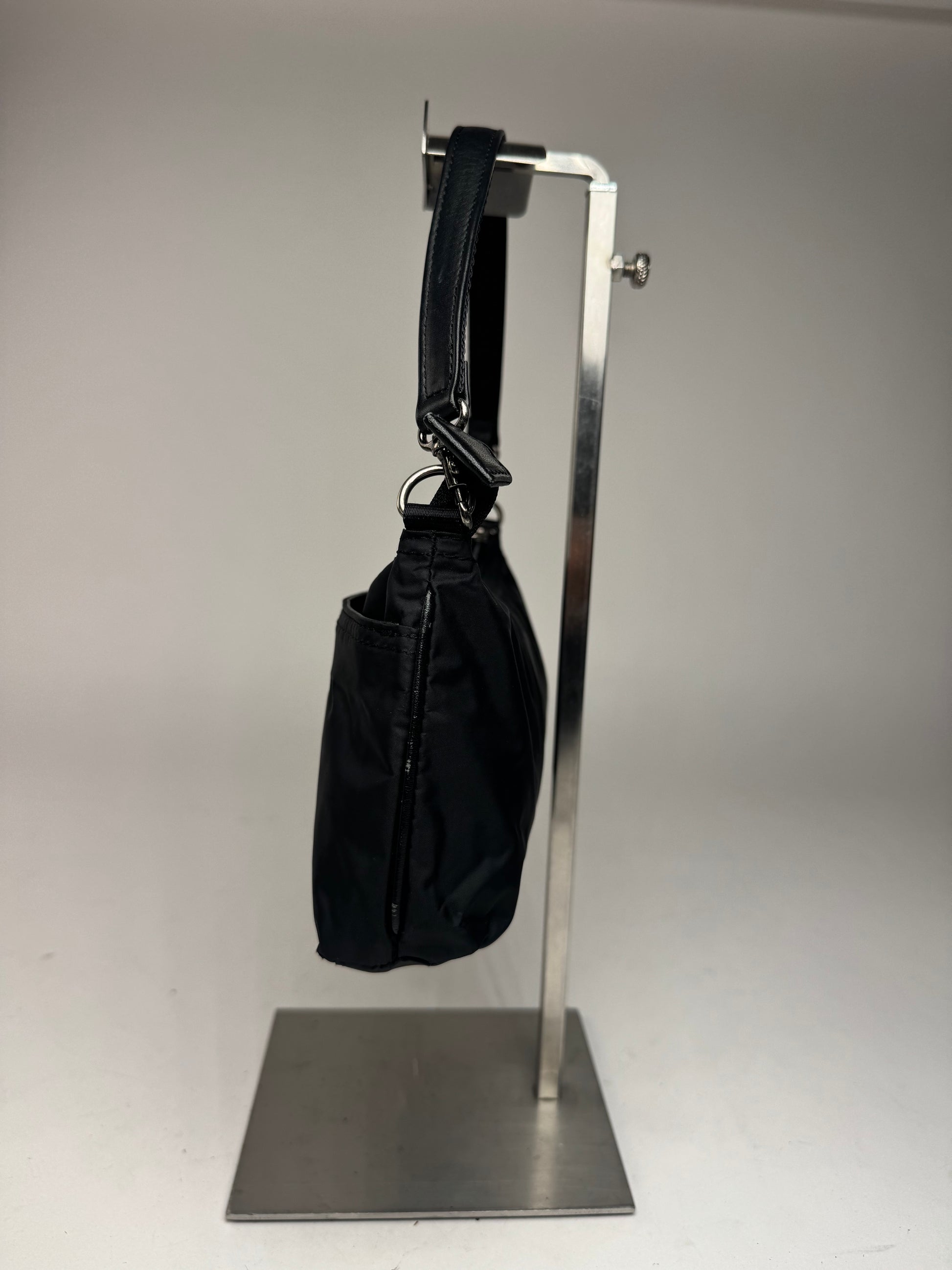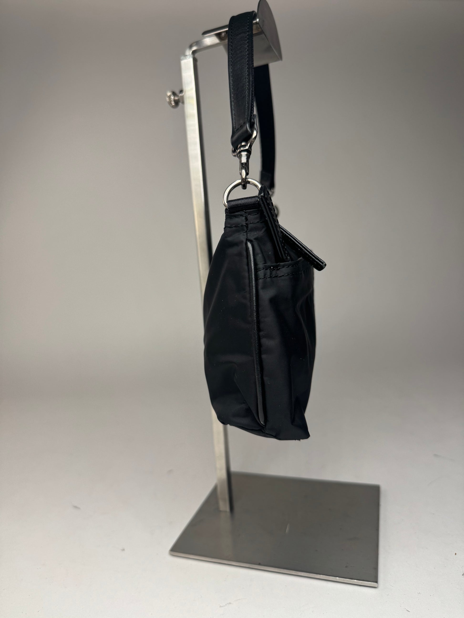 This chic baguette handbag is finely crafted of black canvas with black leather trim and strap. The bag features a short leather shoulder strap, silver-tone steel hardware, a top zipper closure, and an additional front zipper pocket. The interior is lined with black canvas. Made in Japan.