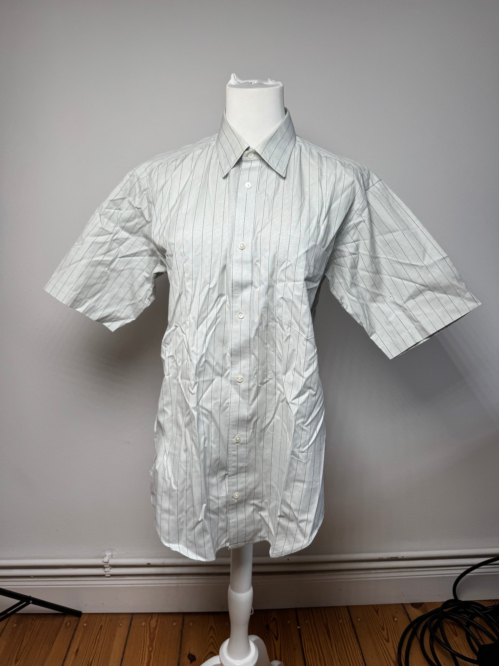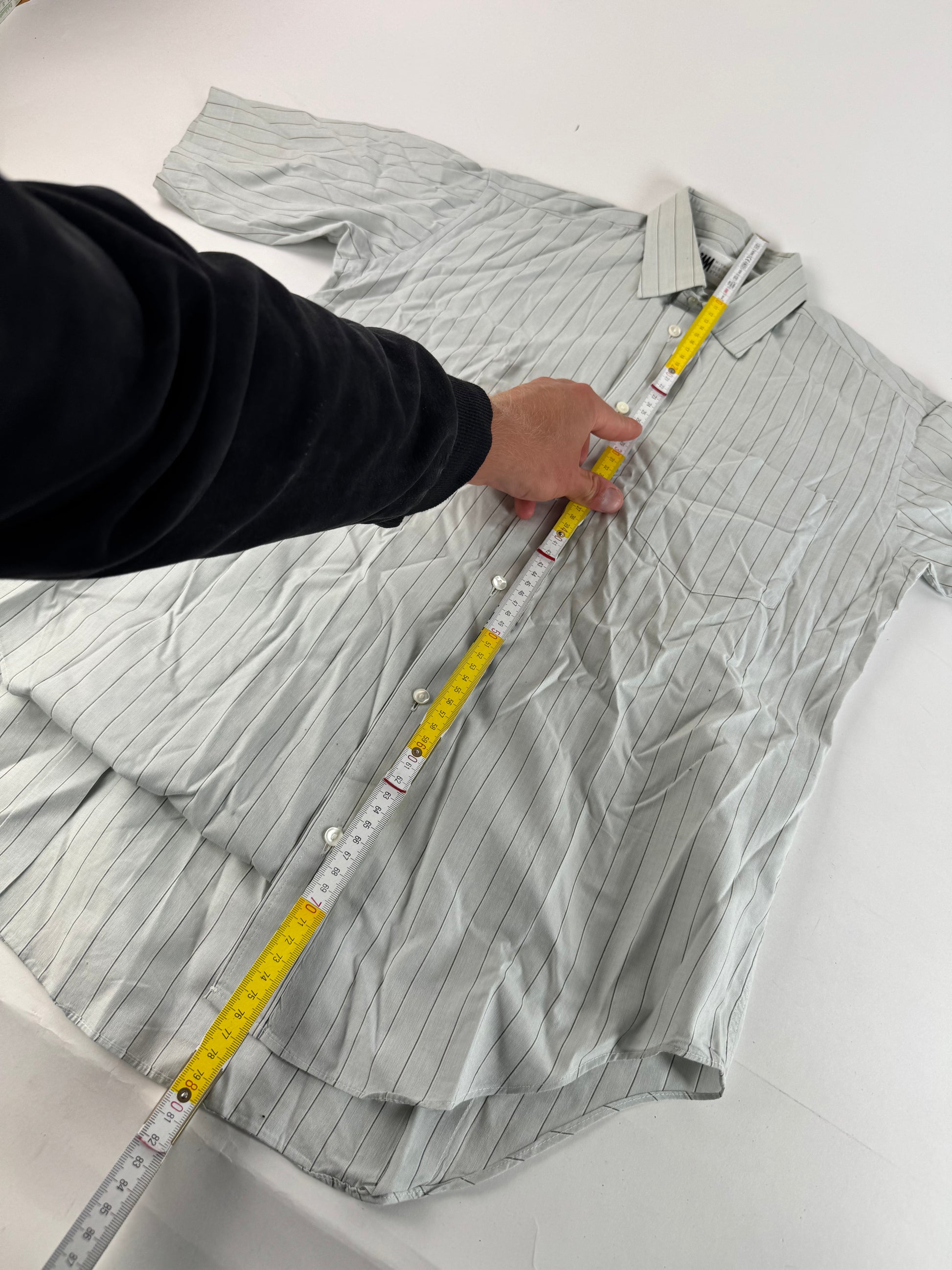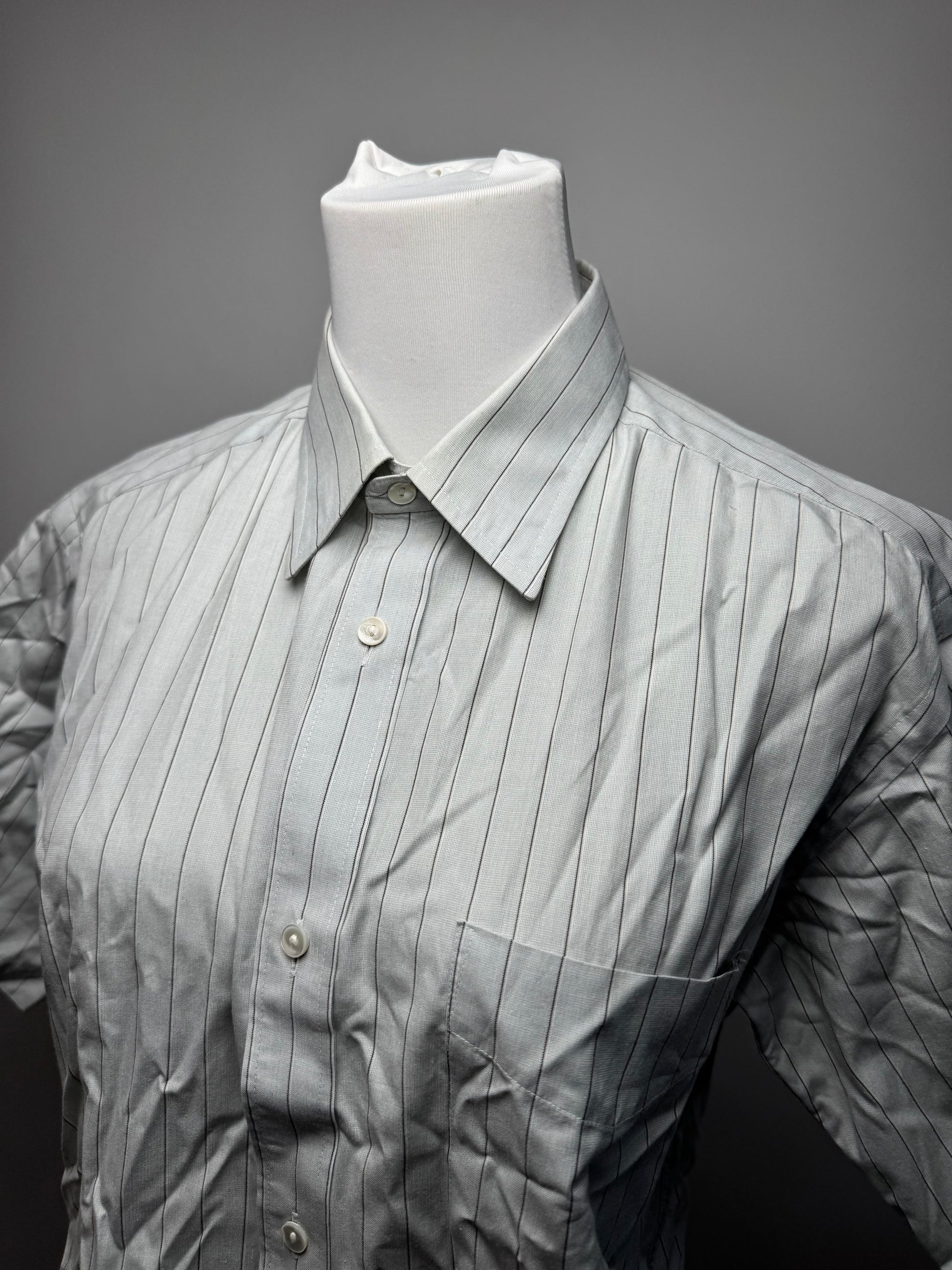 This chic shirt features a light grey base with black stripes and a classic button-down design. The buttons are made of translucent, pearlescent plastic.