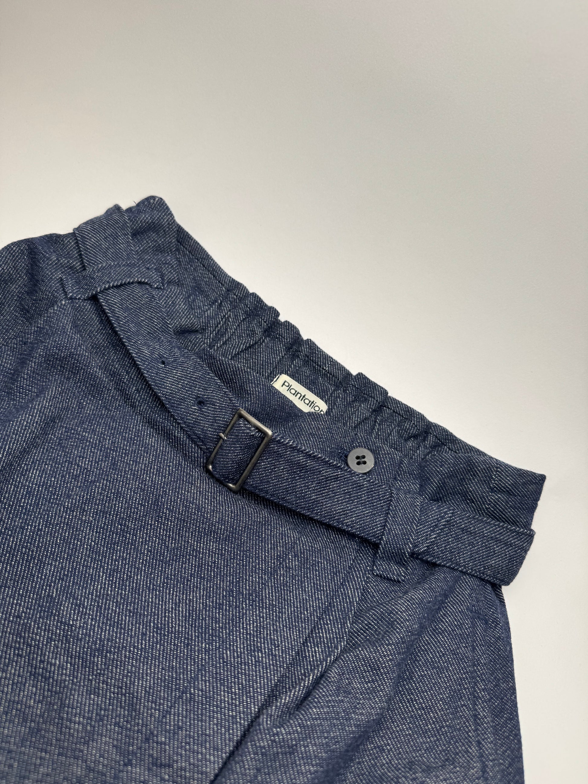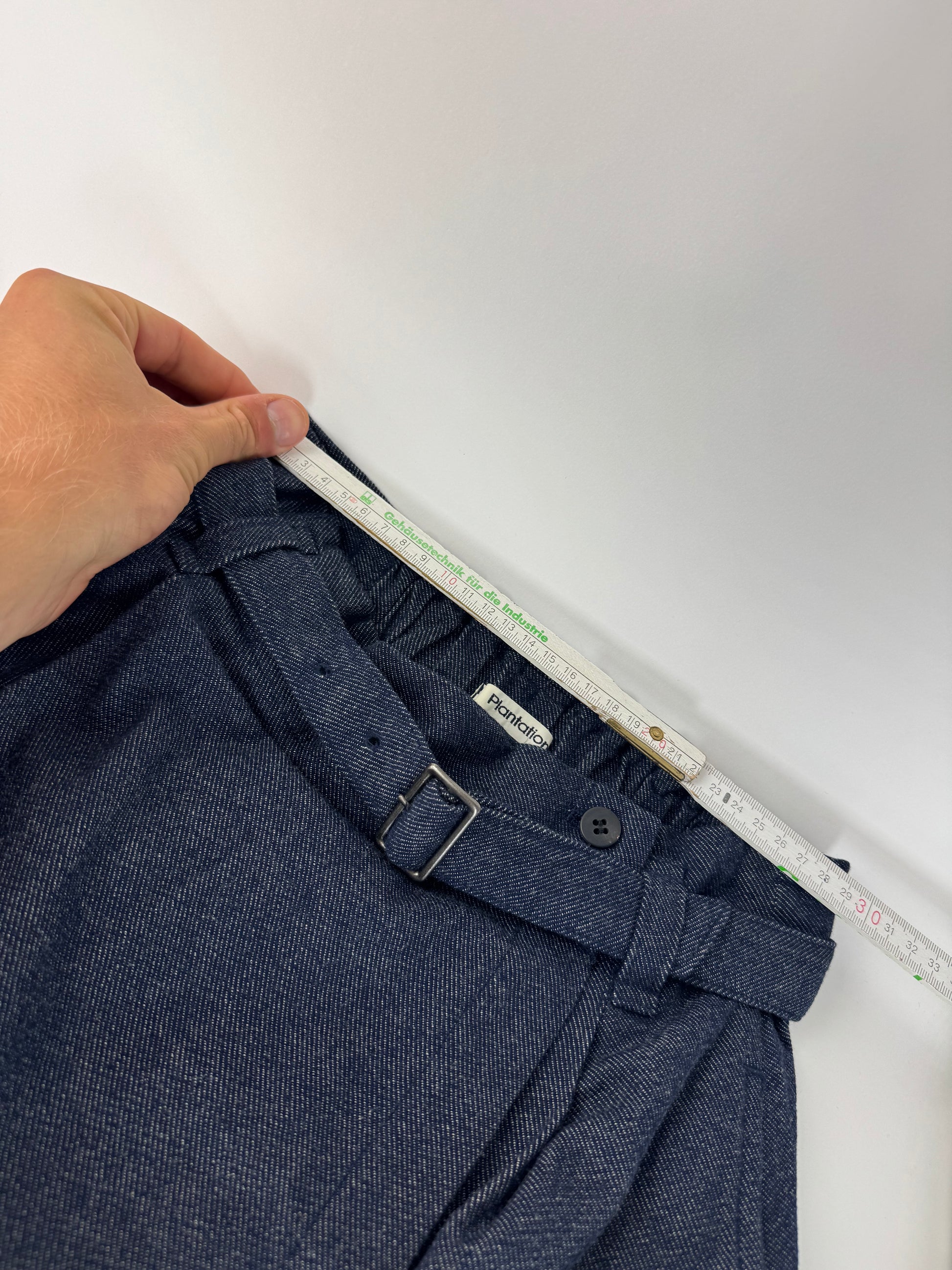 ISSEY MIYAKE Wide Denim Skirt. This vintage skirt is crafted from dark blue denim and features a wide, flowing silhouette. It comes with a matching denim belt and a gunmetal steel buckle. The high-waisted design adds structure while maintaining a relaxed, architectural form — a signature of Issey Miyake’s innovative approach to everyday fashion.