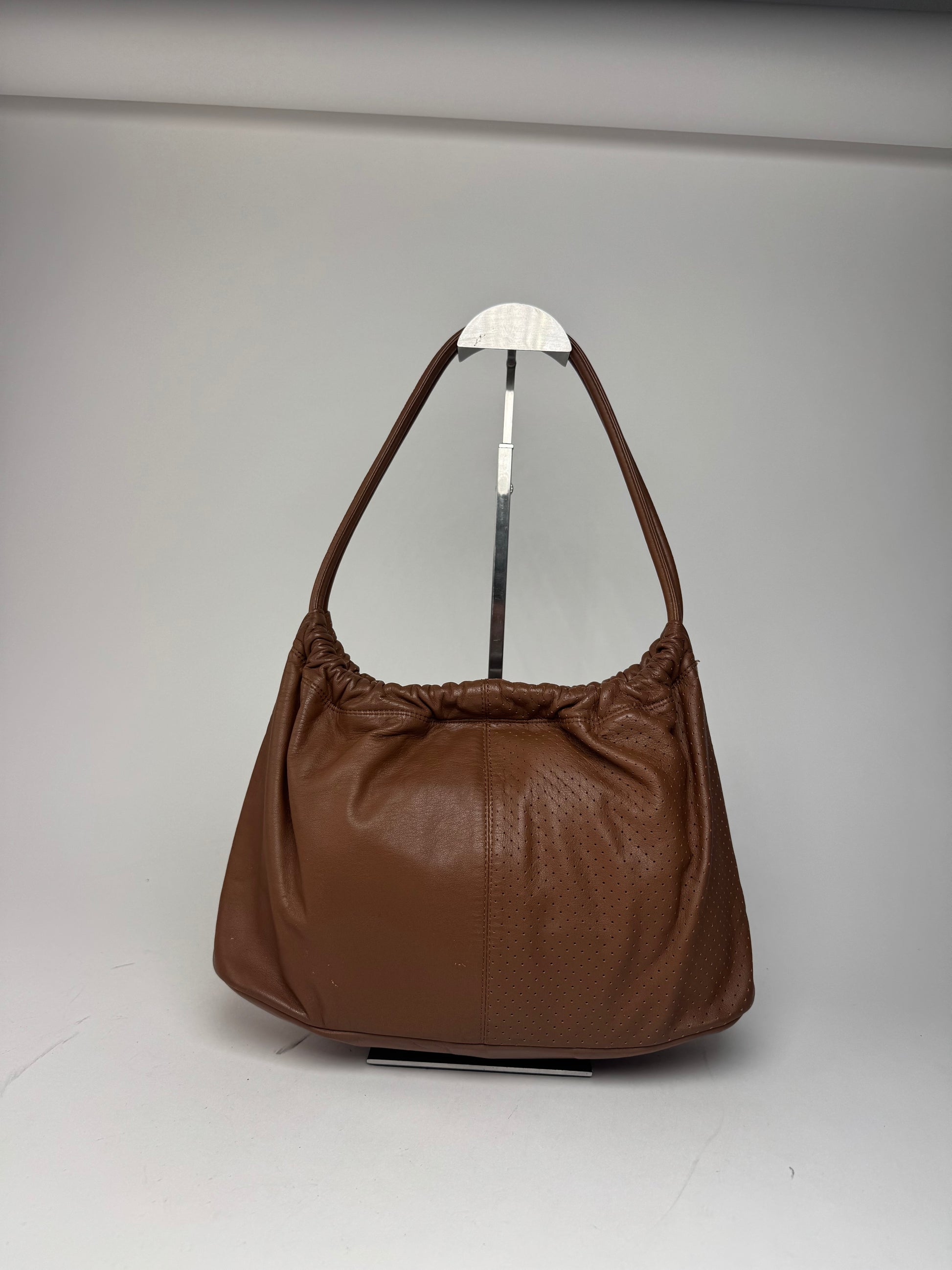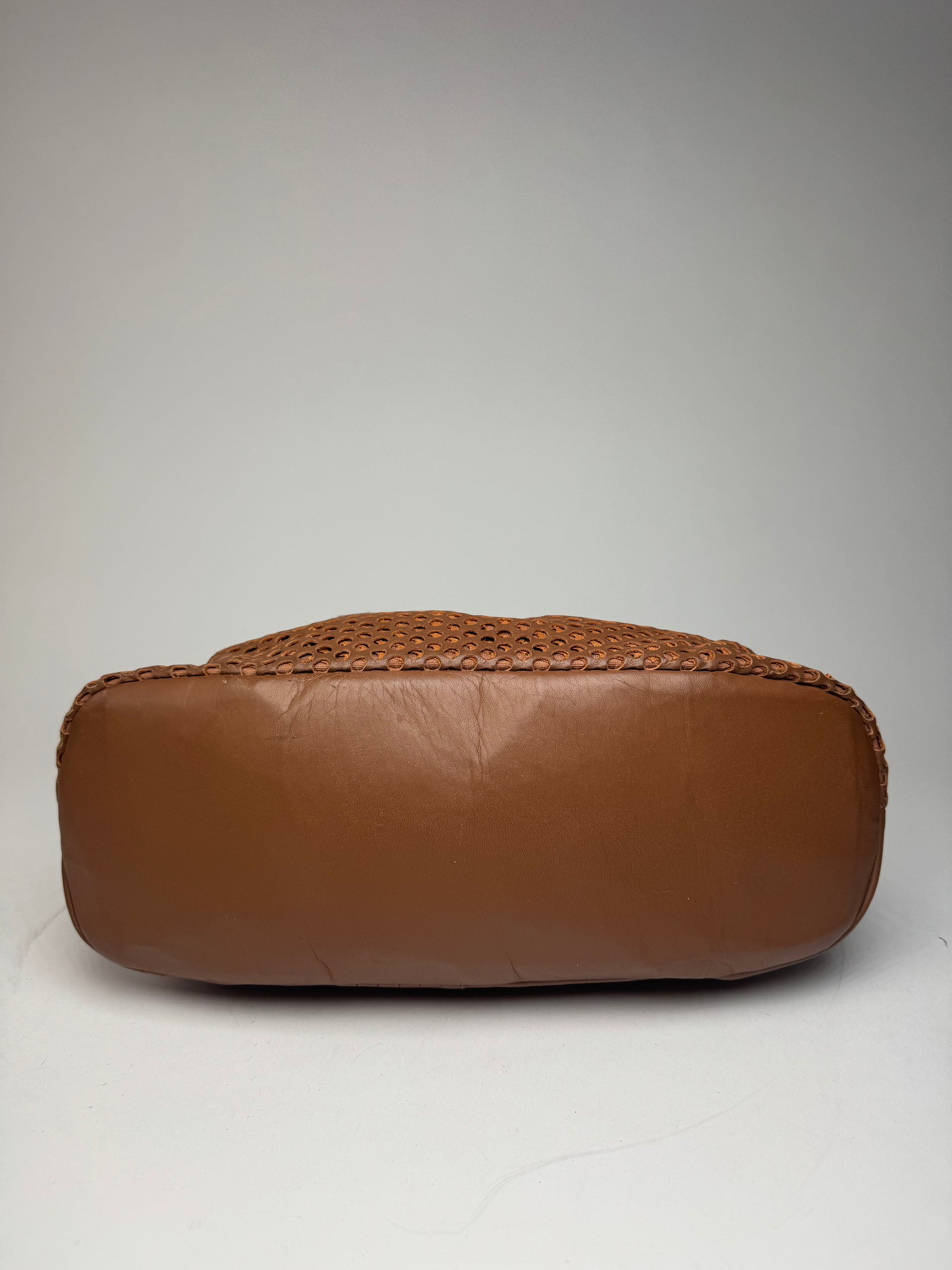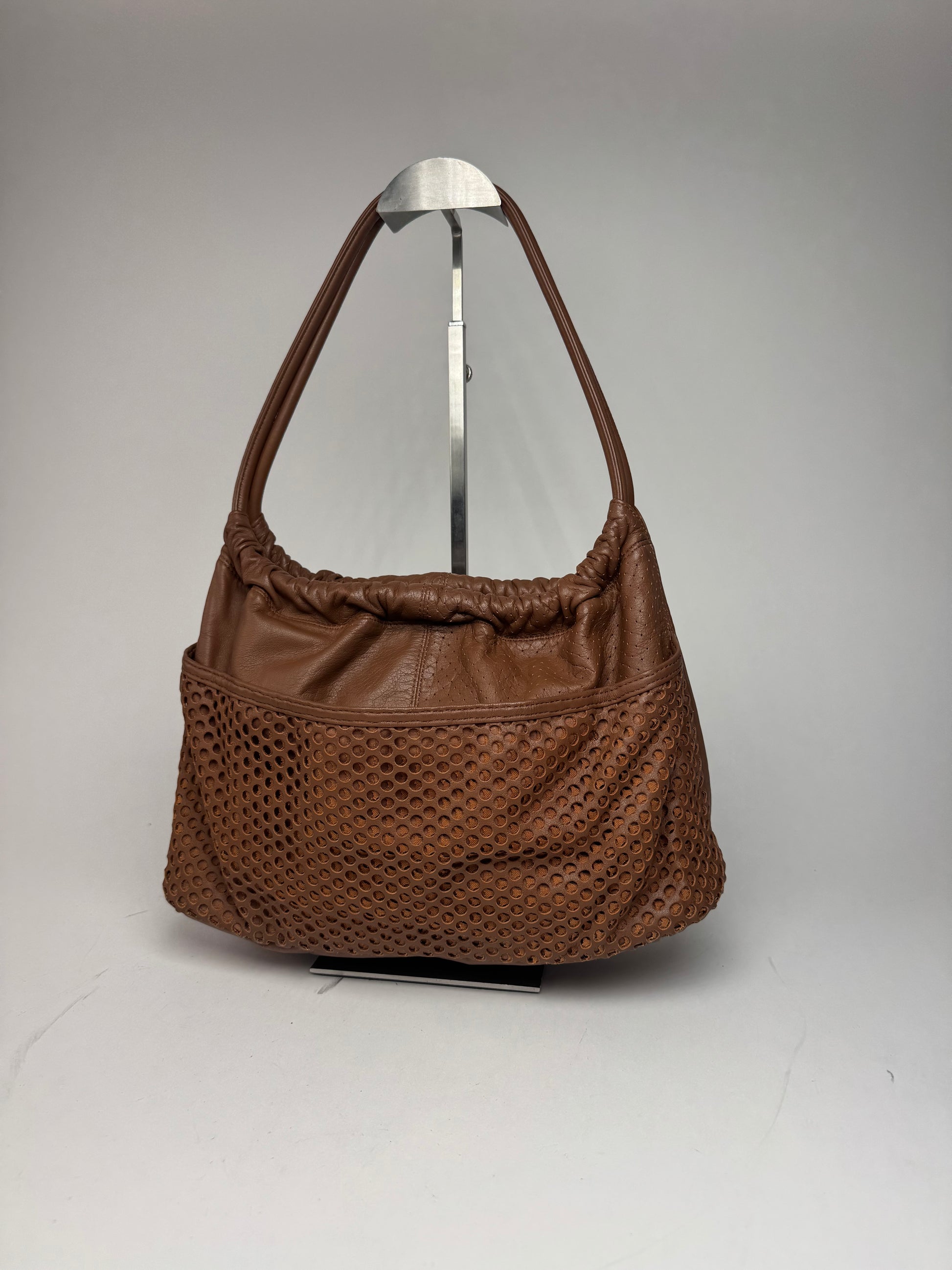 ISSEY MIYAKE Vintage Handbag. This chic handbag is finely crafted of brown leather with silver-tone steel hardware. It features two mid-length handles, a magnetic closure, and a net-like leather pocket on the front in matching material. The interior is lined with brown canvas.