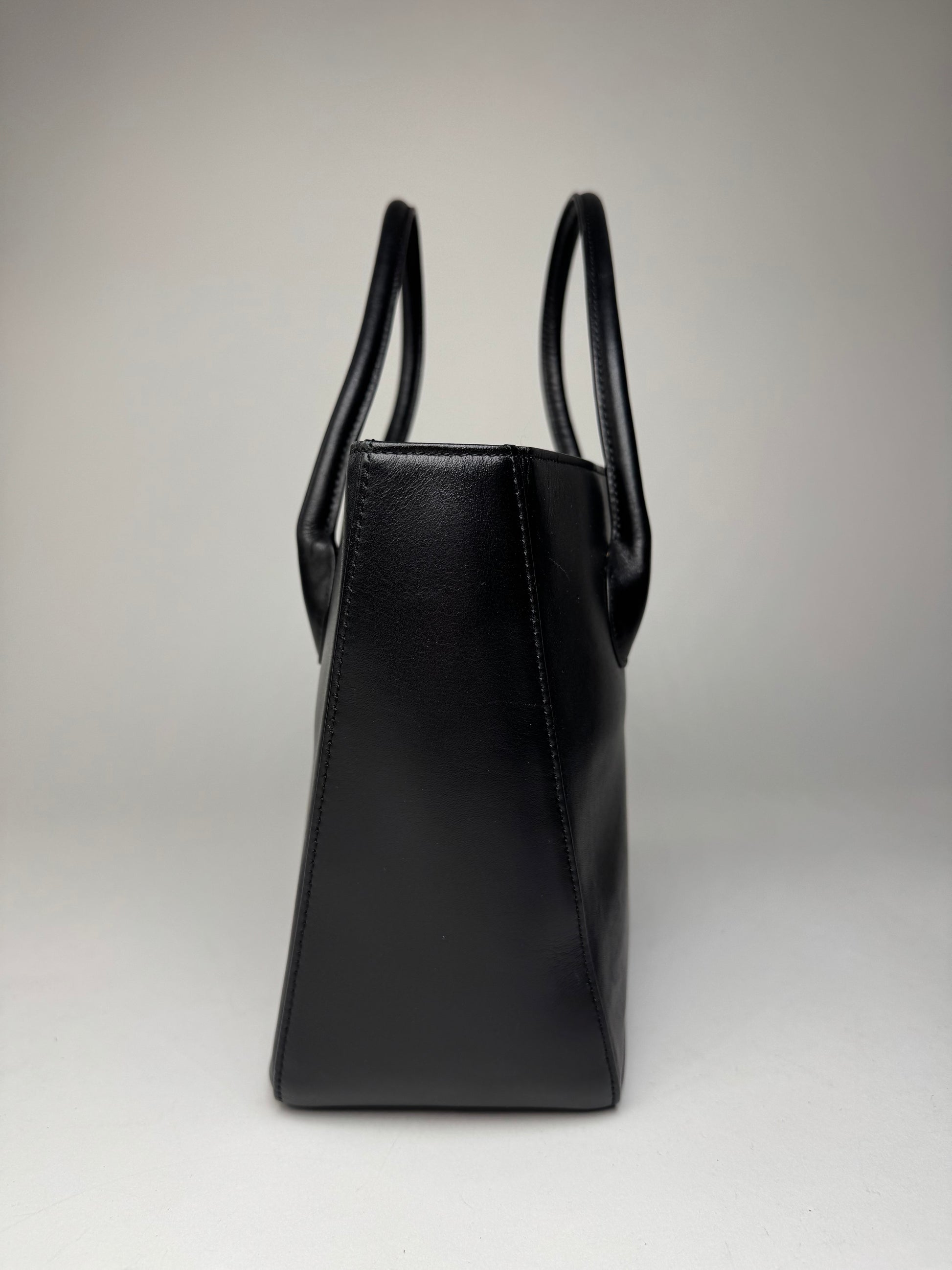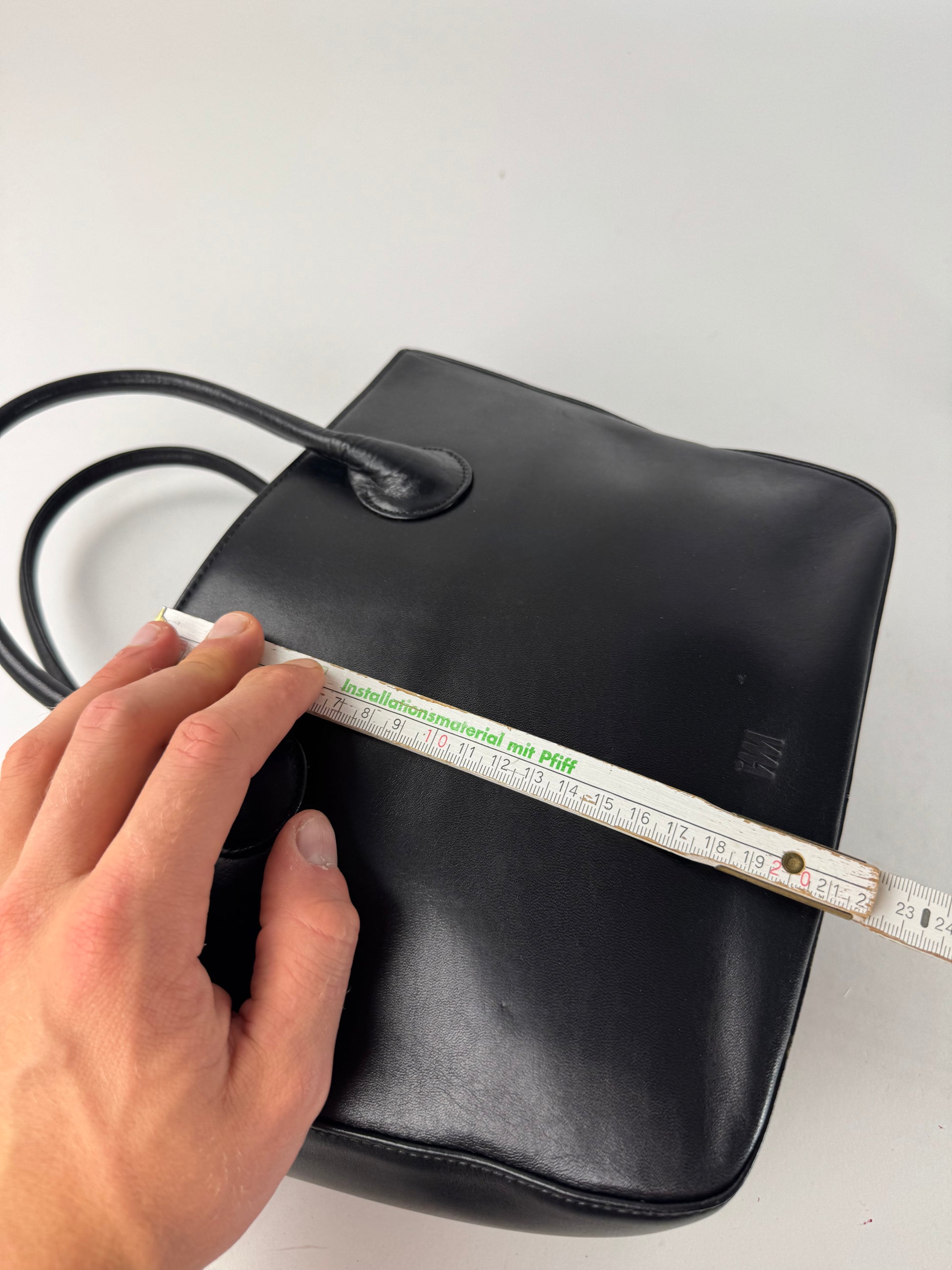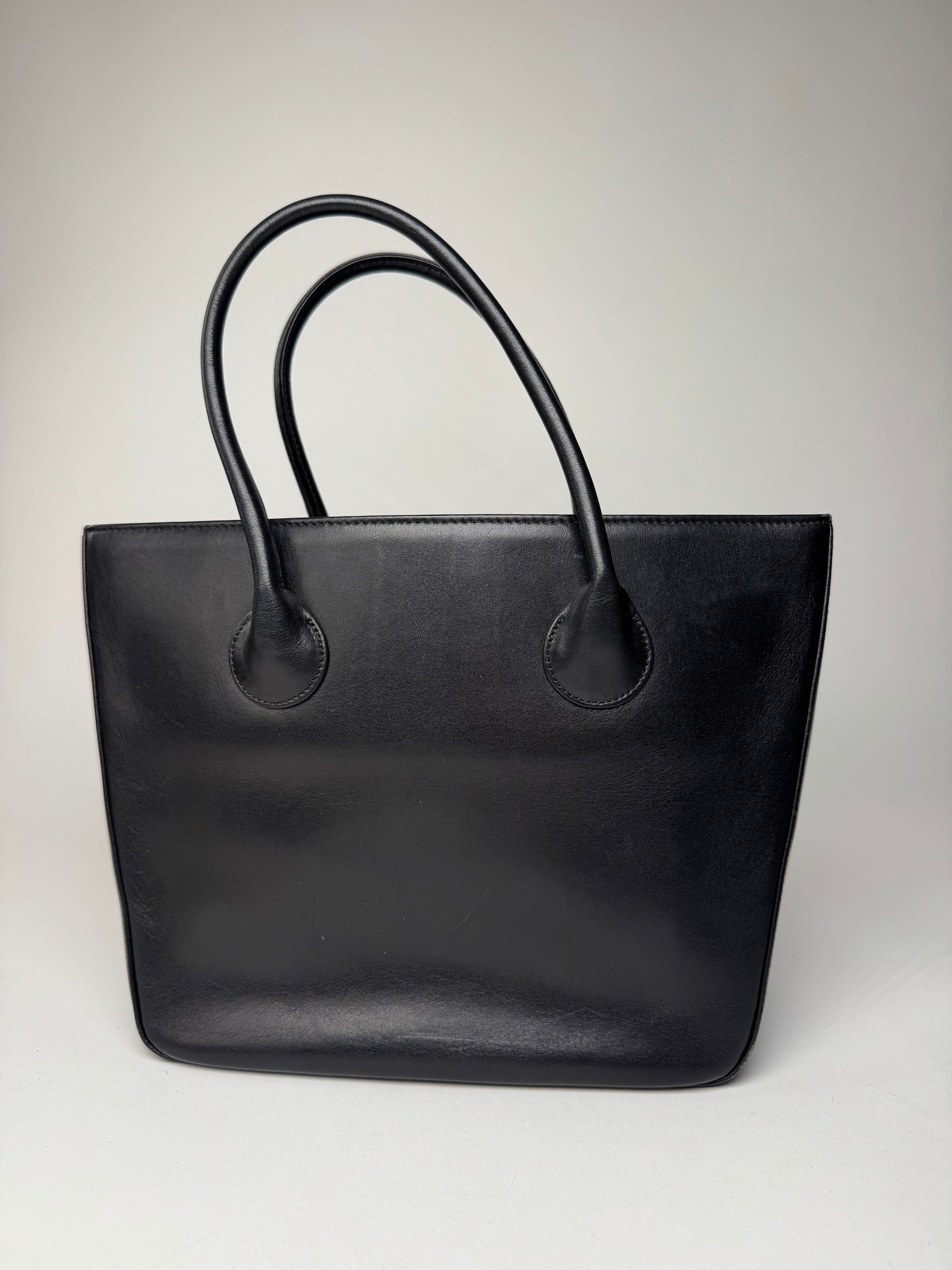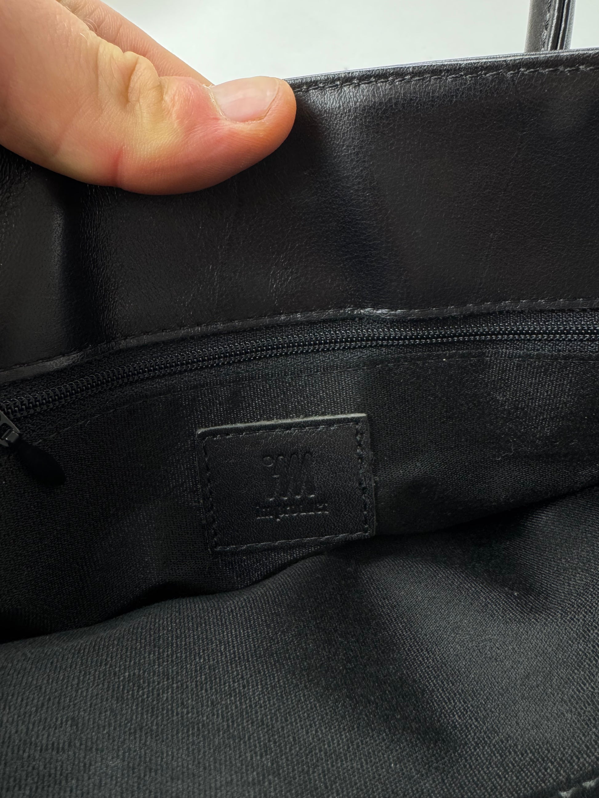 ISSEY MIYAKE Vintage Handbag. This minimalist vintage handbag is crafted of smooth black leather, including the top handles. The front is embossed with the Issey Miyake IM logo, reflecting the brand’s understated and conceptual design philosophy. The bag features a clean, structured silhouette and opens to a black canvas interior. It offers three interior compartments, one of which is secured with a zipper. The piece is believed to be made in Japan.