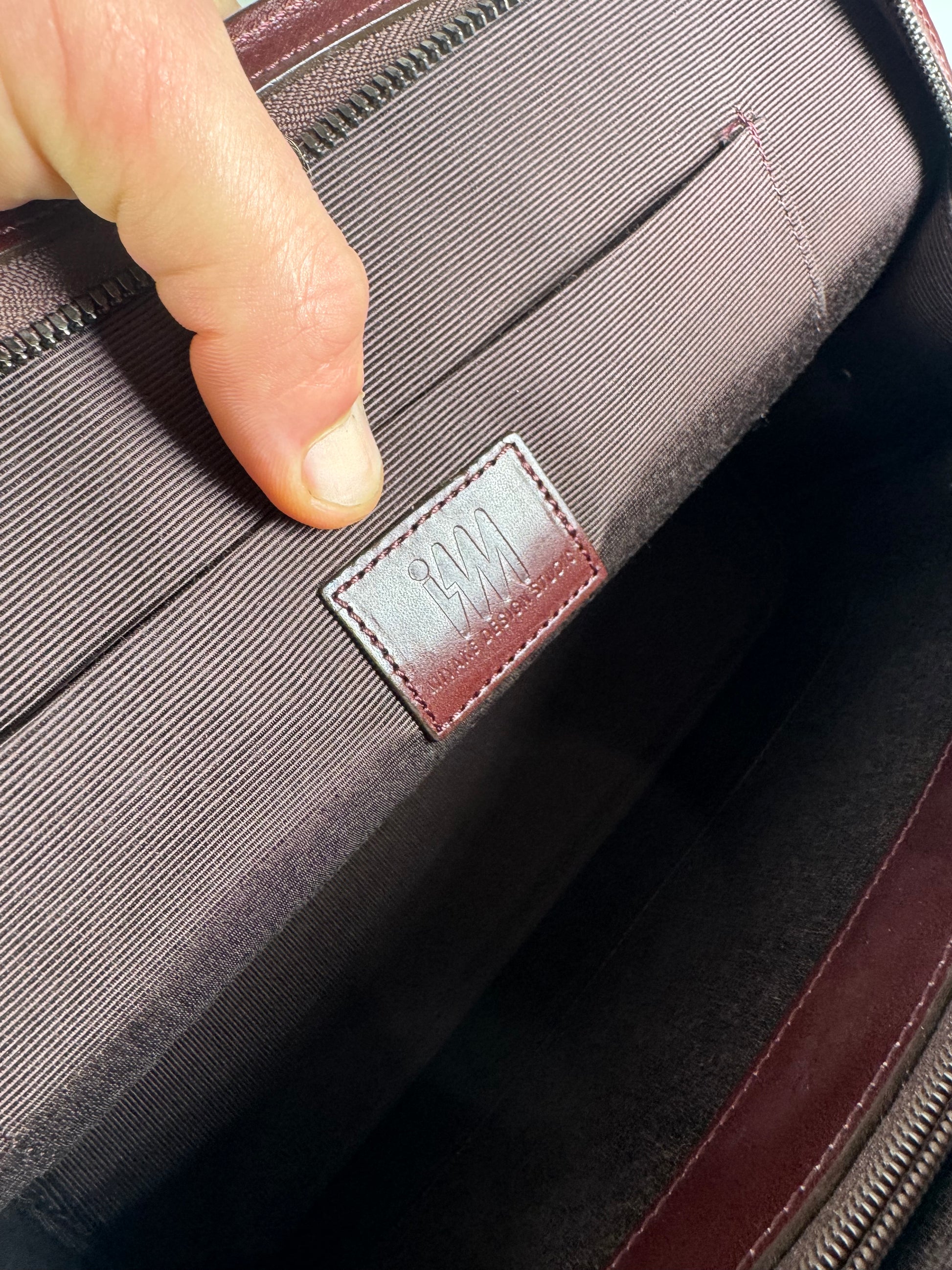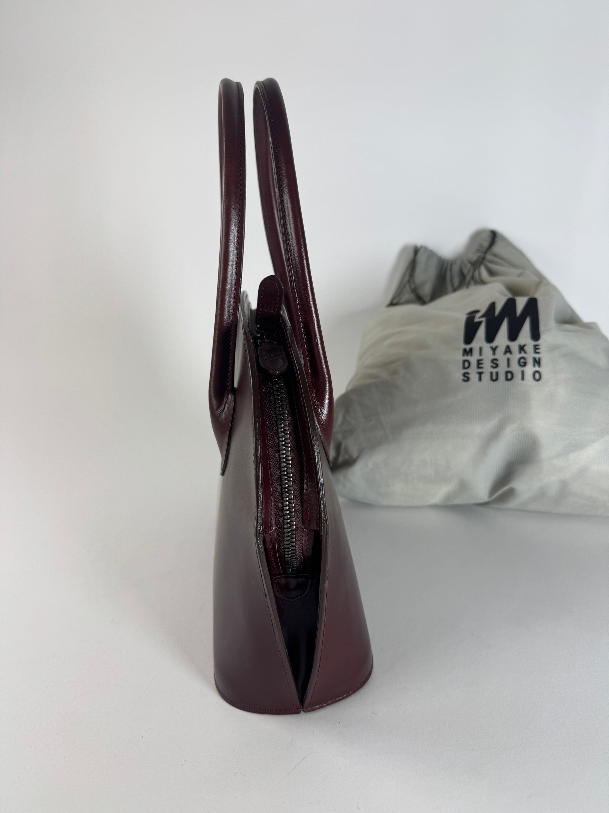ISSEY MIYAKE Vintage Leather Handbag. This minimalist vintage handbag is crafted from smooth lilac leather and reflects Issey Miyake’s signature approach to functional yet sculptural design. The bag features a top zip closure with silver-tone steel hardware and opens to a coordinated lilac canvas interior, emphasizing clean lines and refined simplicity.