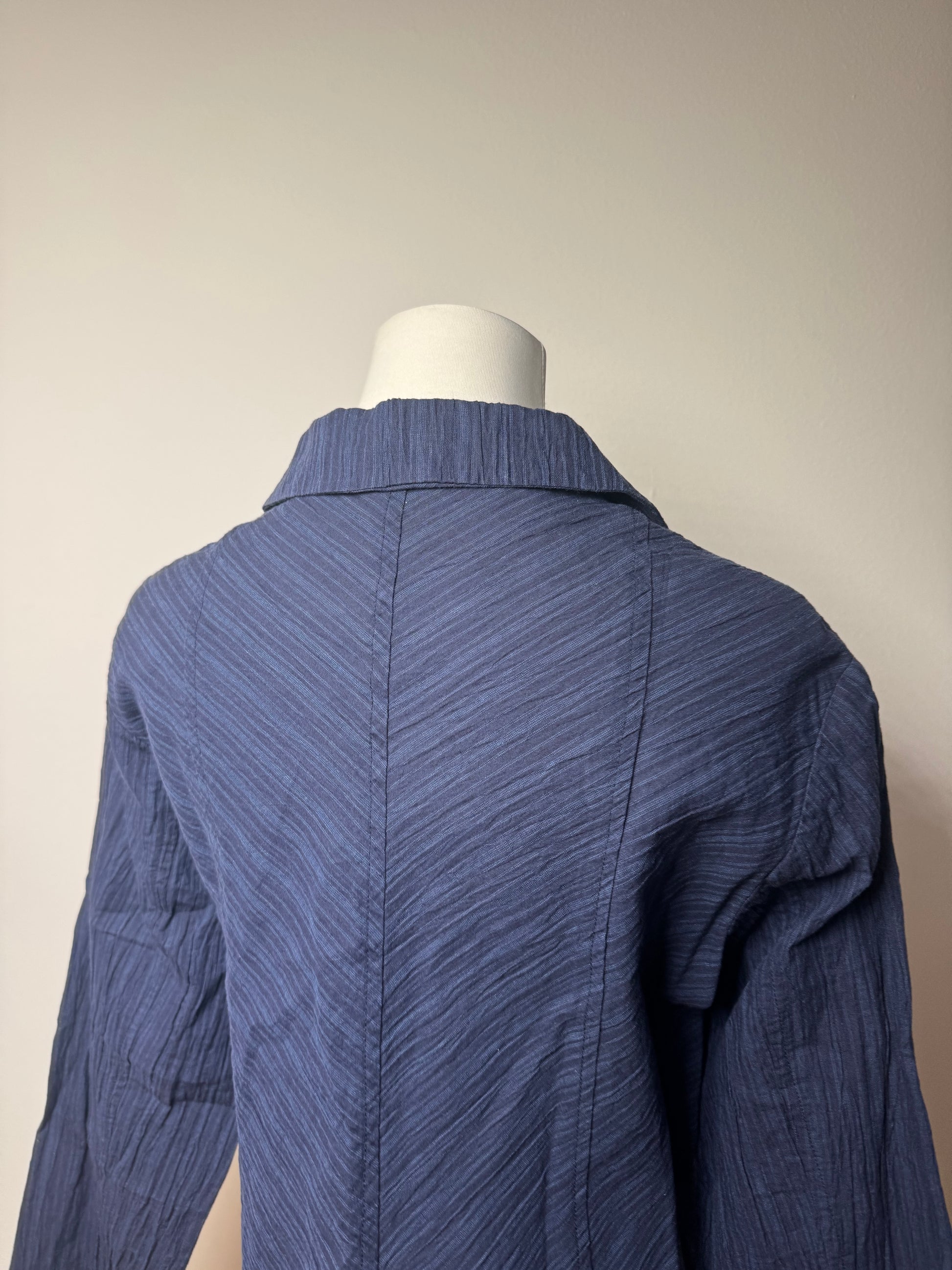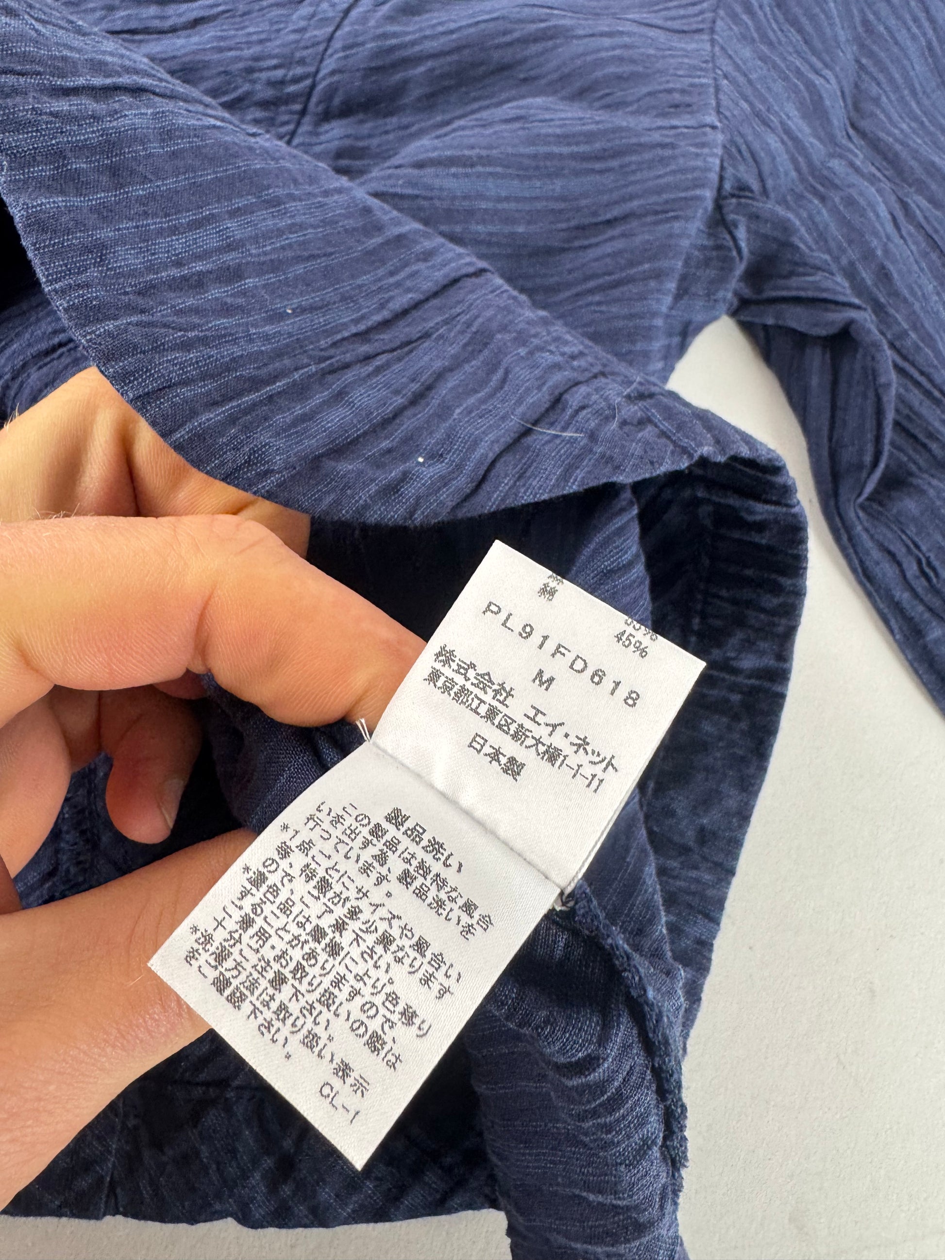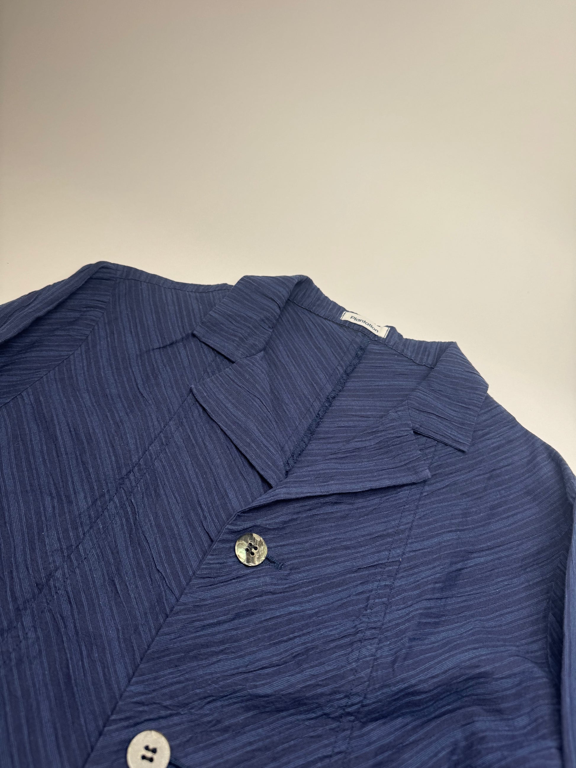 ISSEY MIYAKE Plantation Vintage Short Coat. This refined vintage short coat is crafted of a navy cotton and polyester blend featuring a pleated, textured finish characteristic of Issey Miyake’s innovative design approach. Designed under the Plantation line, launched in the early 1980s, the label focused on natural fabrics, comfort, and everyday wearability while maintaining Miyake’s experimental spirit. The coat is finished with black plastic buttons and offers a structured yet relaxed silhouette.