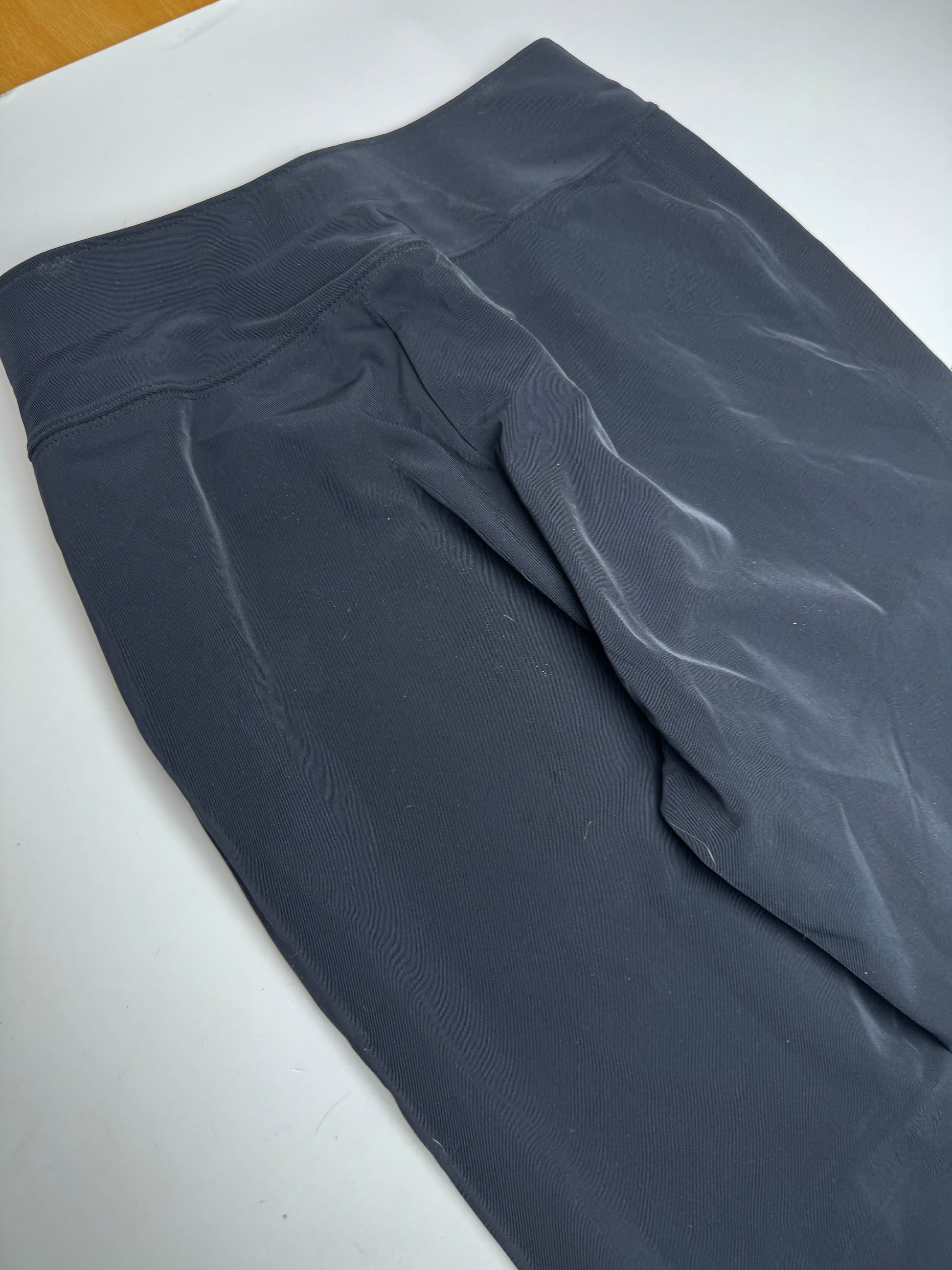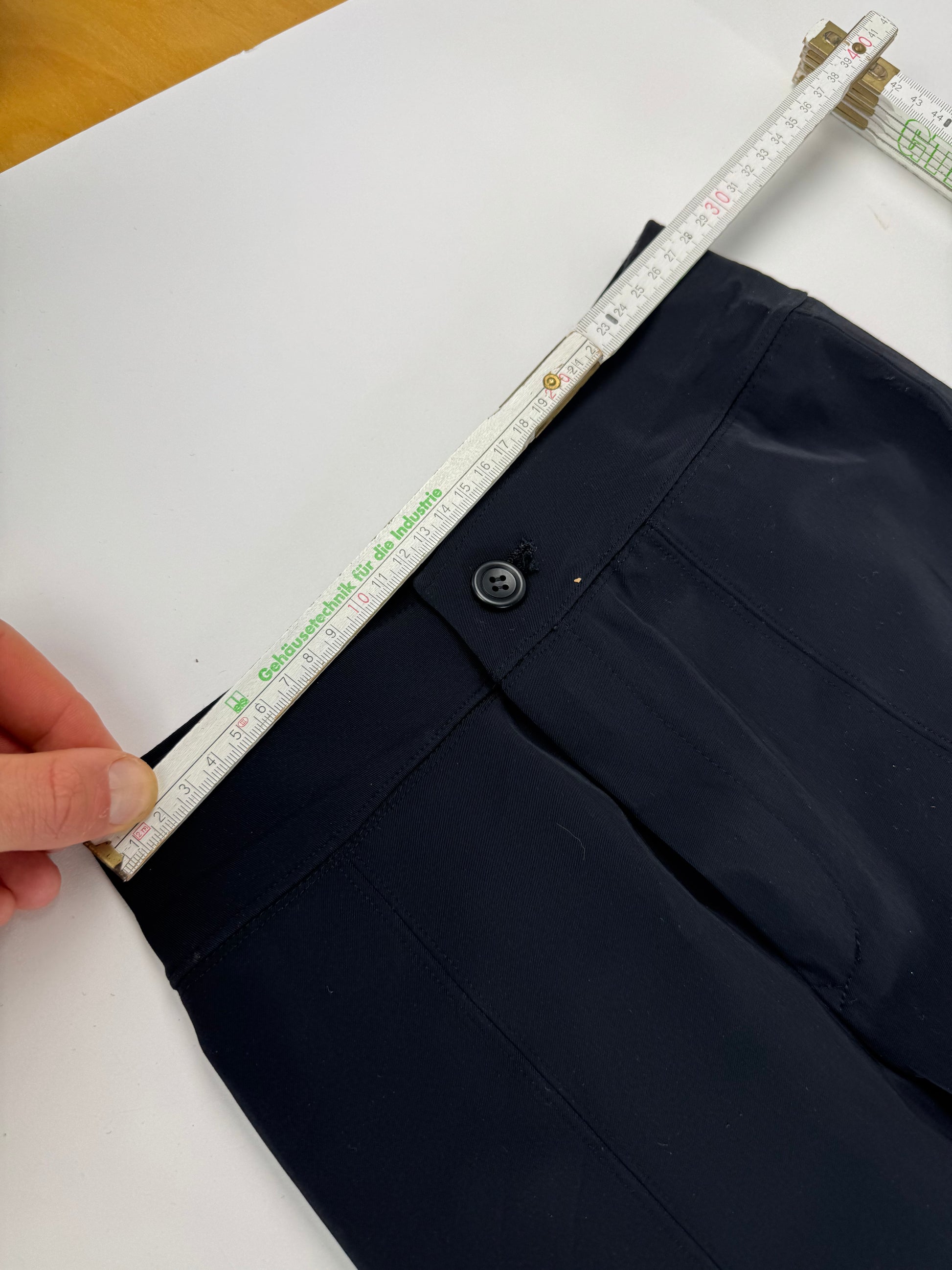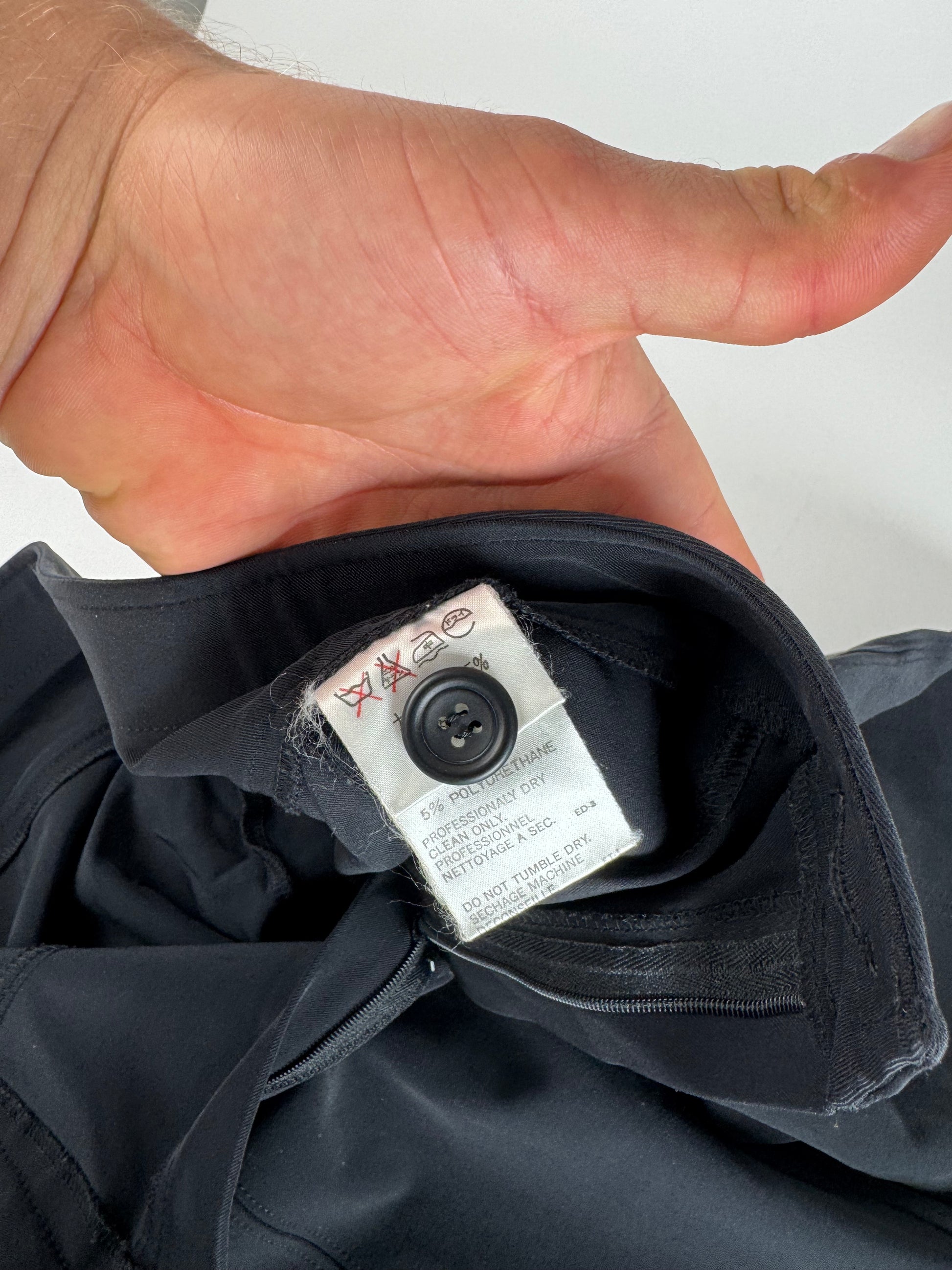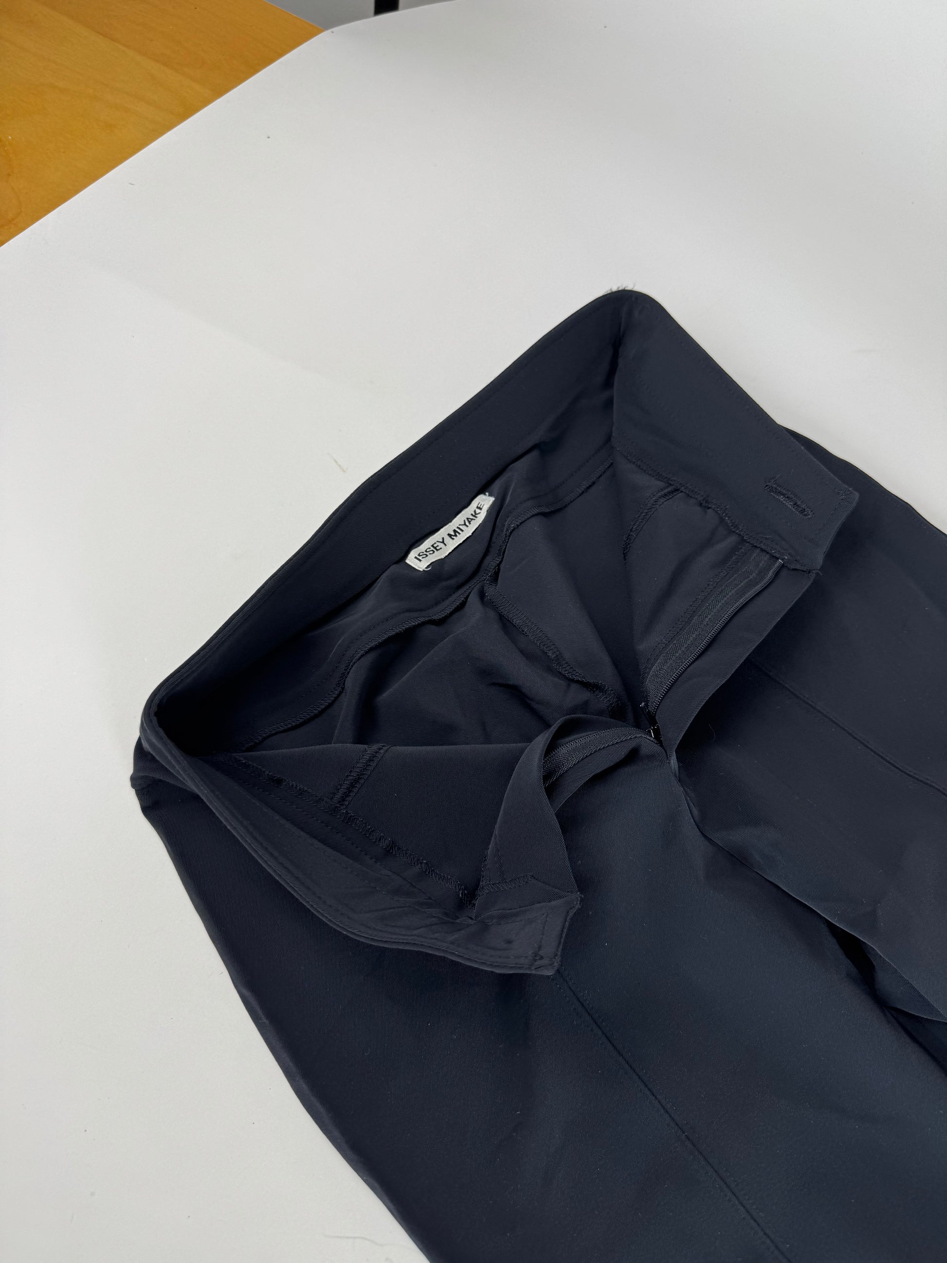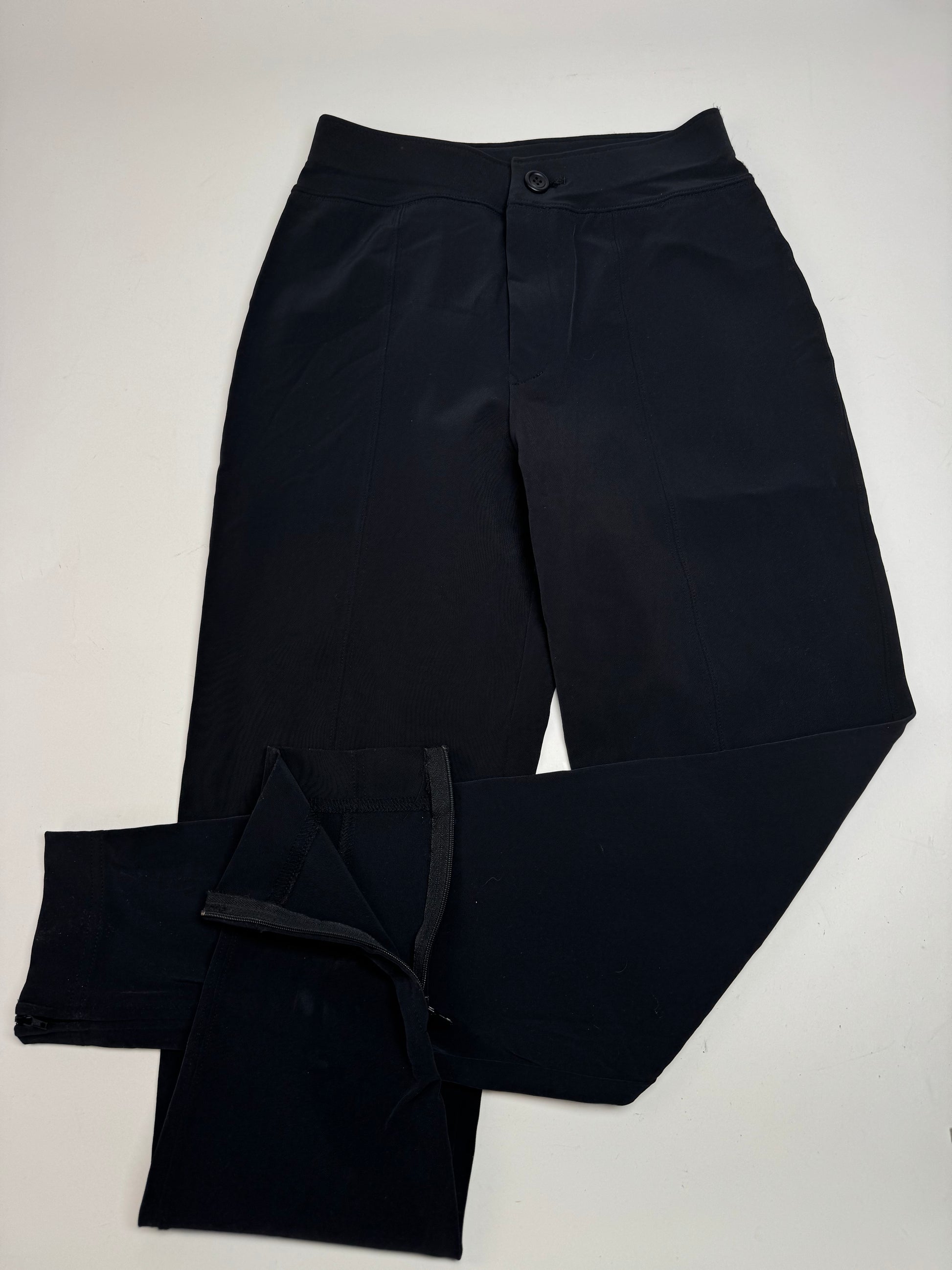 These sleek trousers are crafted from black polyester and feature a modern, minimalist design. The style includes an elastic waistband and zippers at the leg openings for added detail. Size is International XS.