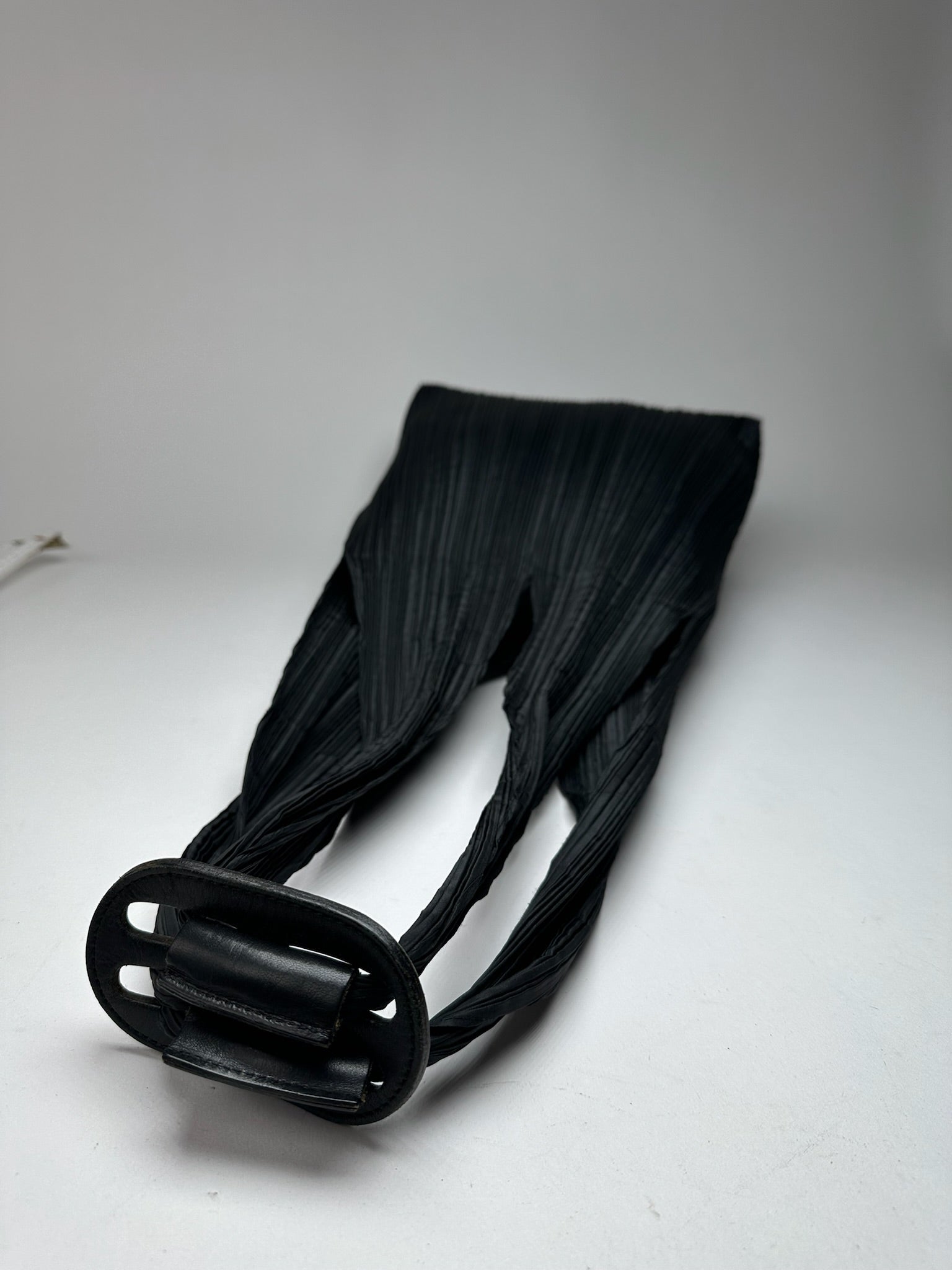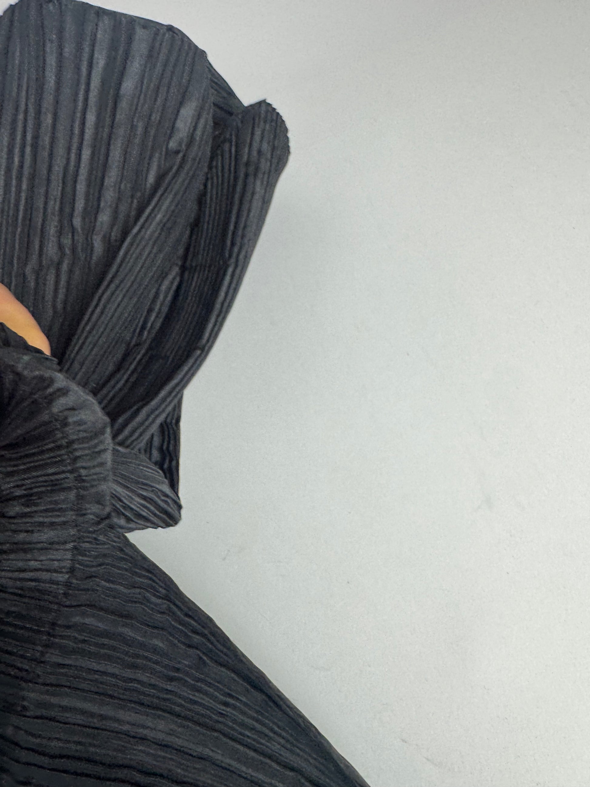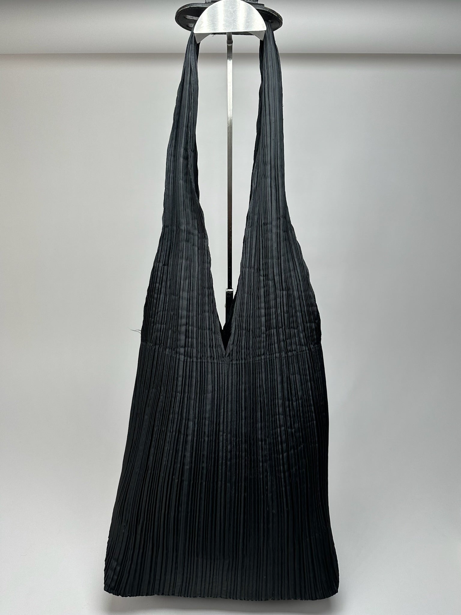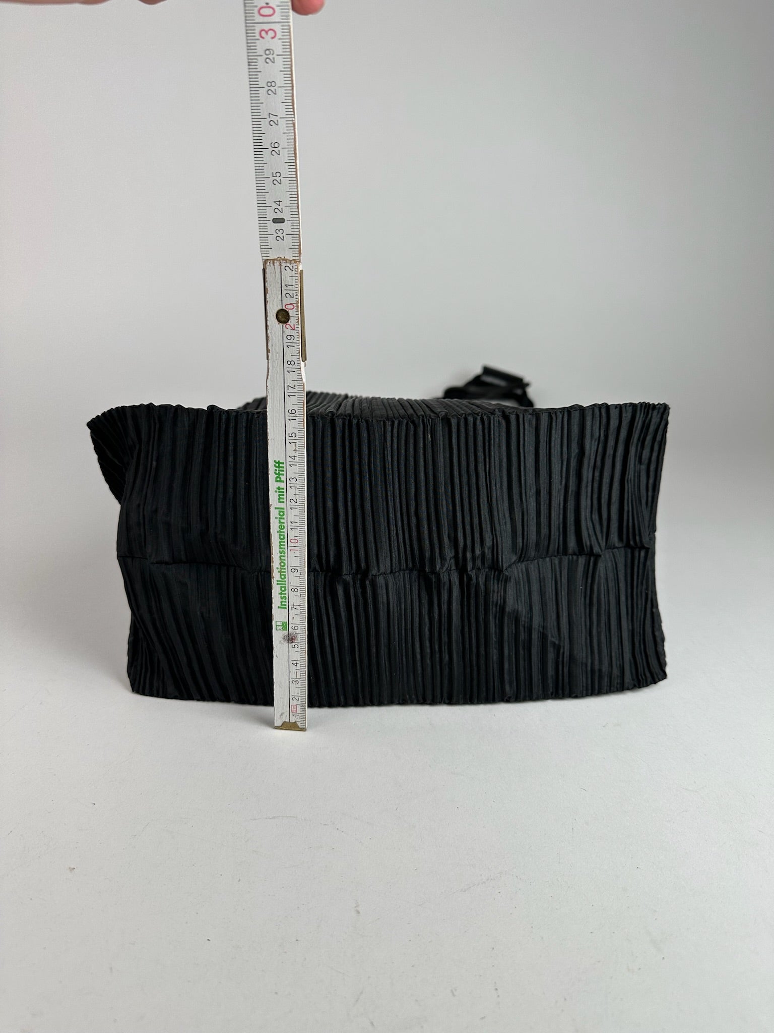 ISSEY MIYAKE Vintage Handbag. This chic handbag is finely crafted of black pleated fabric, made from a high-quality polyester blend known for its lightweight, durable, and shape-retaining properties. The design features a unique sculptural silhouette that can be adjusted with a leather strap for a more compact look.