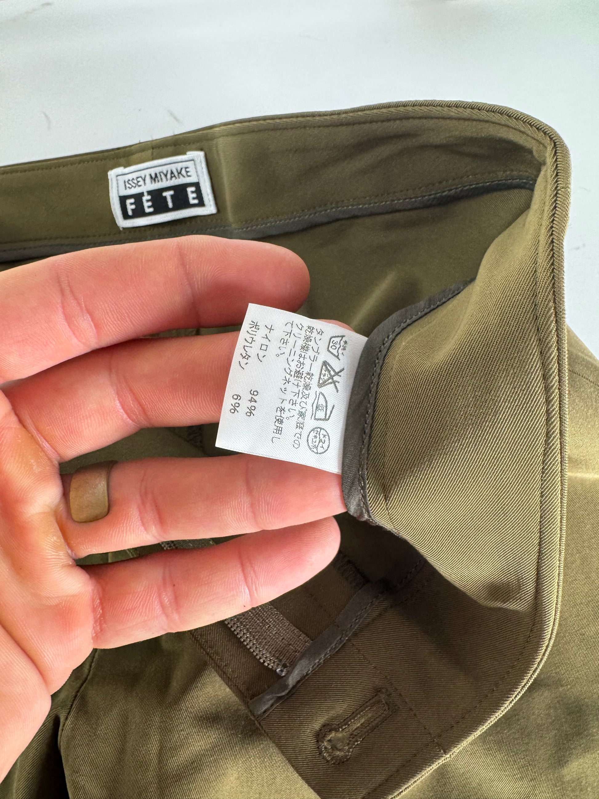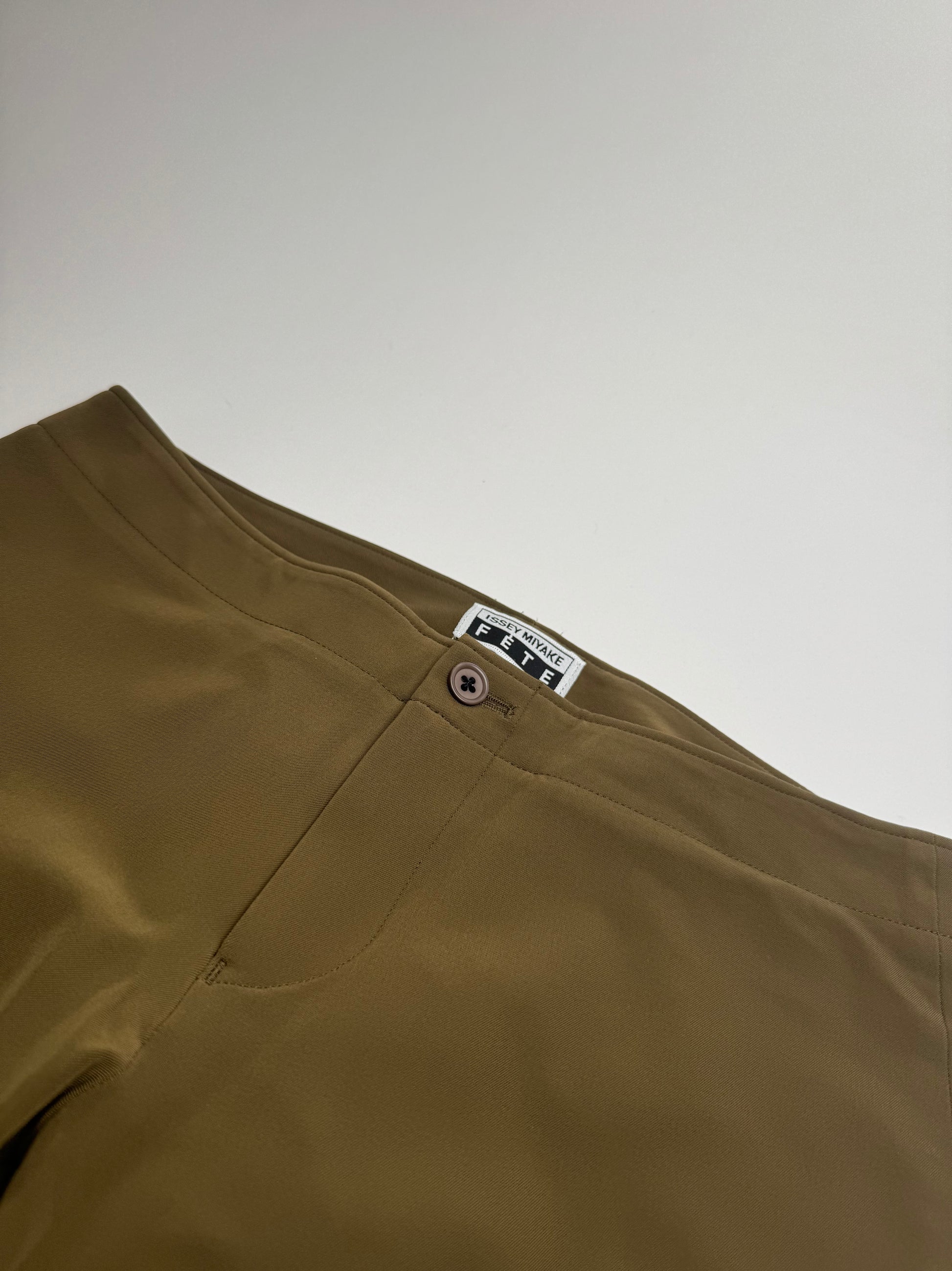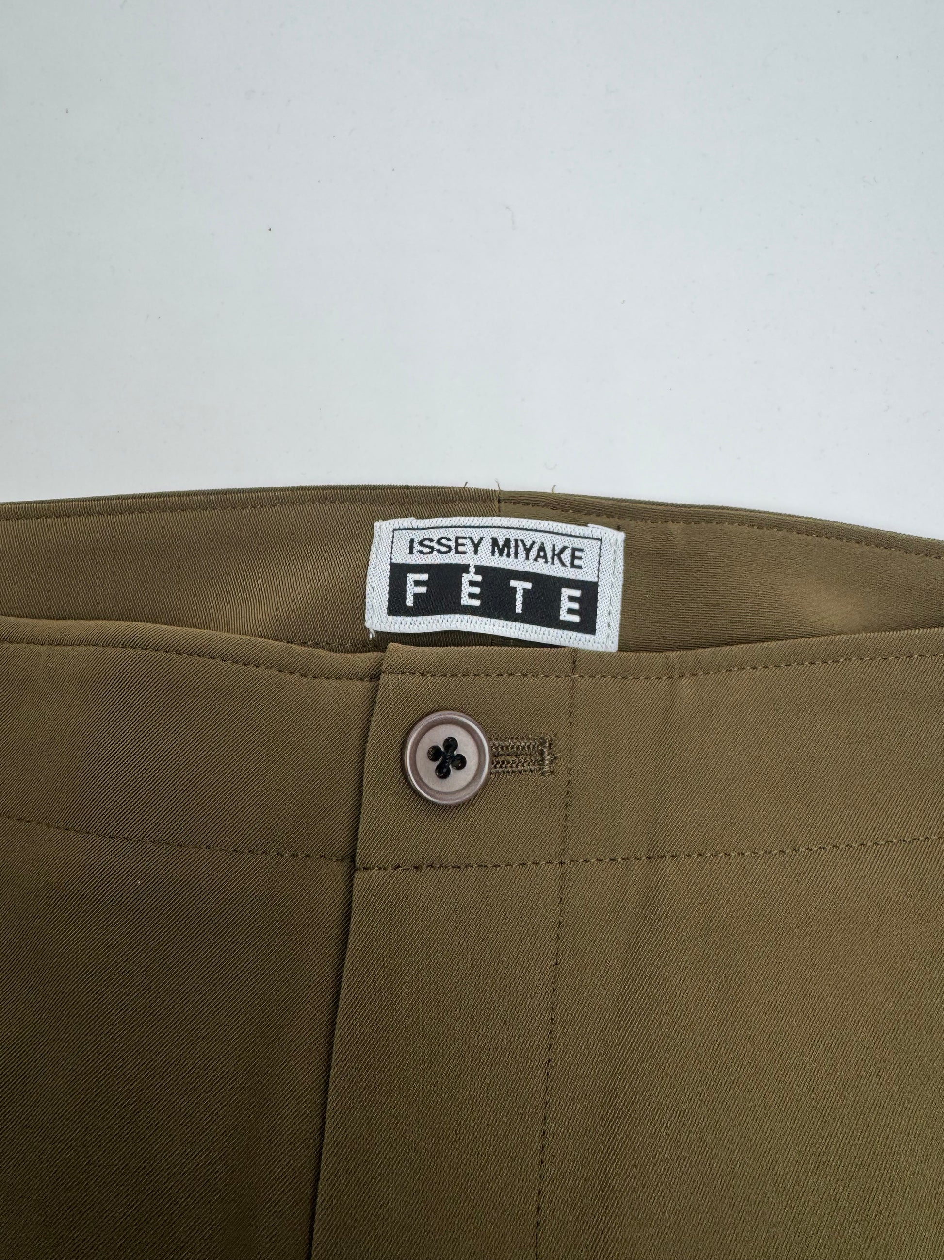 ISSEY MIYAKE FÊTE Vintage Trousers. These minimalist vintage trousers are crafted from khaki polyester and feature brown plastic buttons. The piece comes from Issey Miyake Fête, a sub-line developed to offer elegant, wearable everyday designs while maintaining the brand’s signature focus on innovative materials, comfort, and modern silhouettes. The trousers are presented on a mannequin wearing size 38 / M.