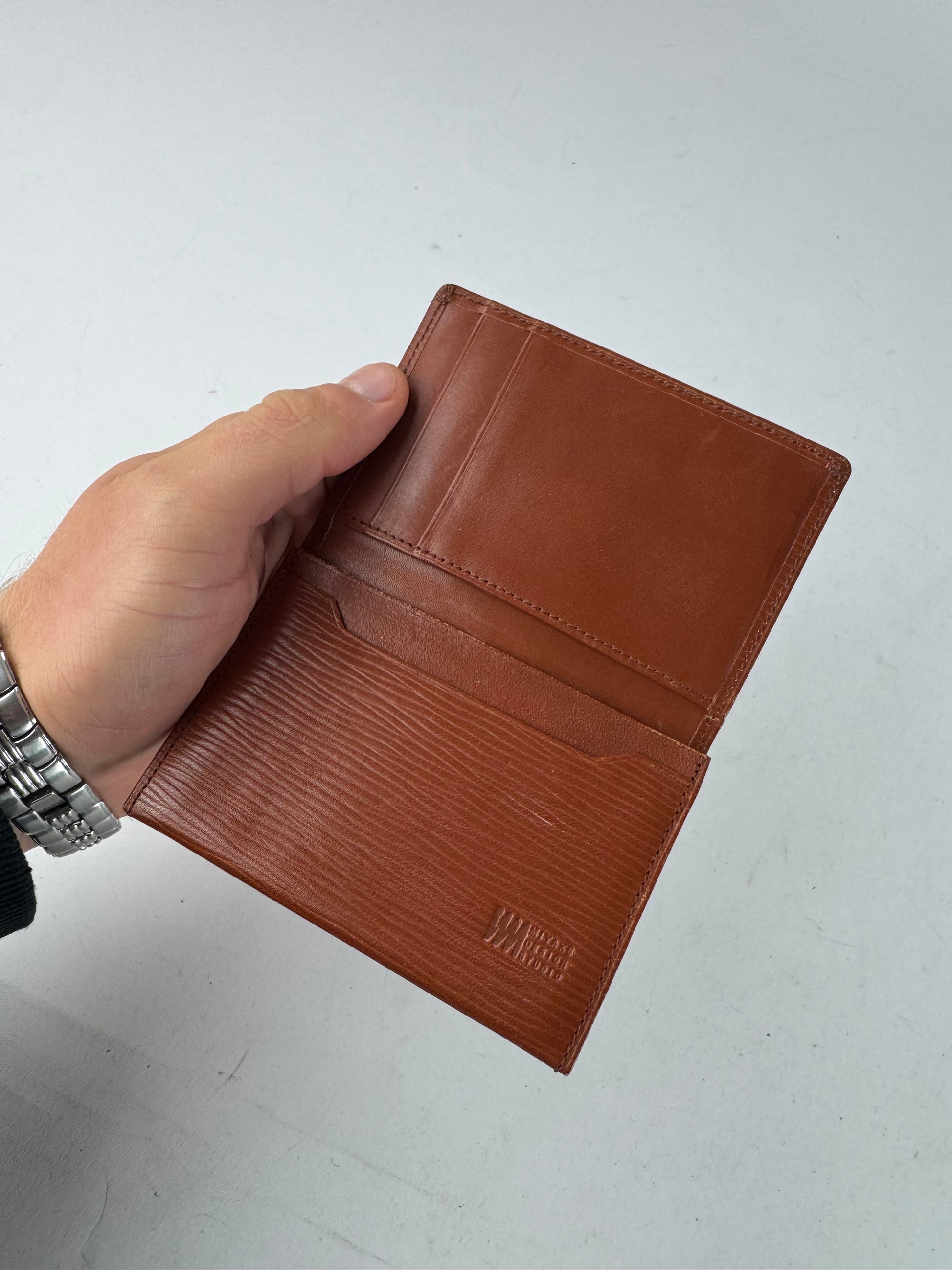 ISSEY MIYAKE Vintage Card Holder. This distinctive vintage card holder is crafted of ribbed orange-brown leather and features an Issey Miyake “EM Design Studio” engraving on the front. The foldable design offers a minimalist yet functional aesthetic, reflecting the brand’s innovative approach to texture and form. The interior is lined in smooth brown leather, and the piece is suitable for both men and women.