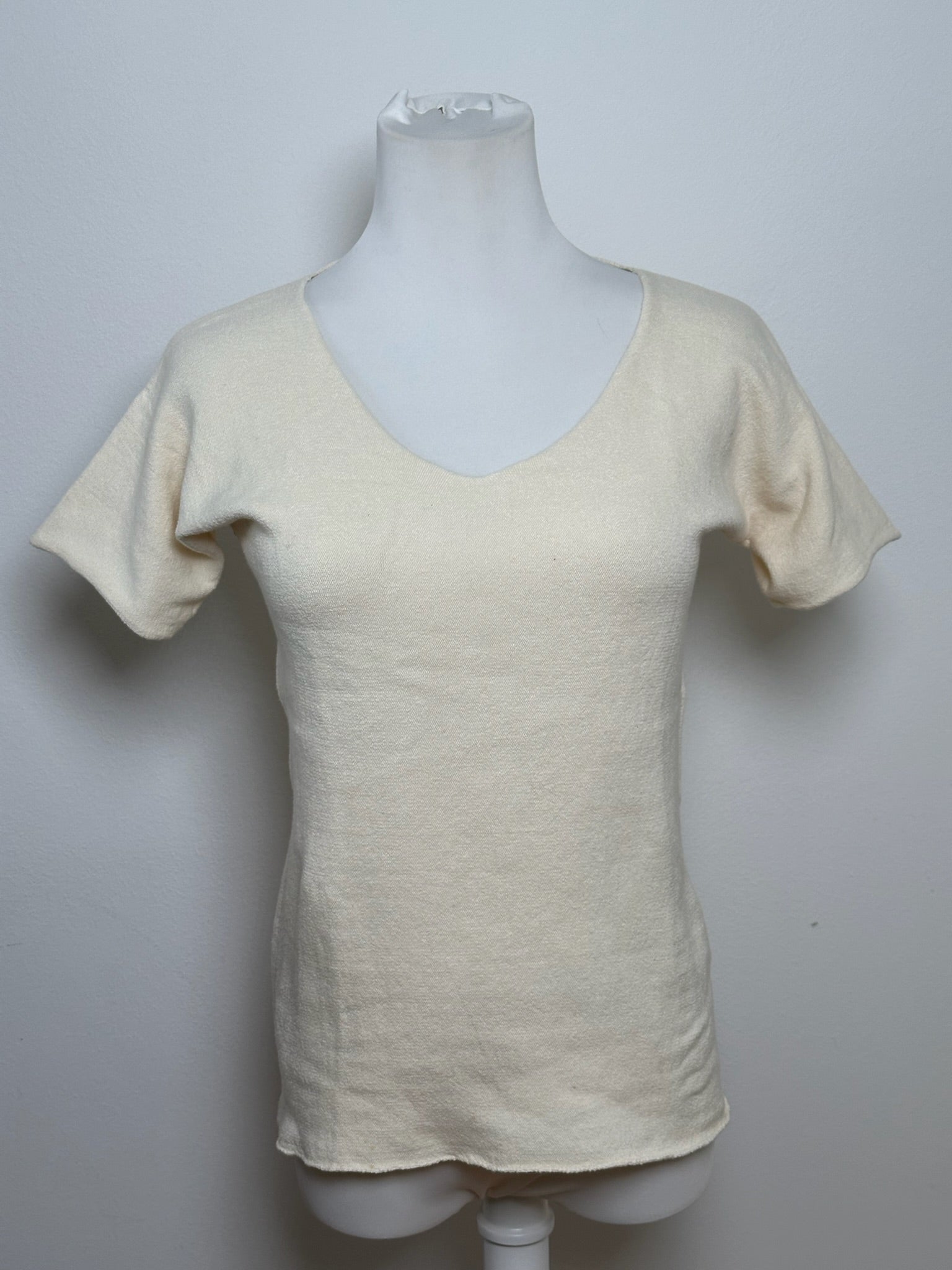 This chic top is crafted from a unique textured wool and elastane blend fabric, offering both structure and stretch. The design features a sculptural fit with short sleeves, combining comfort and elegance.