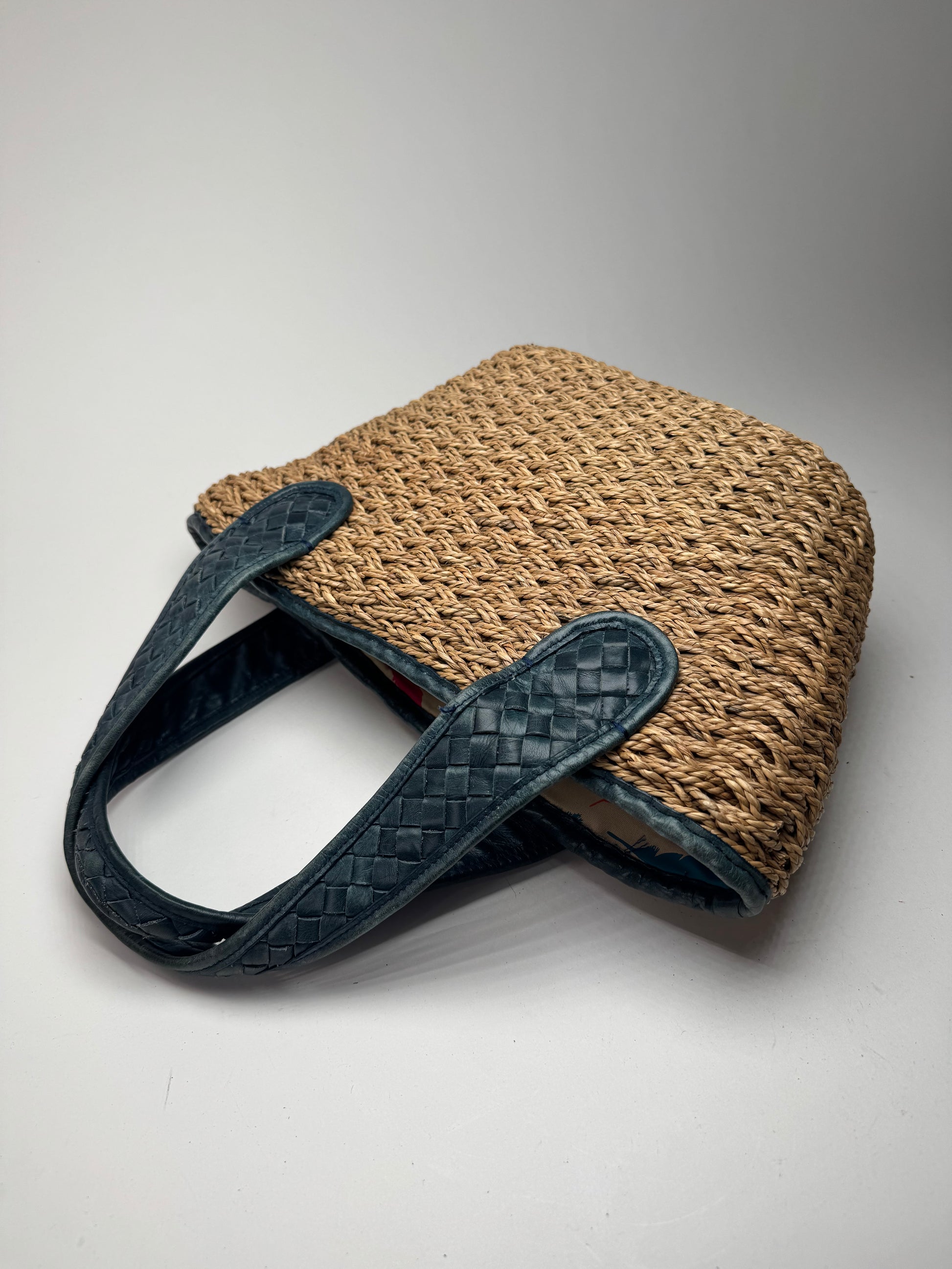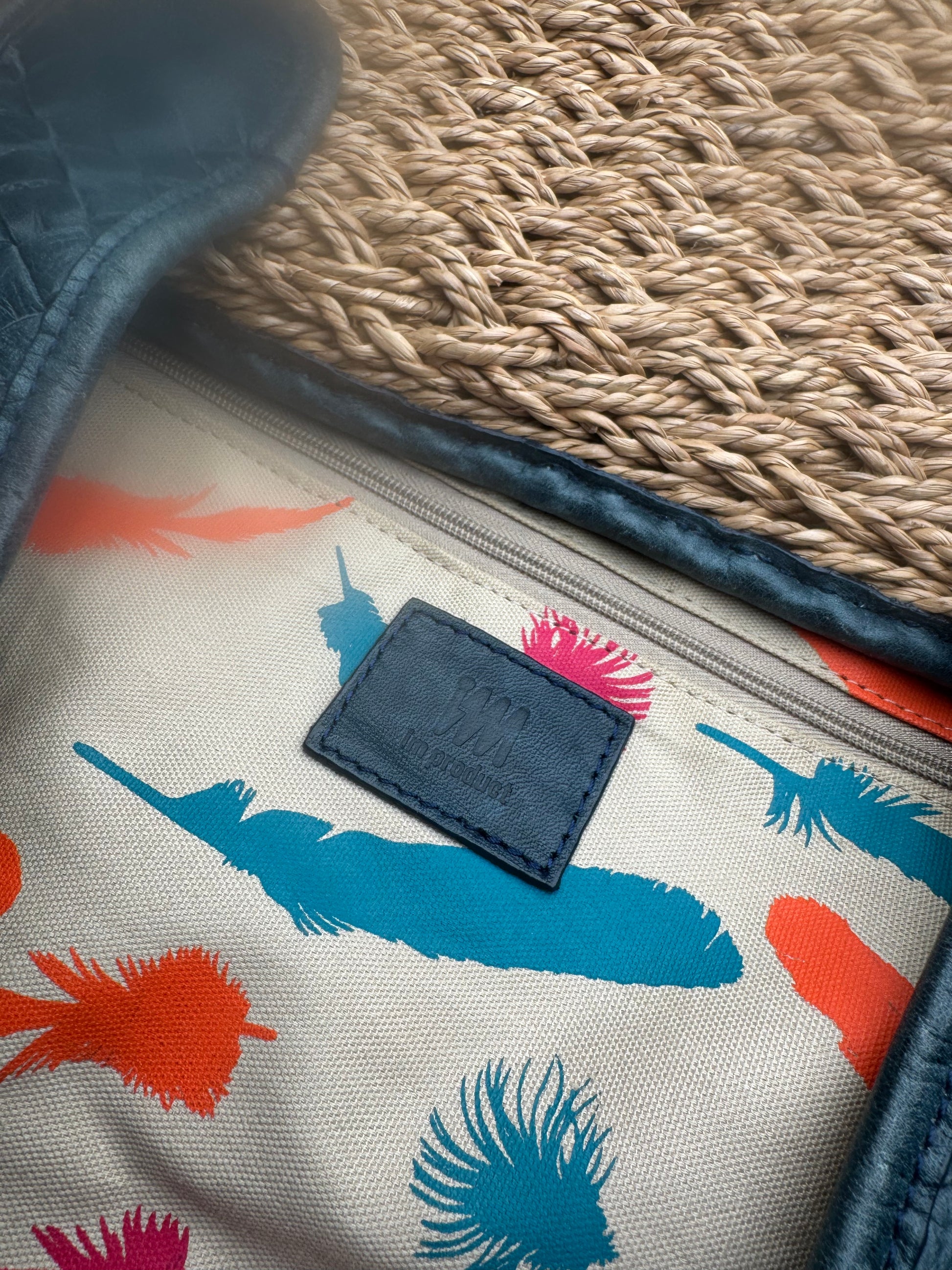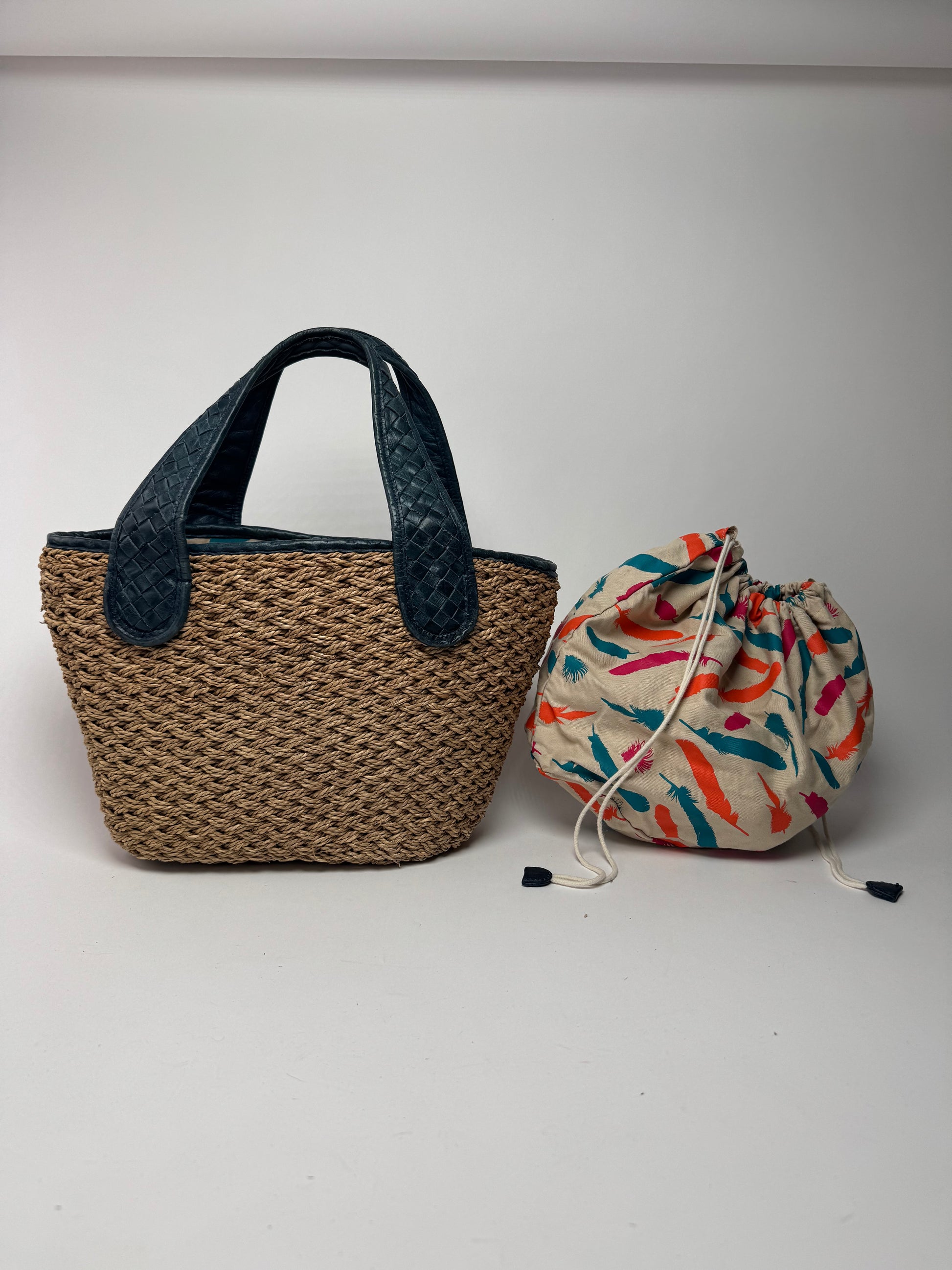 This chic handbag is finely crafted of woven straw in a warm brown tone. The handles and trim are made of dark blue braided leather, adding a structured contrast to the natural texture. The interior is lined with beige canvas, playfully printed with pink, blue, and orange feather motifs. A matching drawstring pouch in the same pattern is included.