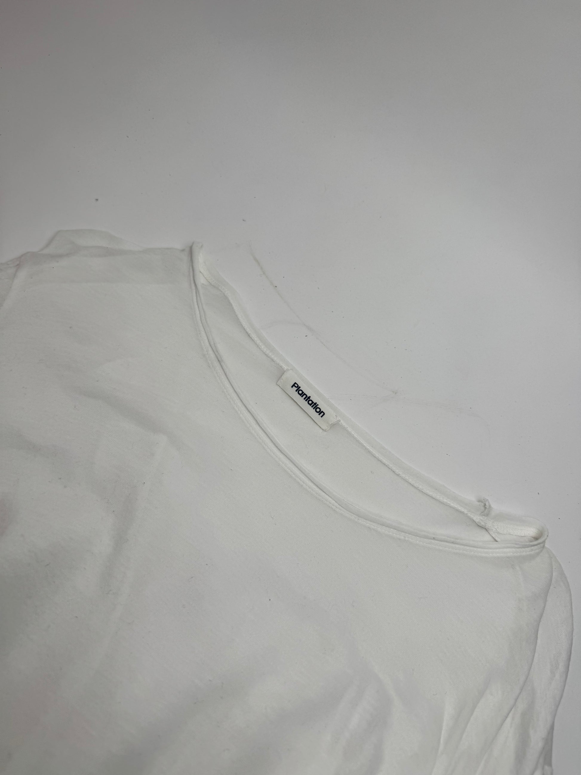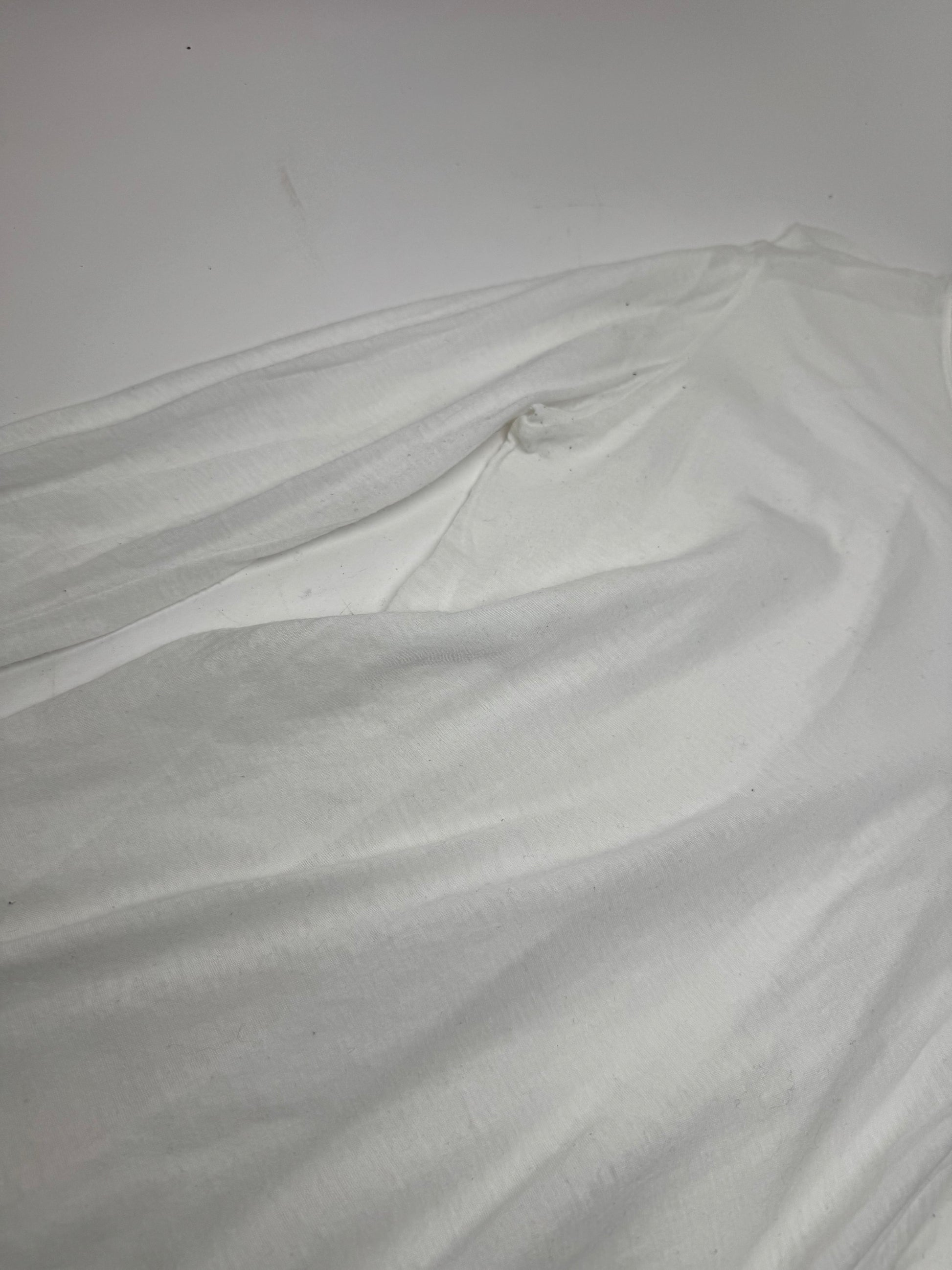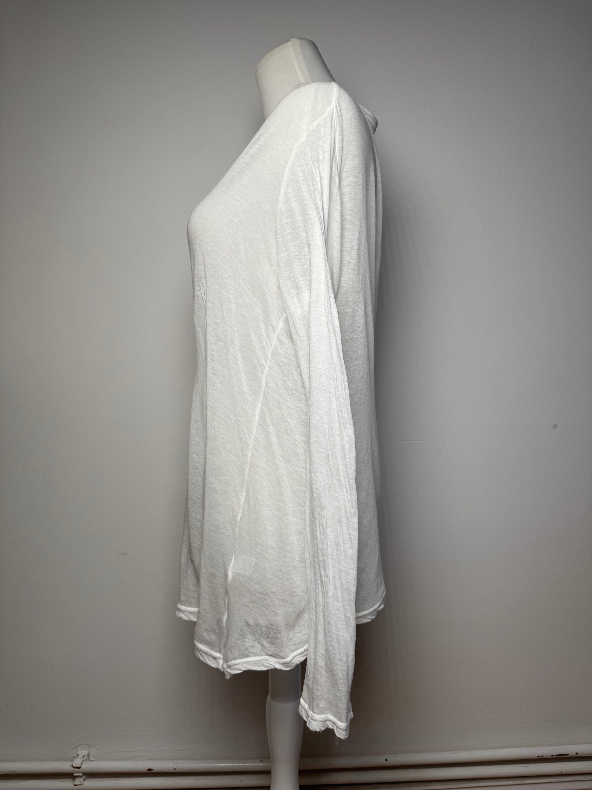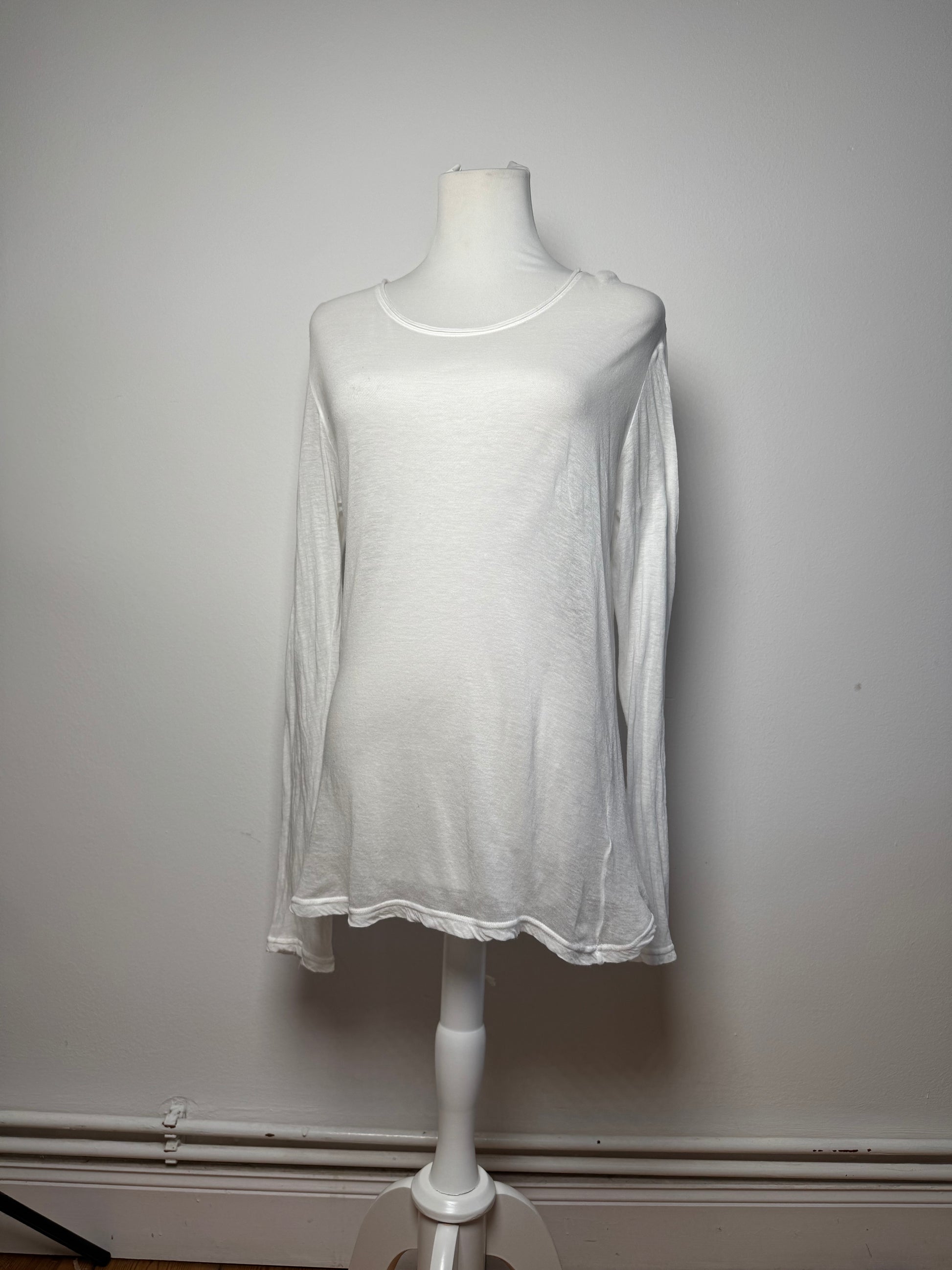 This chic top is finely crafted of a silk-like cotton blend in white with a lightweight, semi-transparent finish. It features a round neckline, long sleeves, and a naturally stretchy fit, reflecting Issey Miyake’s innovative approach to textile design. The mannequin in the photo is wearing size M.