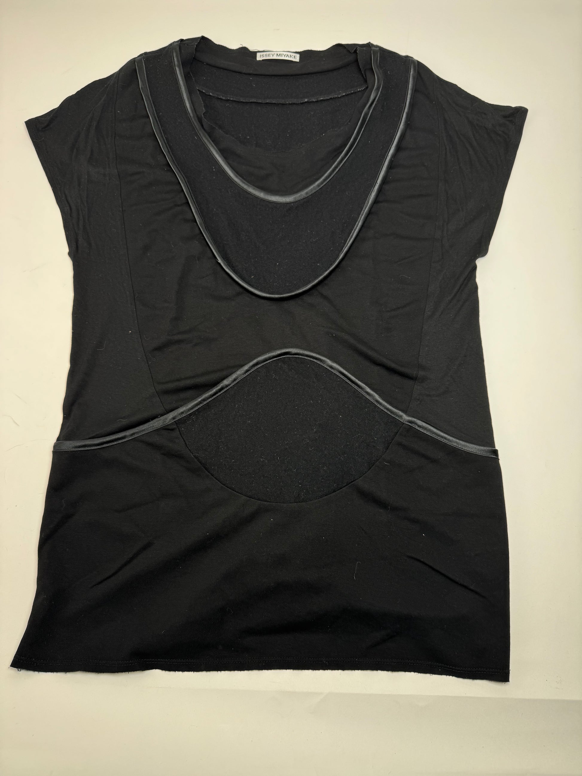 This avant-garde style top is crafted from a black cotton and polyester blend, featuring Issey Miyake’s signature sculptural design. Size is M.