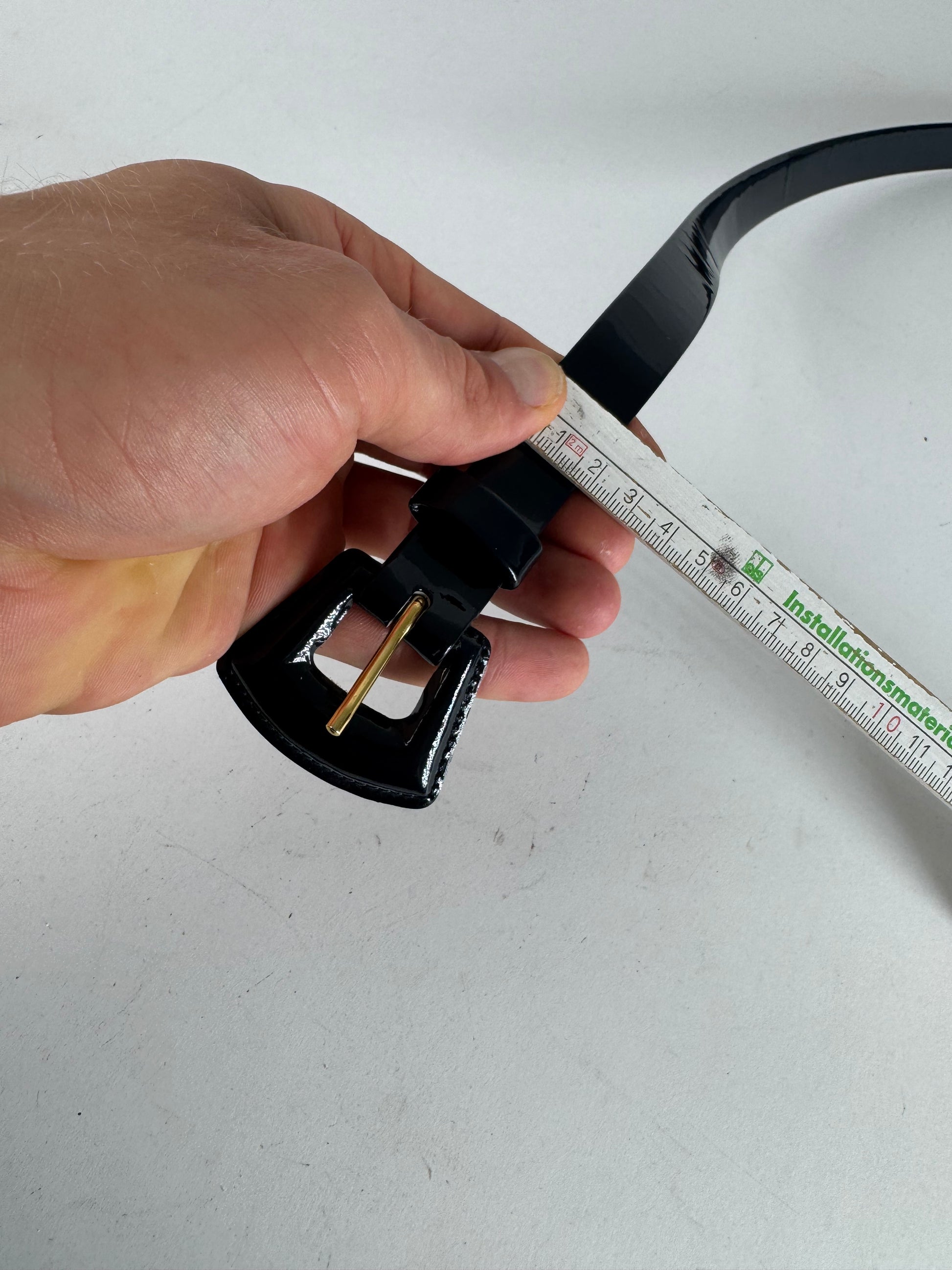 This sleek unisex belt is crafted from navy patent leather and features a black plastic buckle.