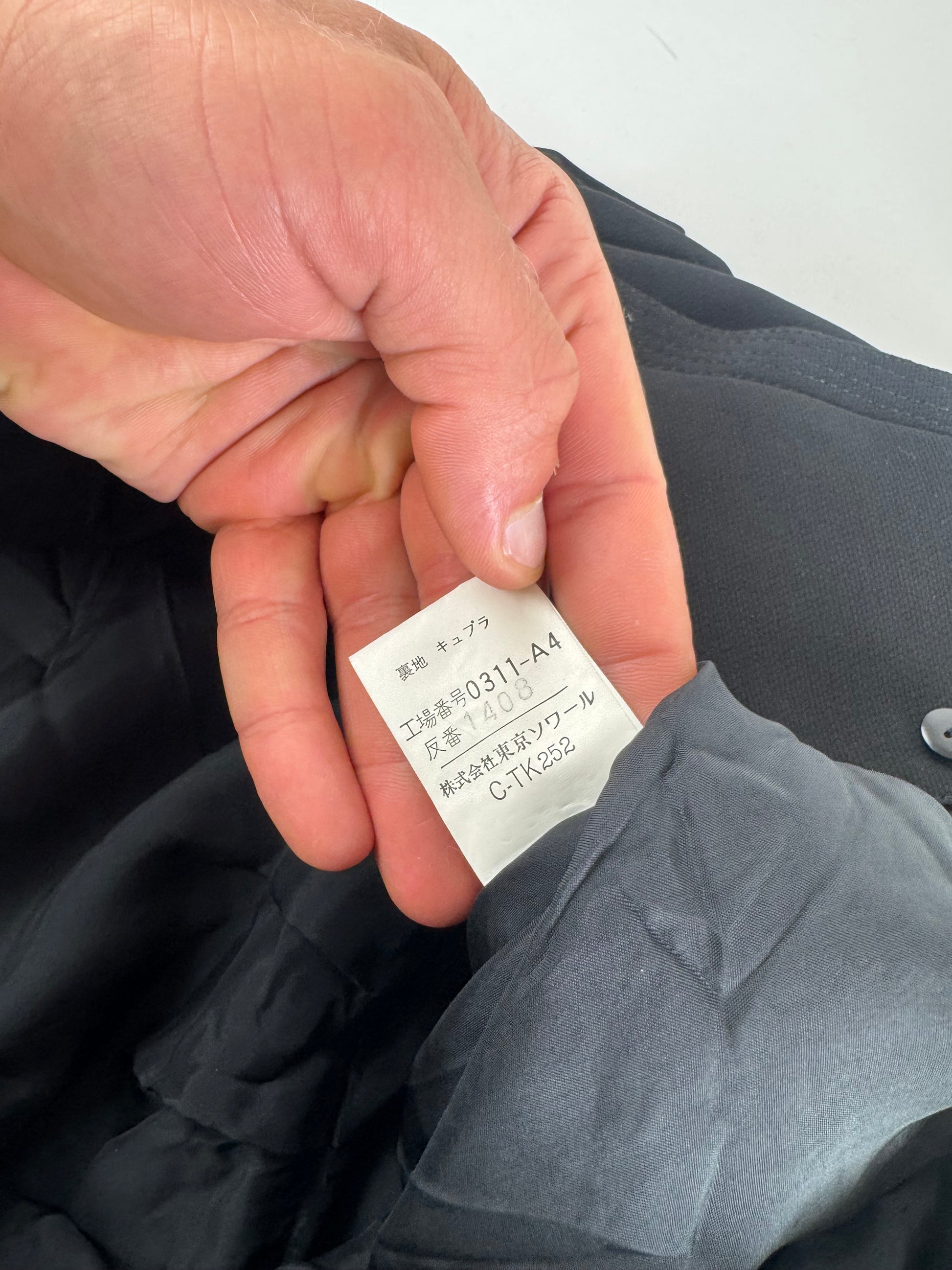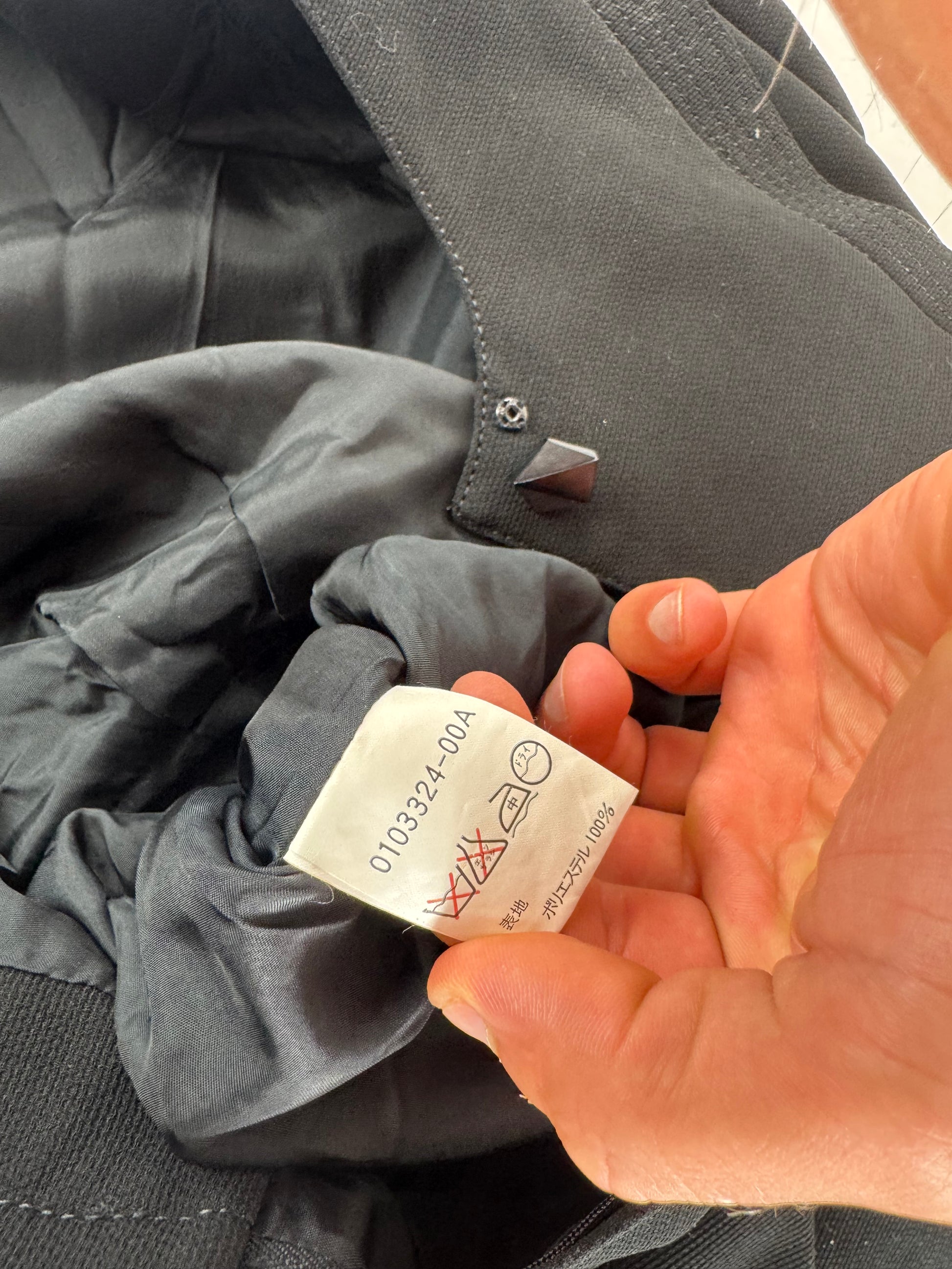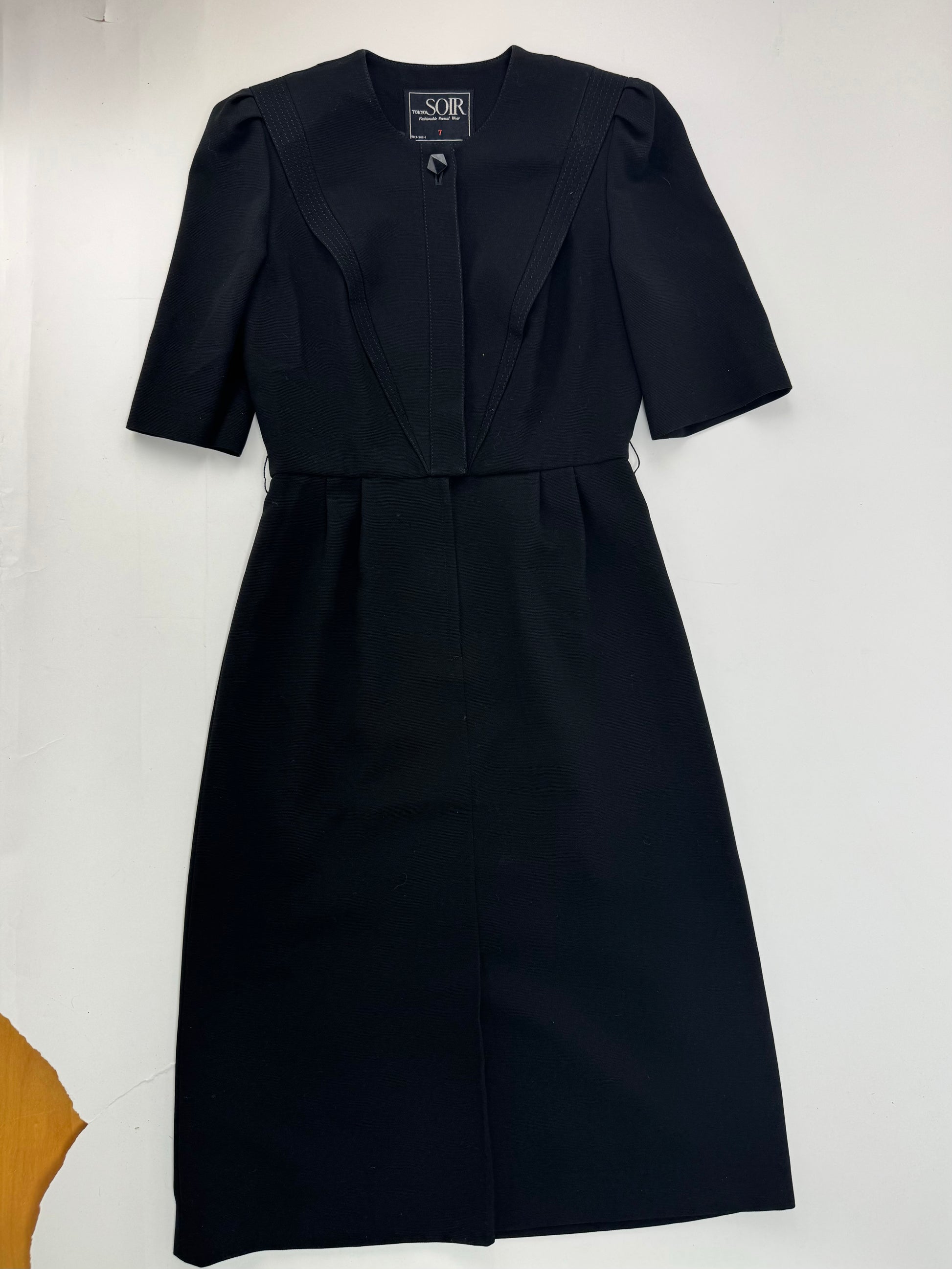 This chic dress features a classic black wool design with black plastic buttons and a timeless silhouette.