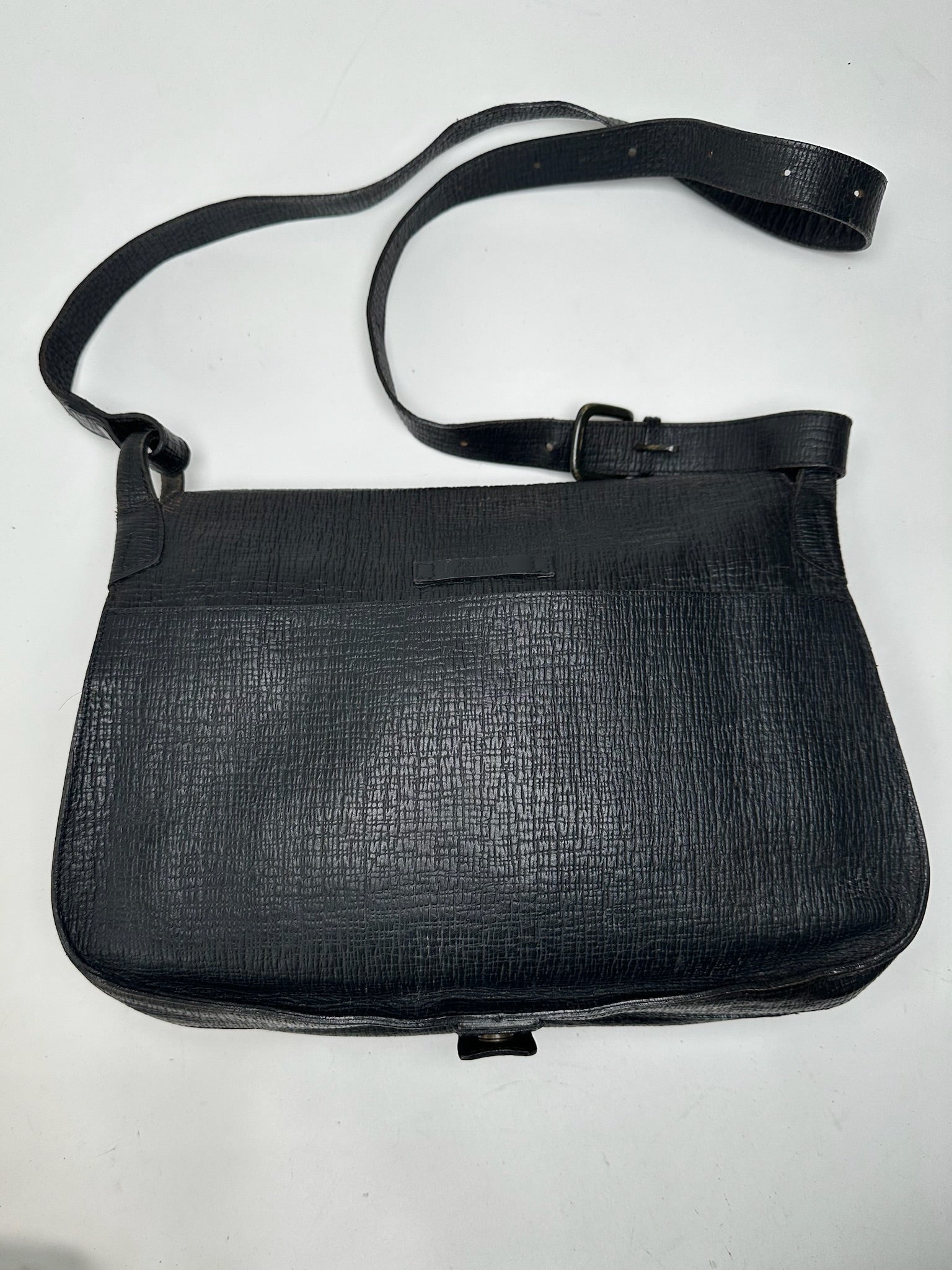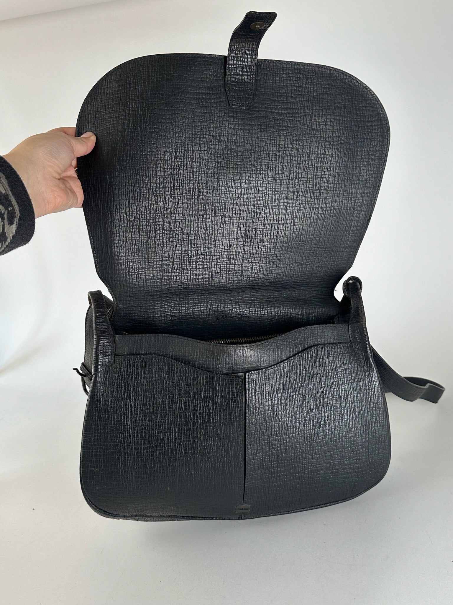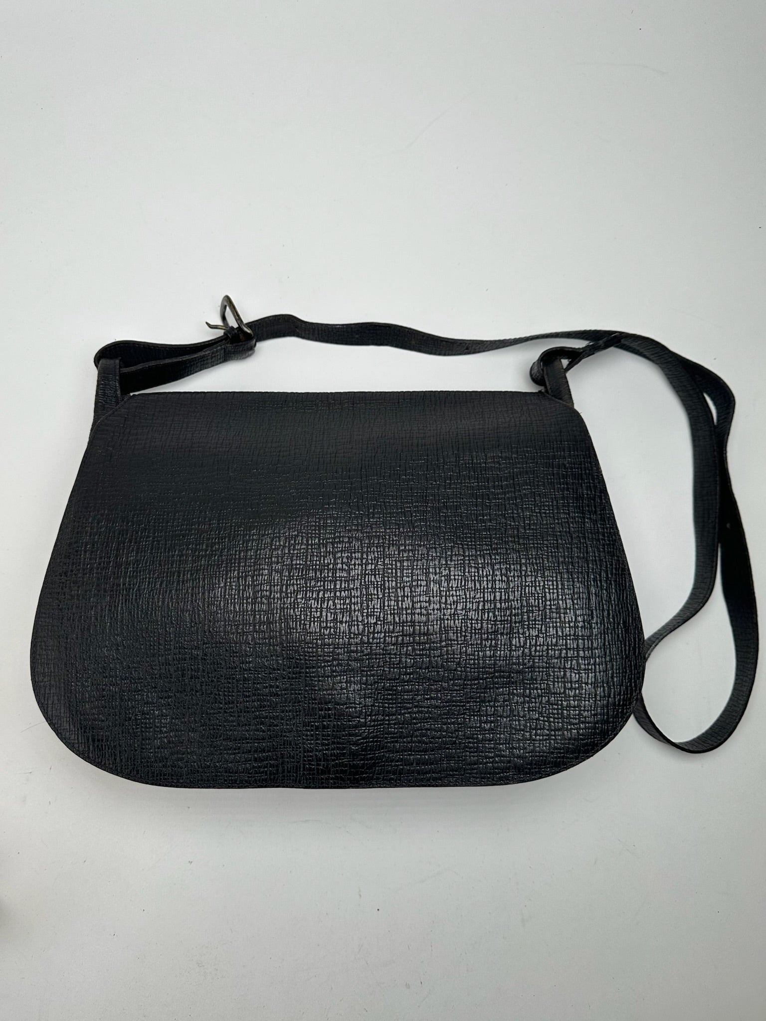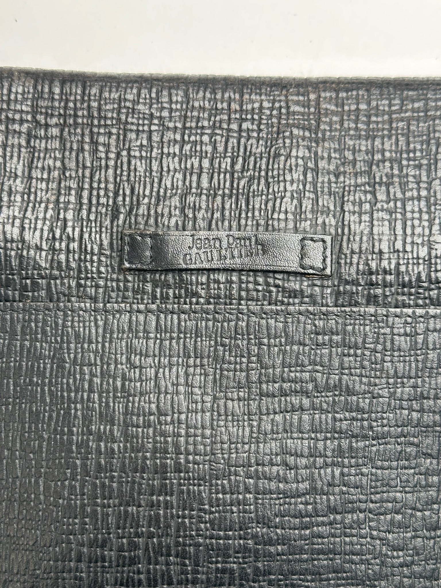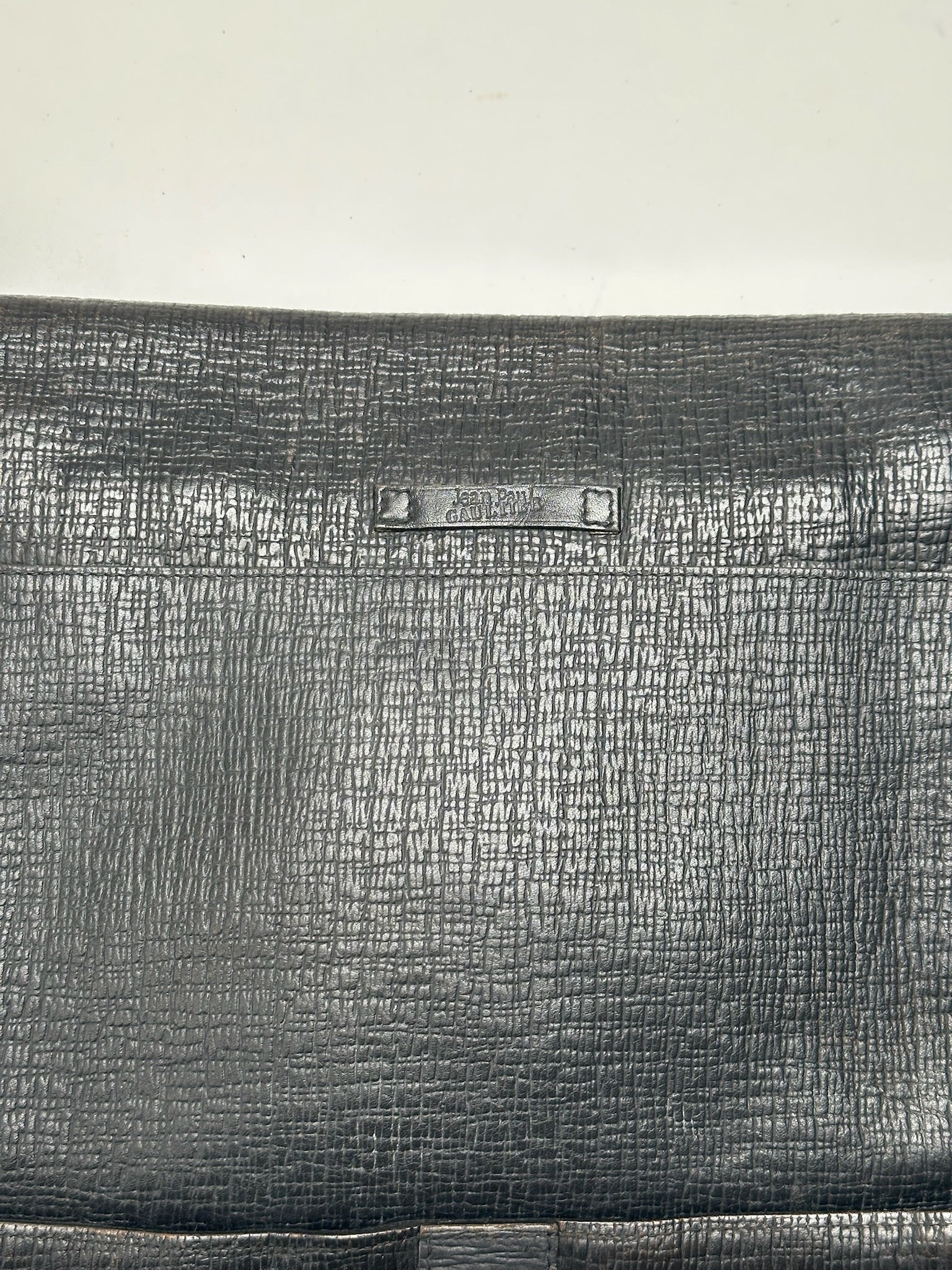 JEAN PAUL GAULTIER Vintage Bag. This unique unisex bag is finely crafted of black textured leather and features black-tone steel hardware. It comes with an adjustable strap that can also be converted into a handle, offering versatile styling options. The flap closure adds a classic touch to the bold design.