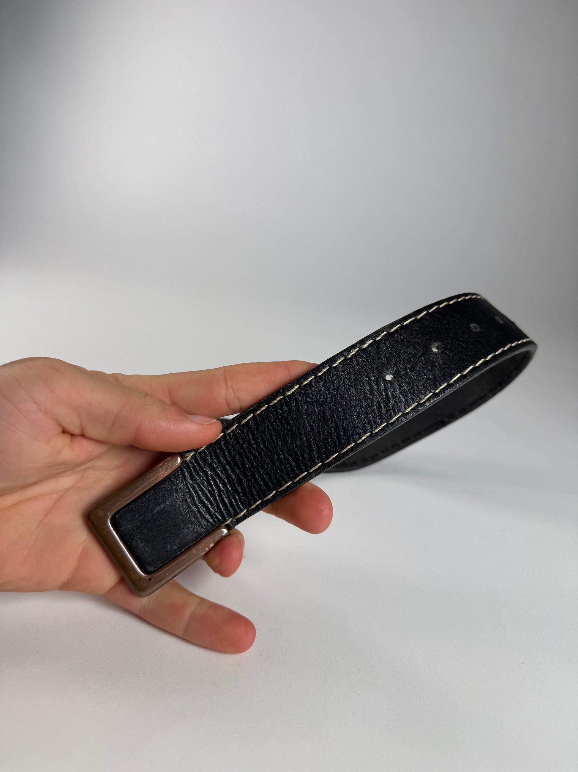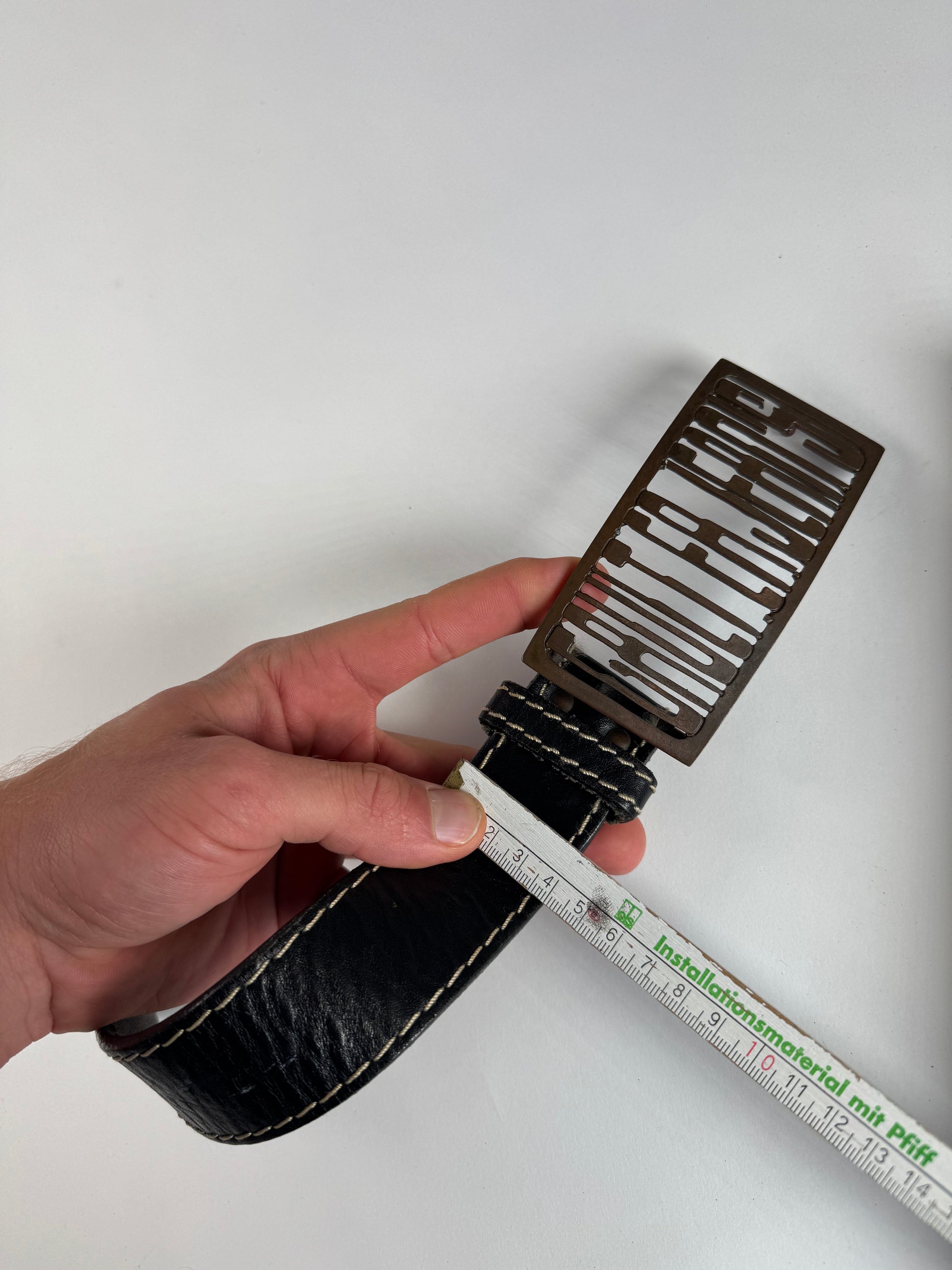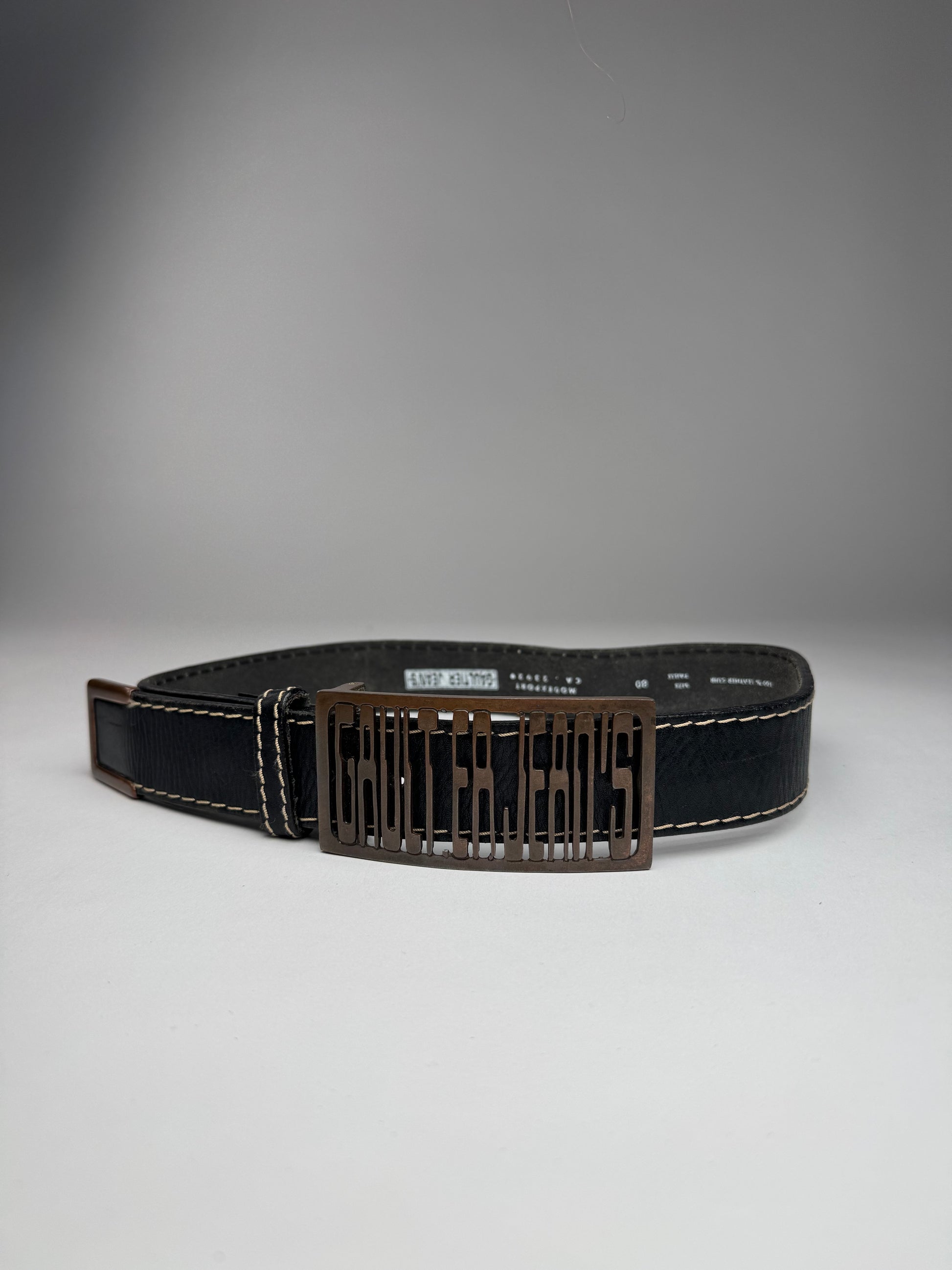 This stylish vintage belt from Jean Paul Gaultier is made of brown leather with white stitching details. The buckle is large and features a bronze-colored steel design. The belt is unisex and in new-like condition, with a serial number of 23929.