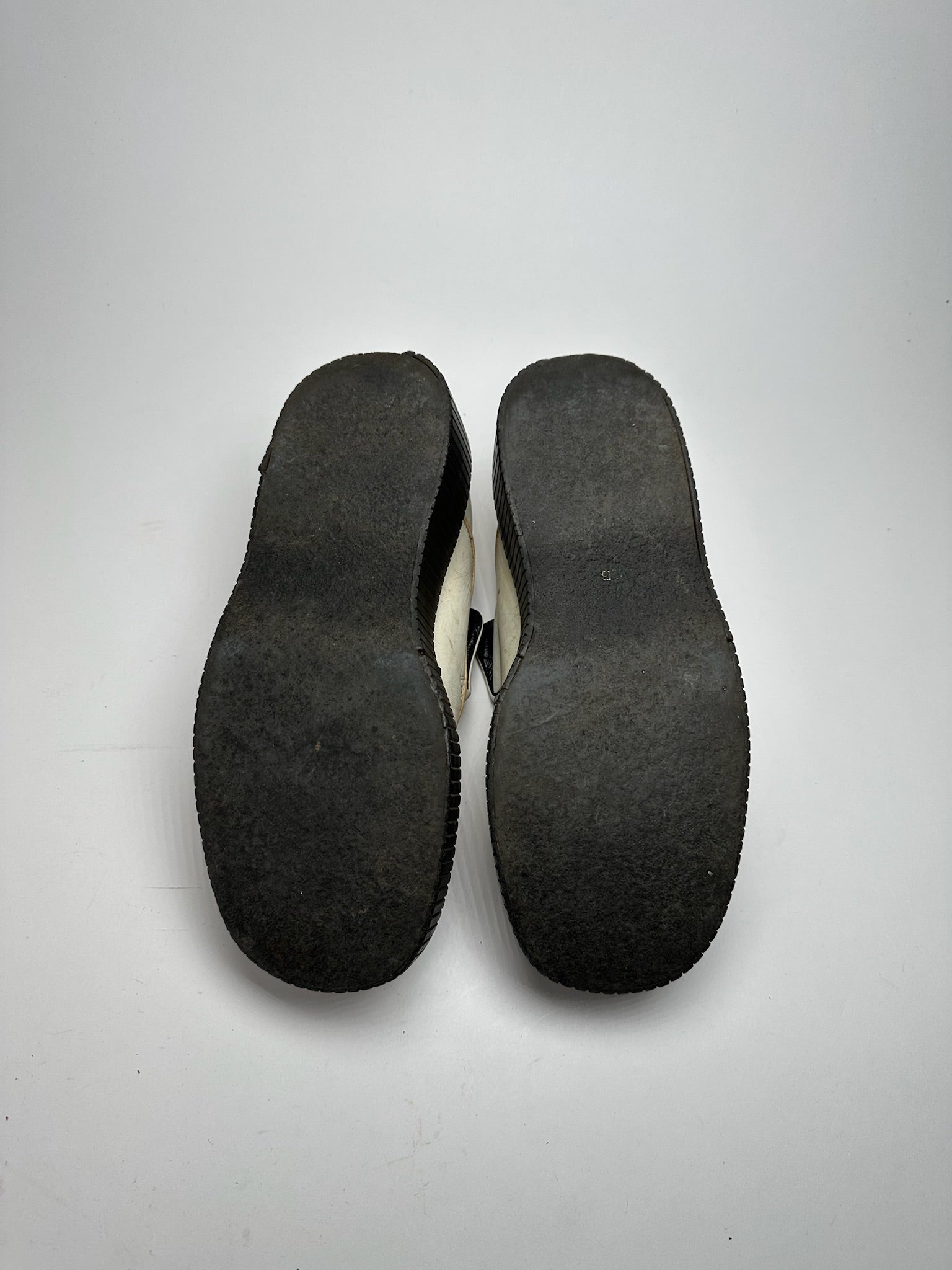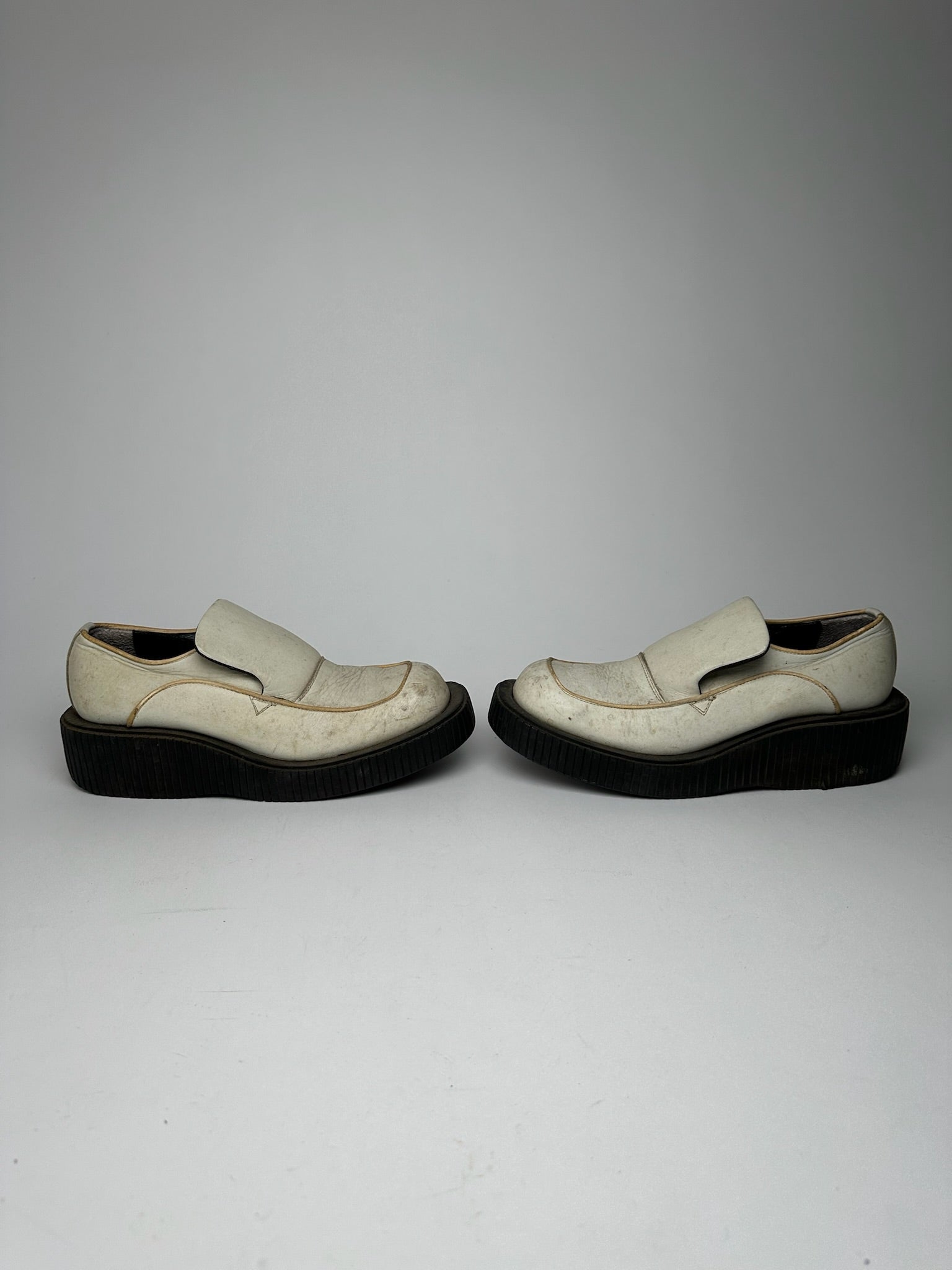 These chic loafers from the 1980s are crafted from white leather and feature a sleek silhouette with a contrasting black rubber sole. A rare vintage piece by Jean Paul Gaultier that blends bold design with timeless form.