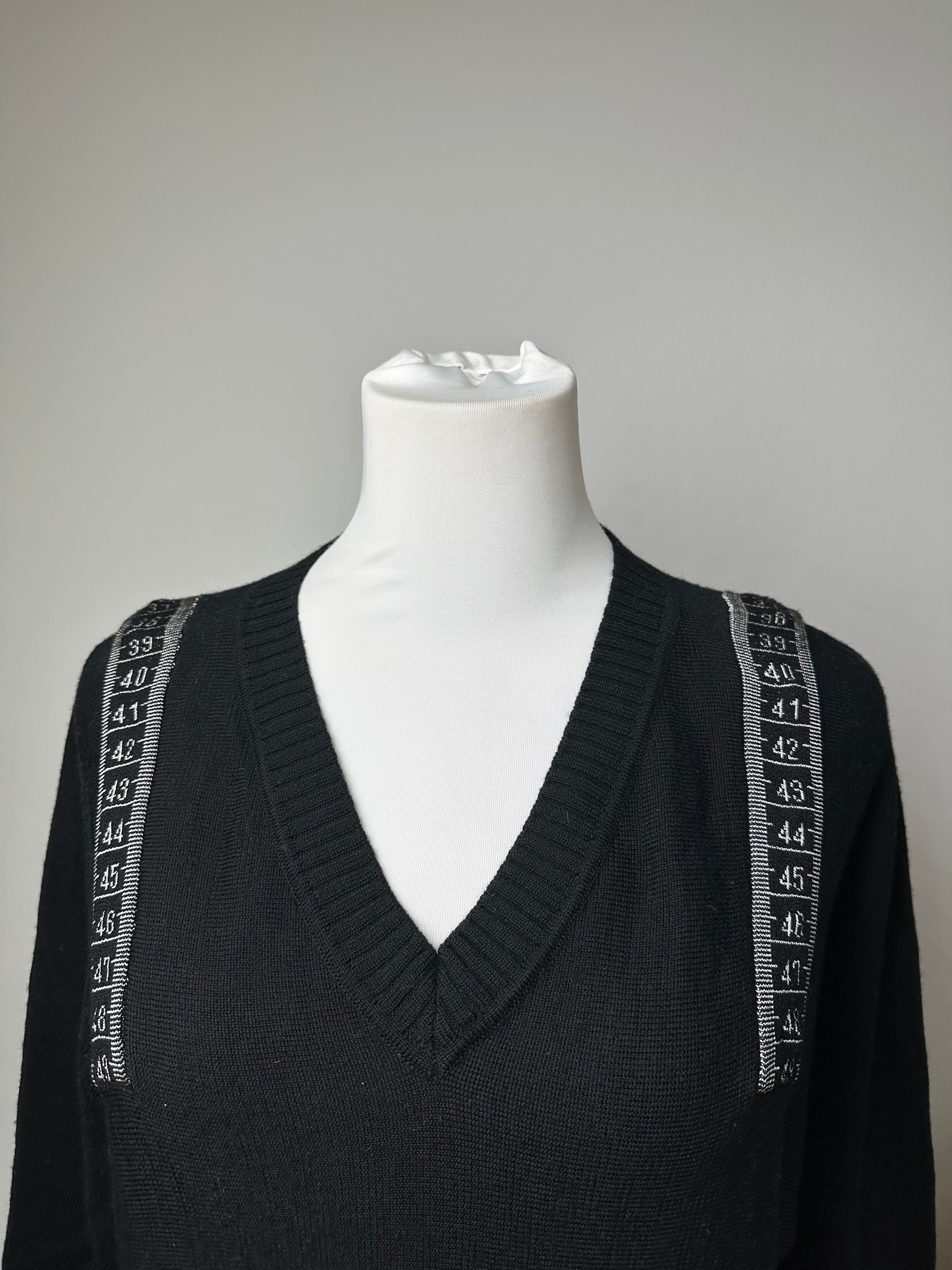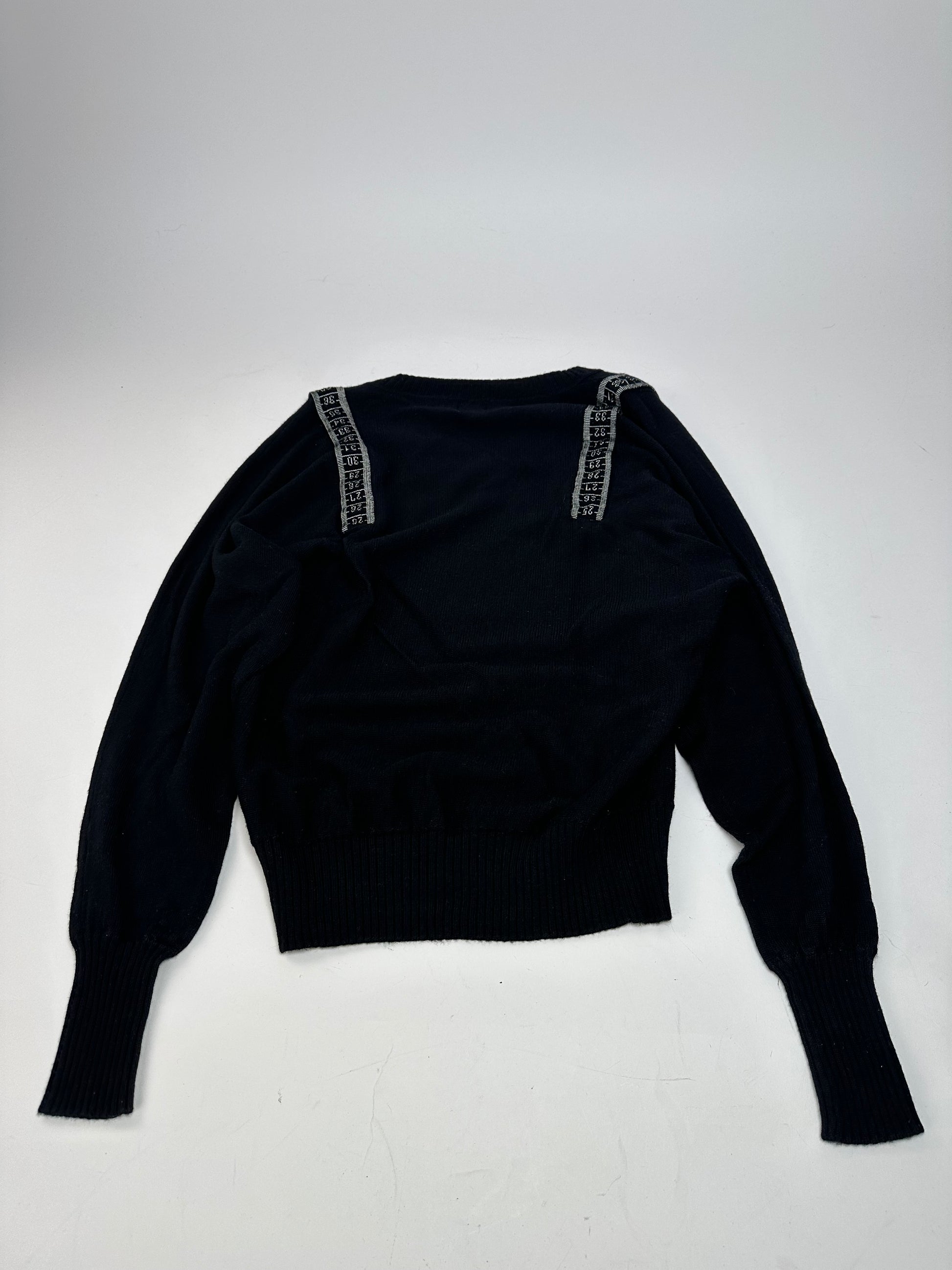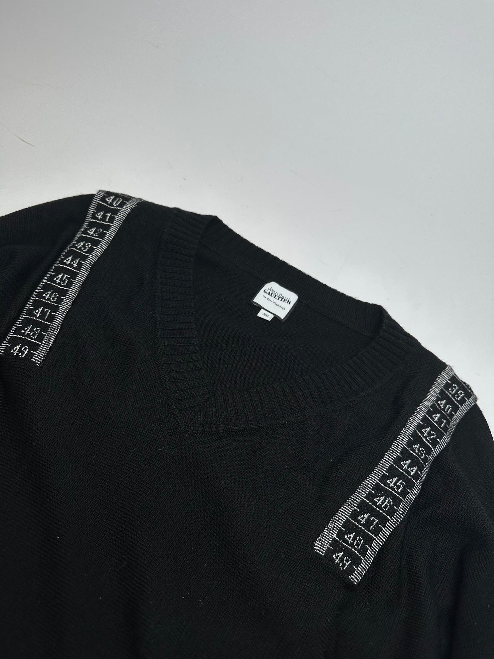 JEAN PAUL GAULTIER Vintage Wool Sweater. This distinctive vintage sweater is finely crafted of soft wool and features a small V-neckline. The design is accented with black and white measuring tape appliqué details around the collar, reflecting the brand’s avant-garde tailoring heritage. The mannequin in the photos is size 38/M.