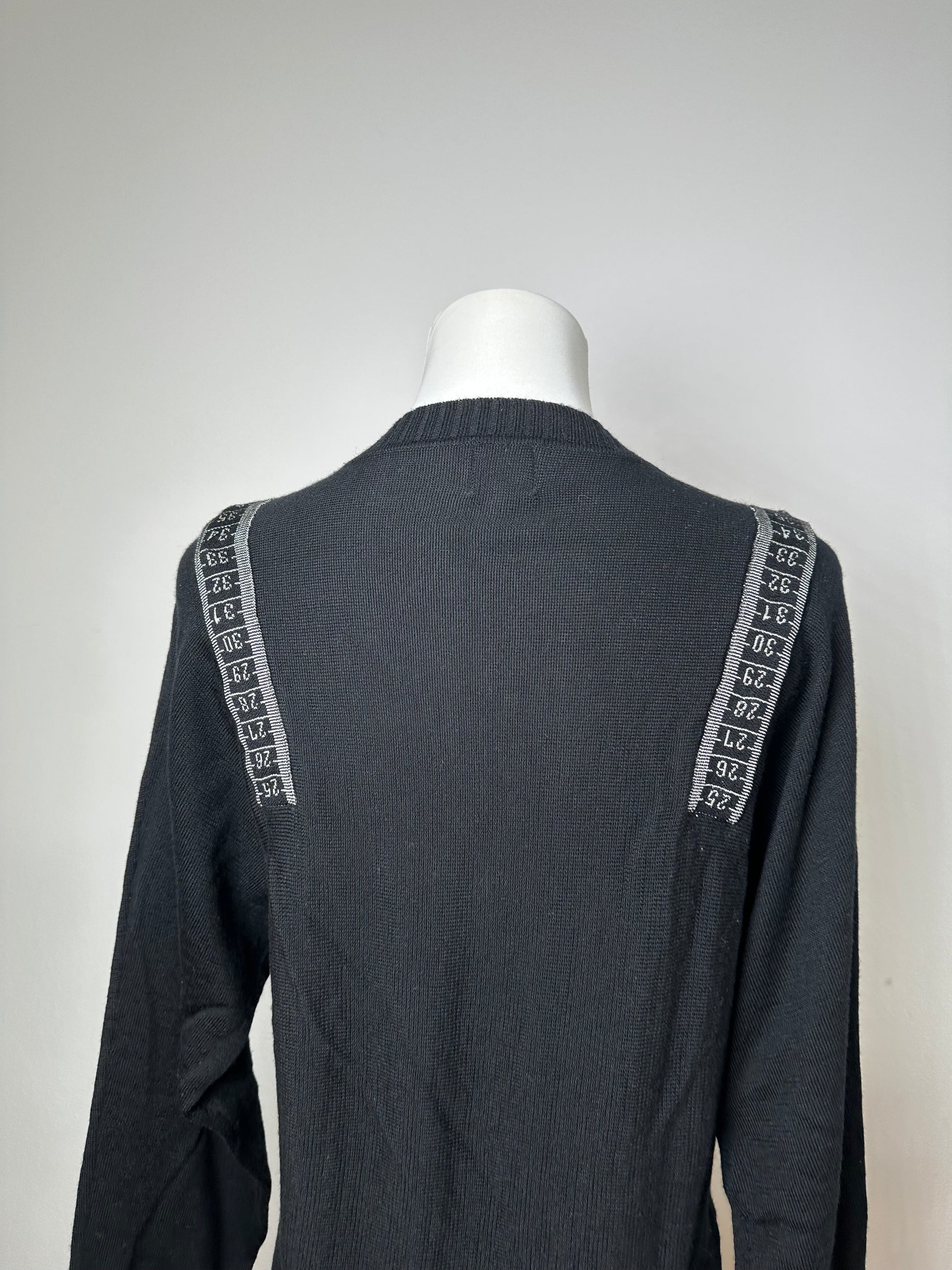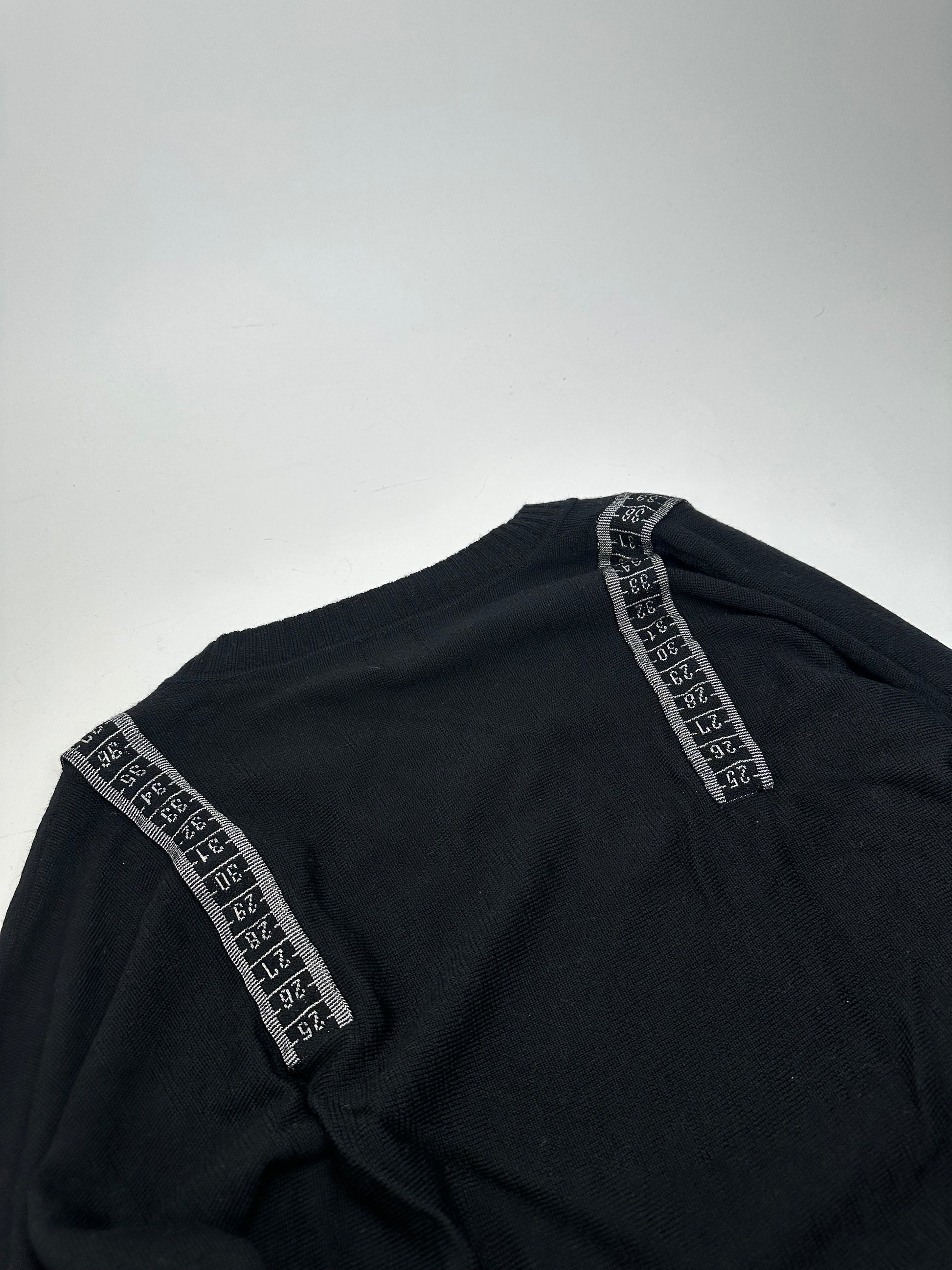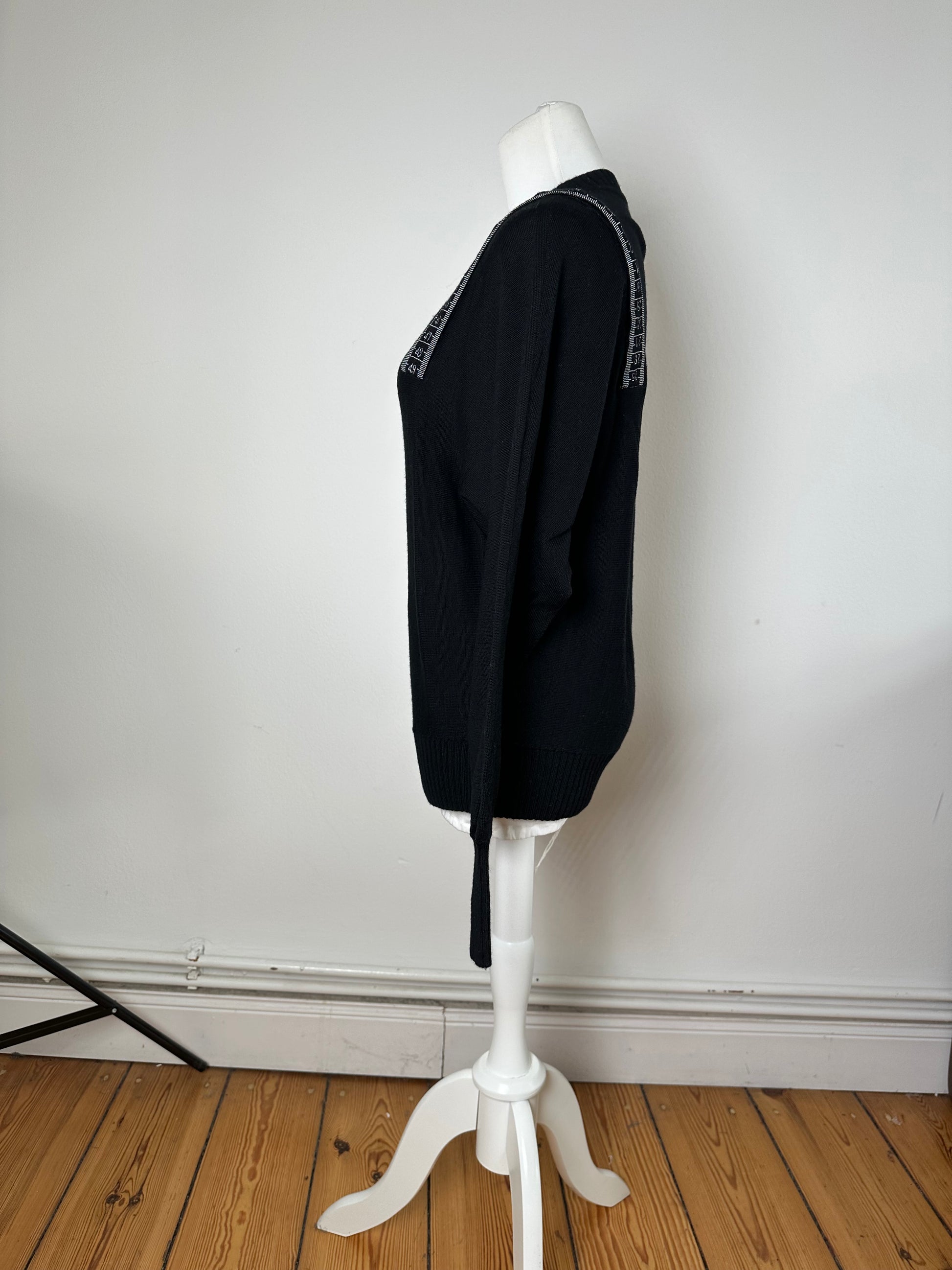 JEAN PAUL GAULTIER Vintage Wool Sweater. This distinctive vintage sweater is finely crafted of soft wool and features a small V-neckline. The design is accented with black and white measuring tape appliqué details around the collar, reflecting the brand’s avant-garde tailoring heritage. The mannequin in the photos is size 38/M.