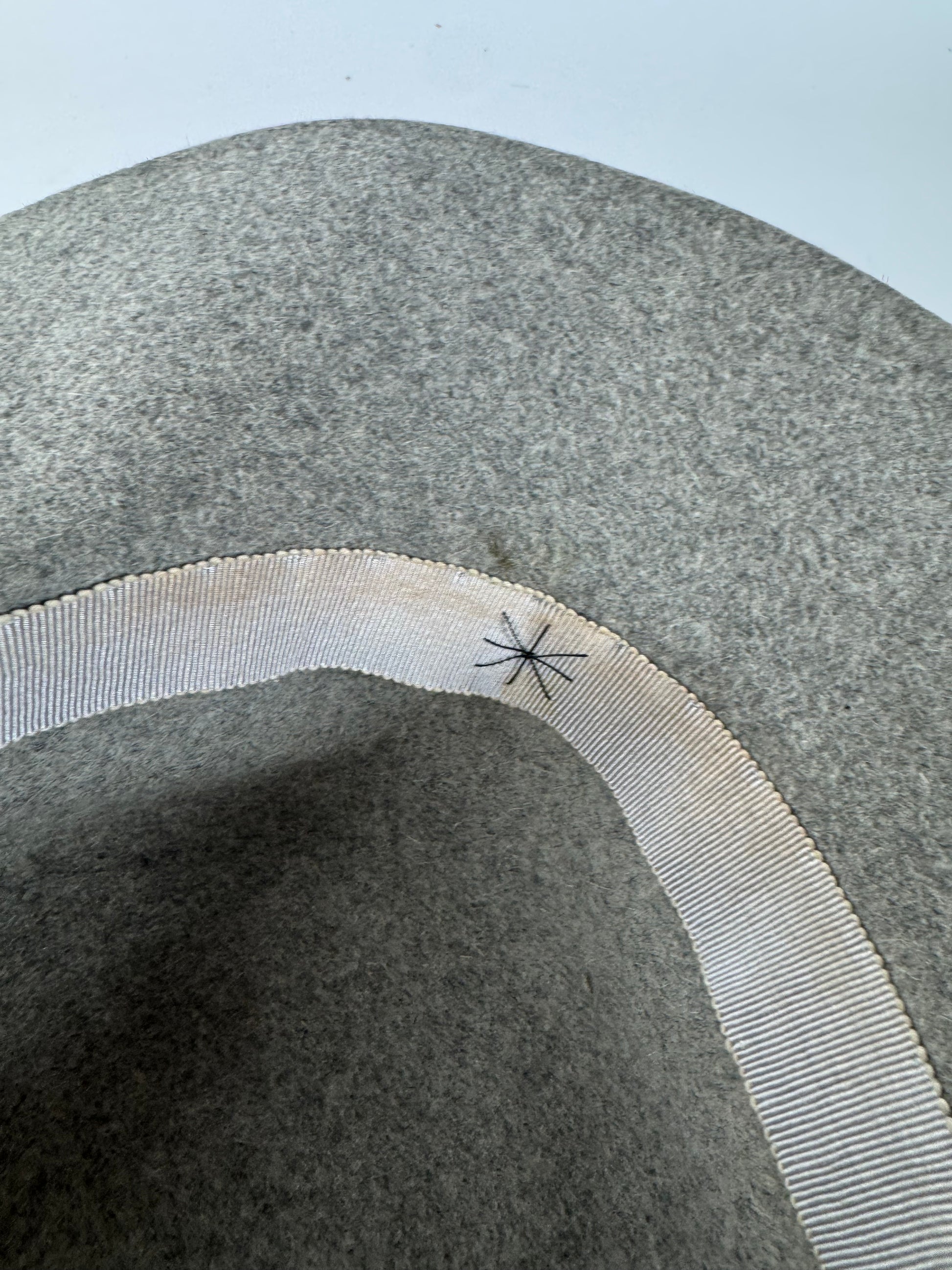 This elegant vintage hat by Jil Sander is finely crafted of grey wool in a refined Panama-style design. It features matching grey feathers and a khaki-colored canvas ribbon accent, blending classic craftsmanship with minimalist sophistication. The piece is unisex and showcases Jil Sander’s timeless aesthetic.