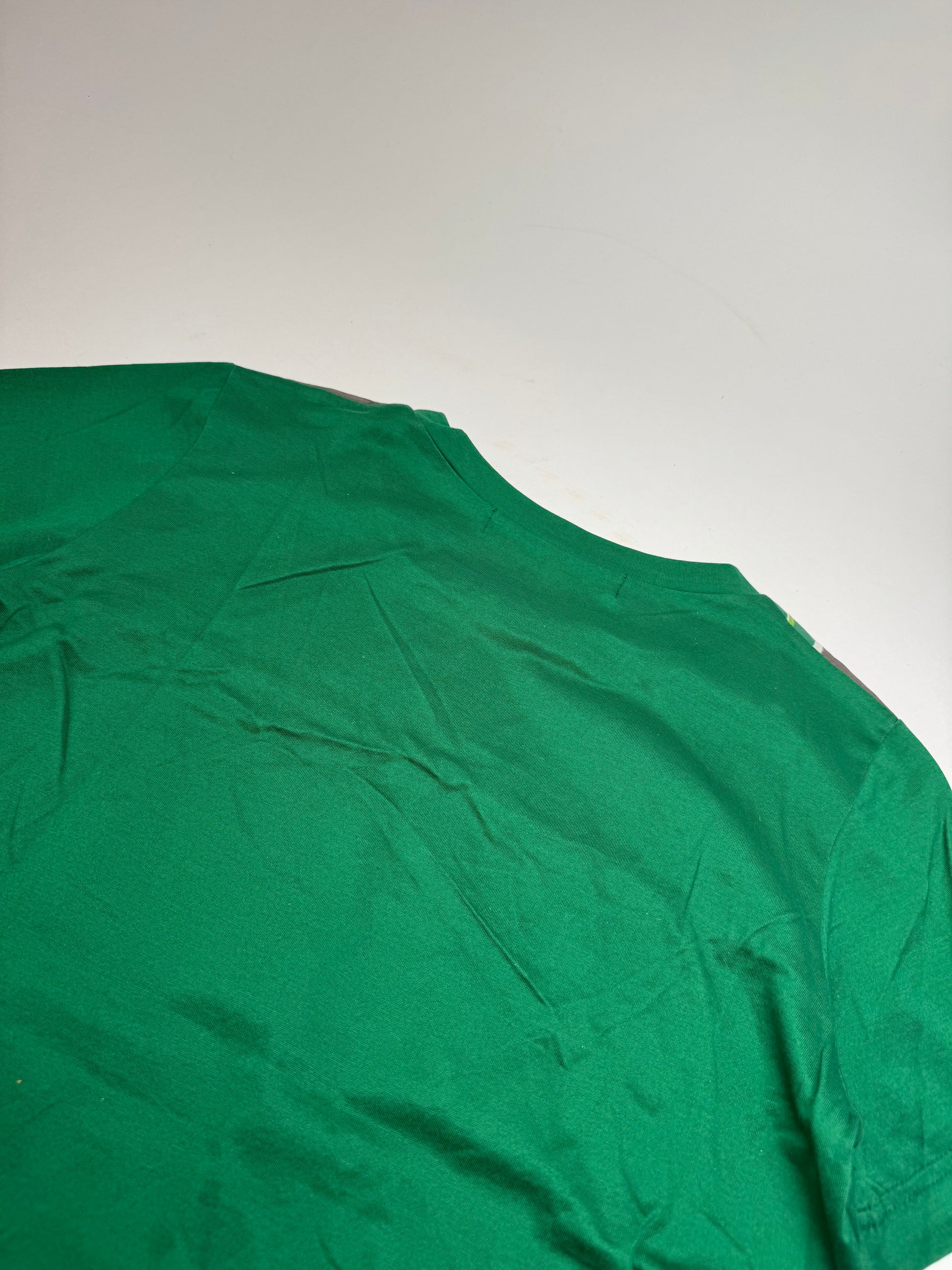 This distinctive vintage T-shirt is crafted from cotton in a green base colour and features a patterned neckline detail in white, green, and brown. The mannequin shown in the photos is size 38/M. Made in Japan.