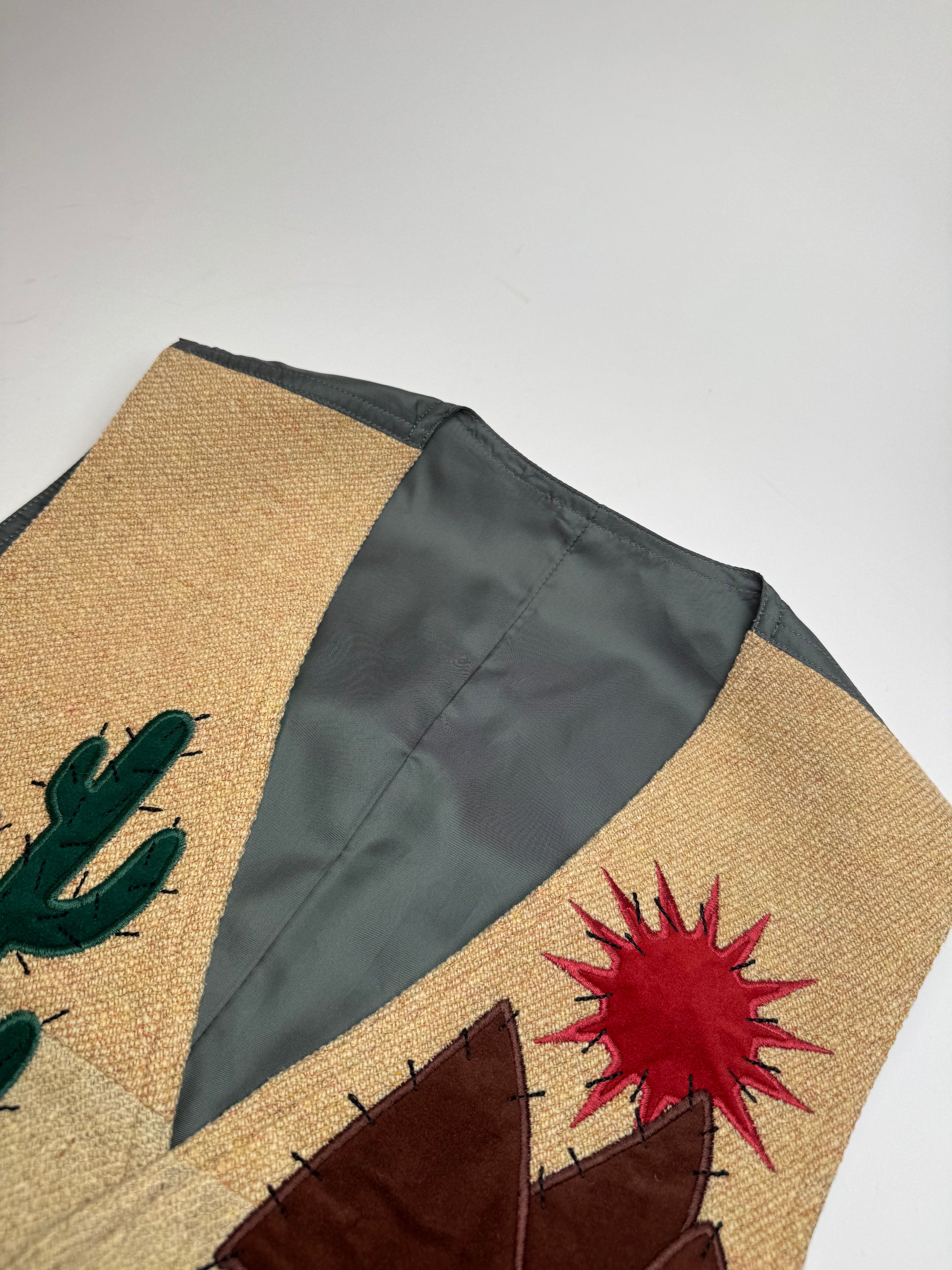 This distinctive vintage men’s vest is crafted from beige linen and features striking white-and-black plastic buttons with a granite-effect finish. The front is detailed with a decorative inlay depicting a green cactus, red sun, brown mountains, and blue water, creating a bold artistic statement. Founded by Kansai Yamamoto, the brand became internationally renowned in the 1970s and 1980s for its avant-garde designs, vibrant graphics, and theatrical approach to fashion, famously worn by global icons. The back is finished in silver silk and includes an adjustable strap for a tailored fit.