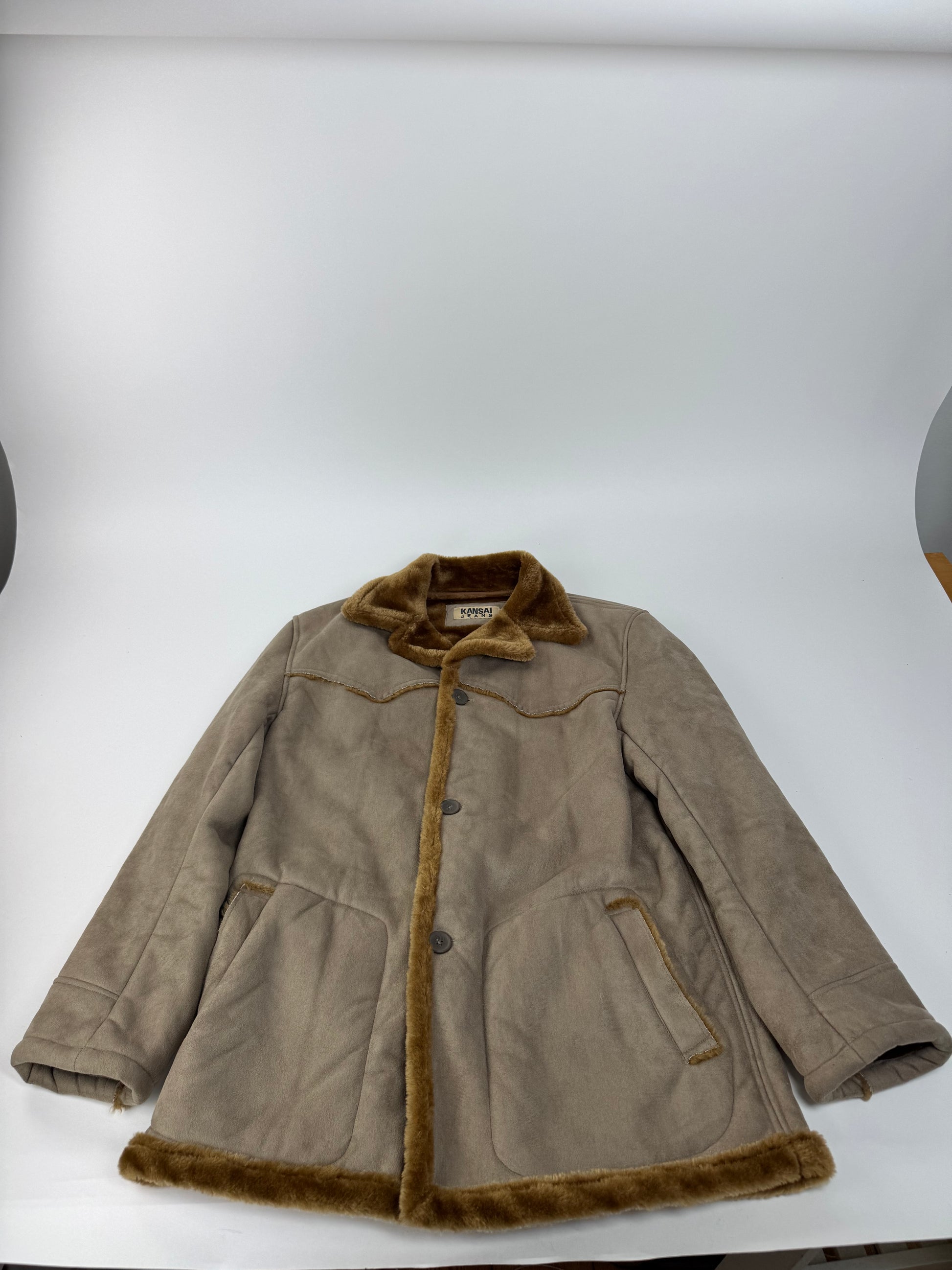 KANSAI YAMAMOTO Vintage Faux Leather Coat. This standout vintage coat is crafted from beige vegan leather and lined with plush brown faux fur for warmth and comfort. It features a structured shirt-style collar, grey-brown plastic buttons, and a bold early-2000s design. The coat is heavily lined and provides a striking yet practical winter silhouette.