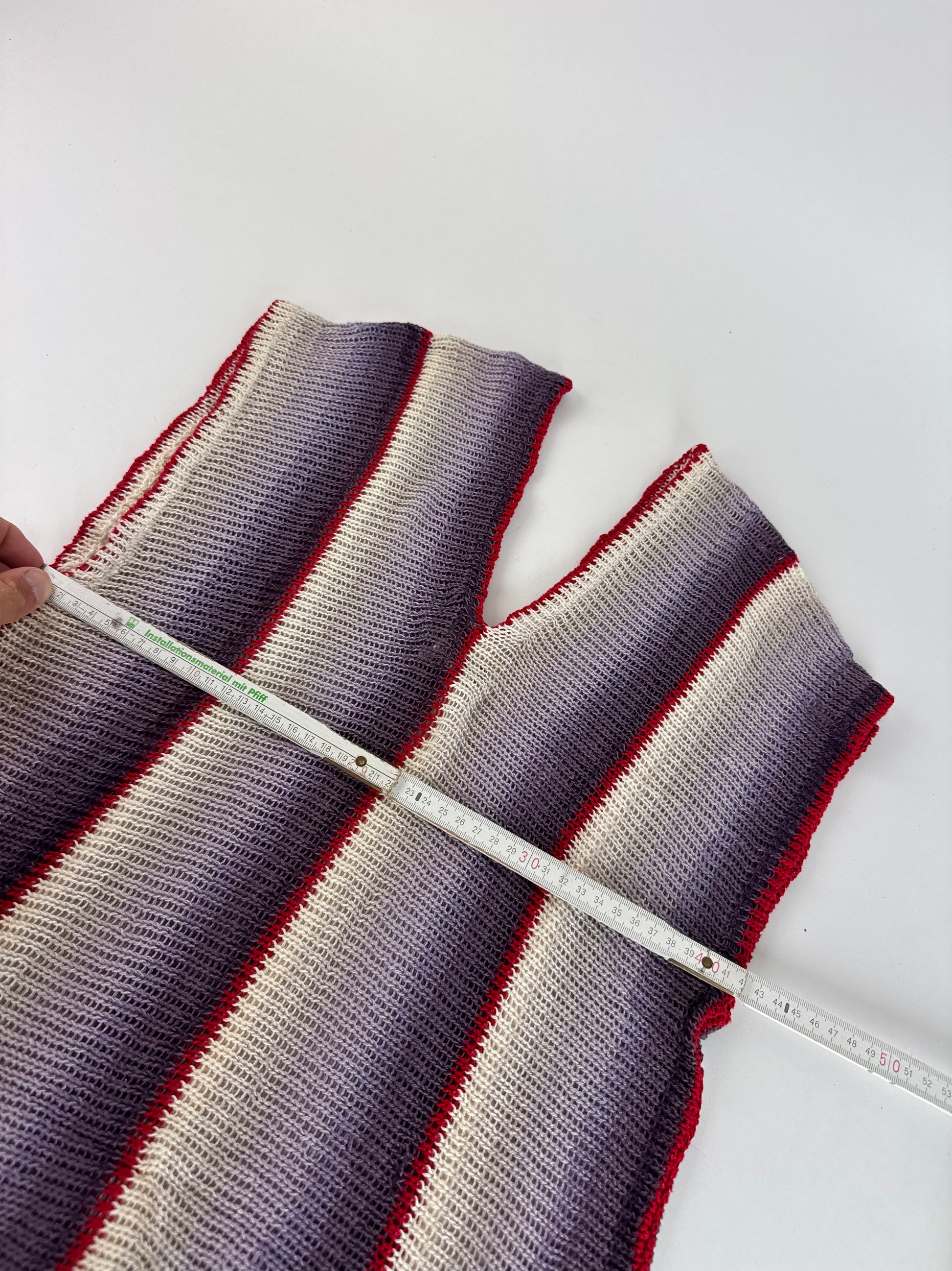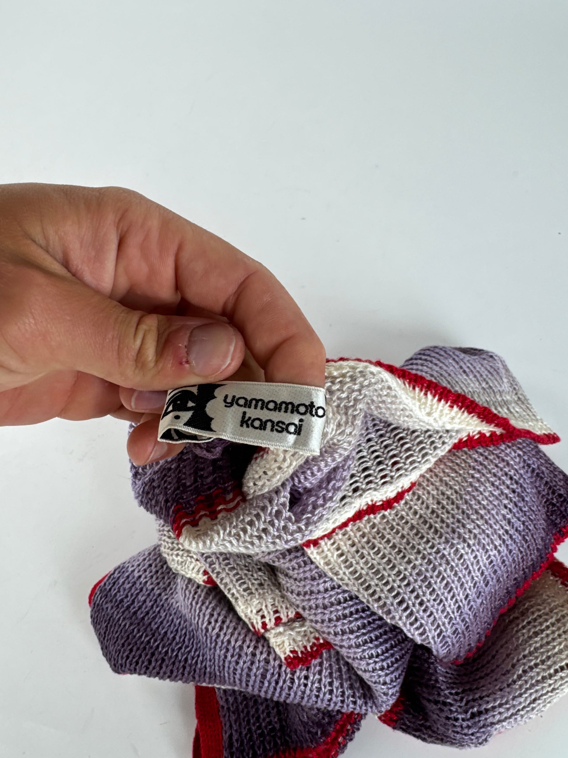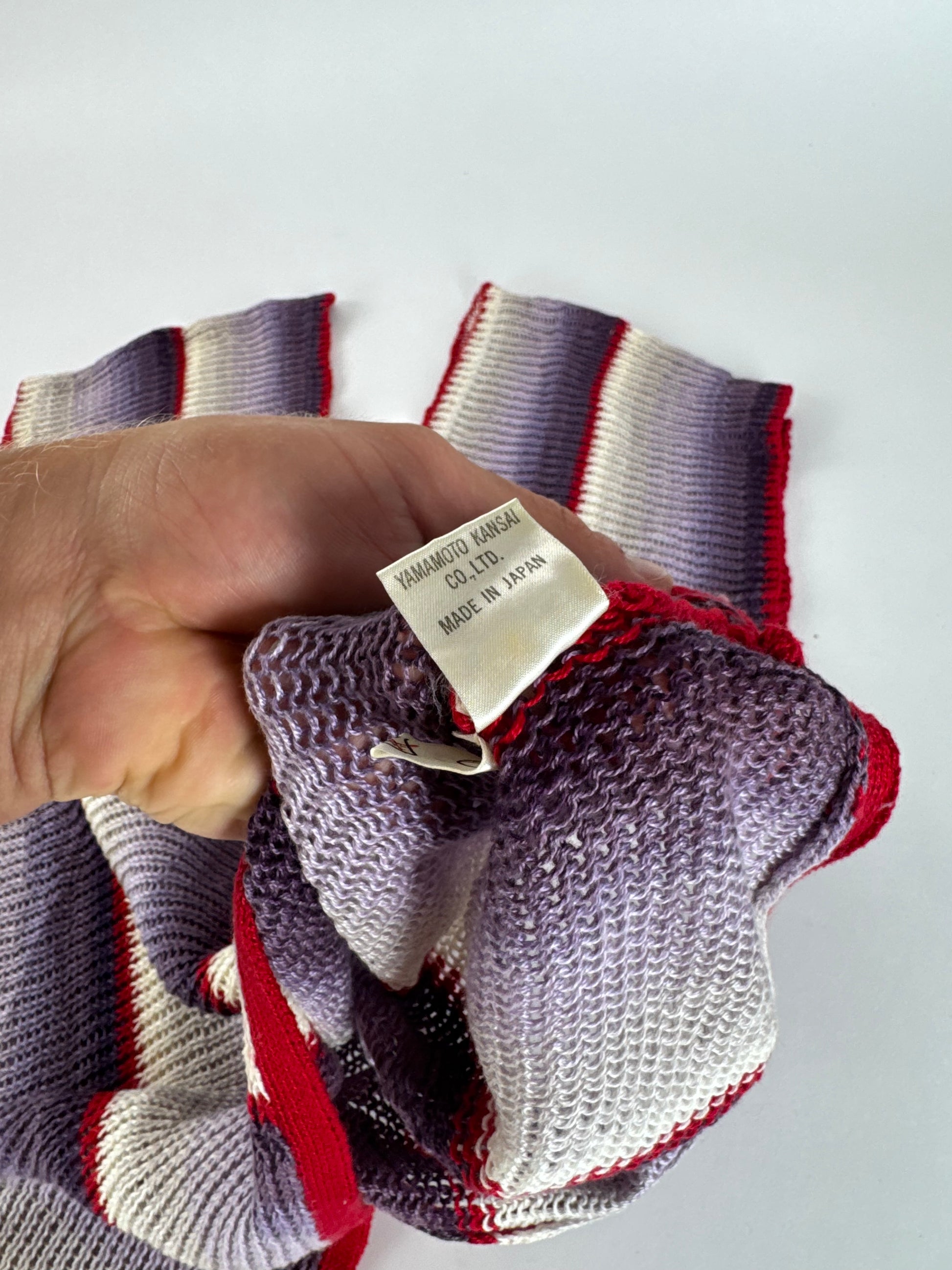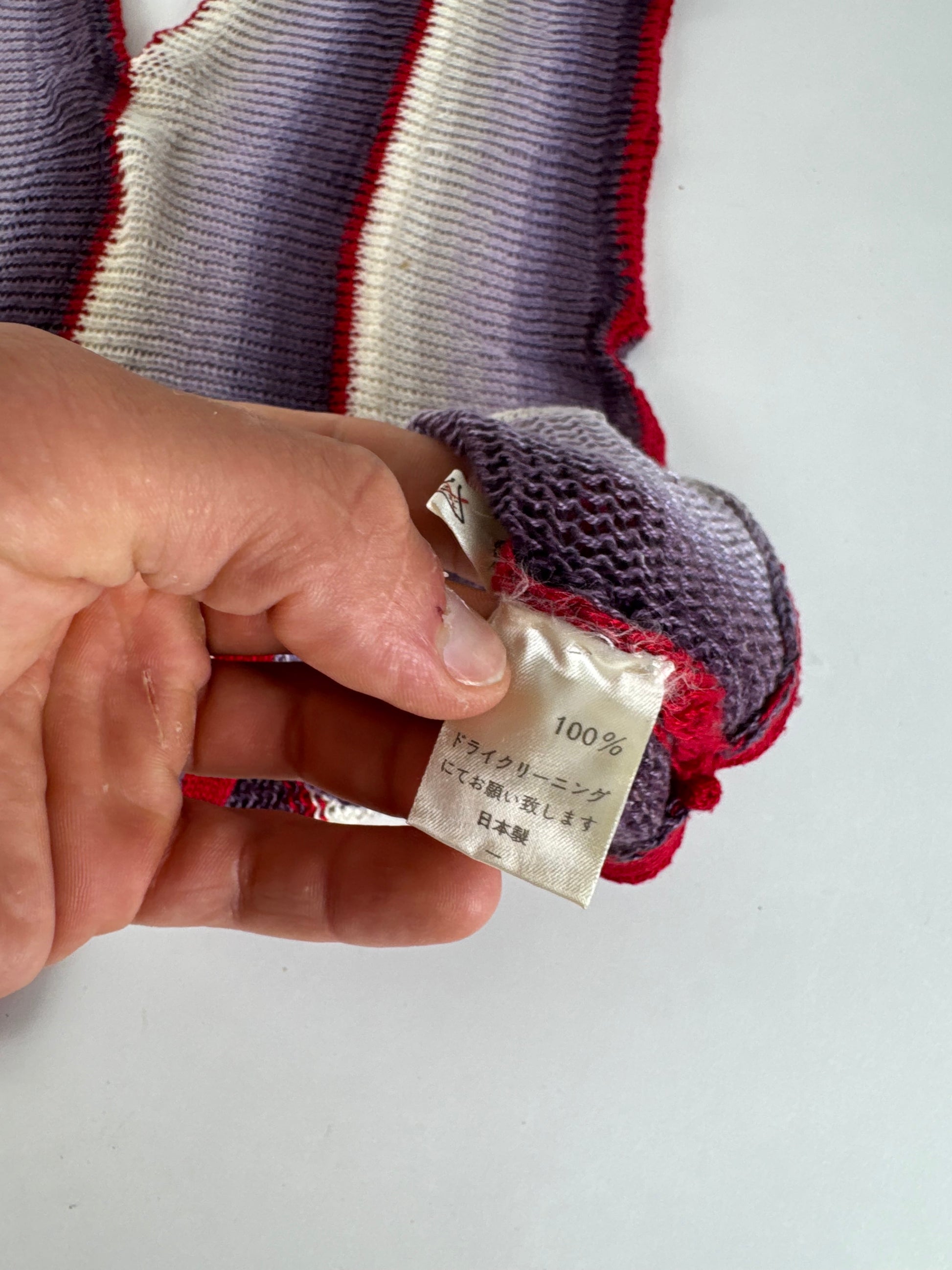 KANSAI YAMAMOTO Vintage Wool Top. This striking vintage top features a bold striped design in red, purple, black, and white. Crafted from wool with a touch of elasticity, the fabric offers both structure and comfort, though the exact composition is unknown due to a missing care label. The design includes a V-neckline and showcases the brand’s signature avant-garde style.