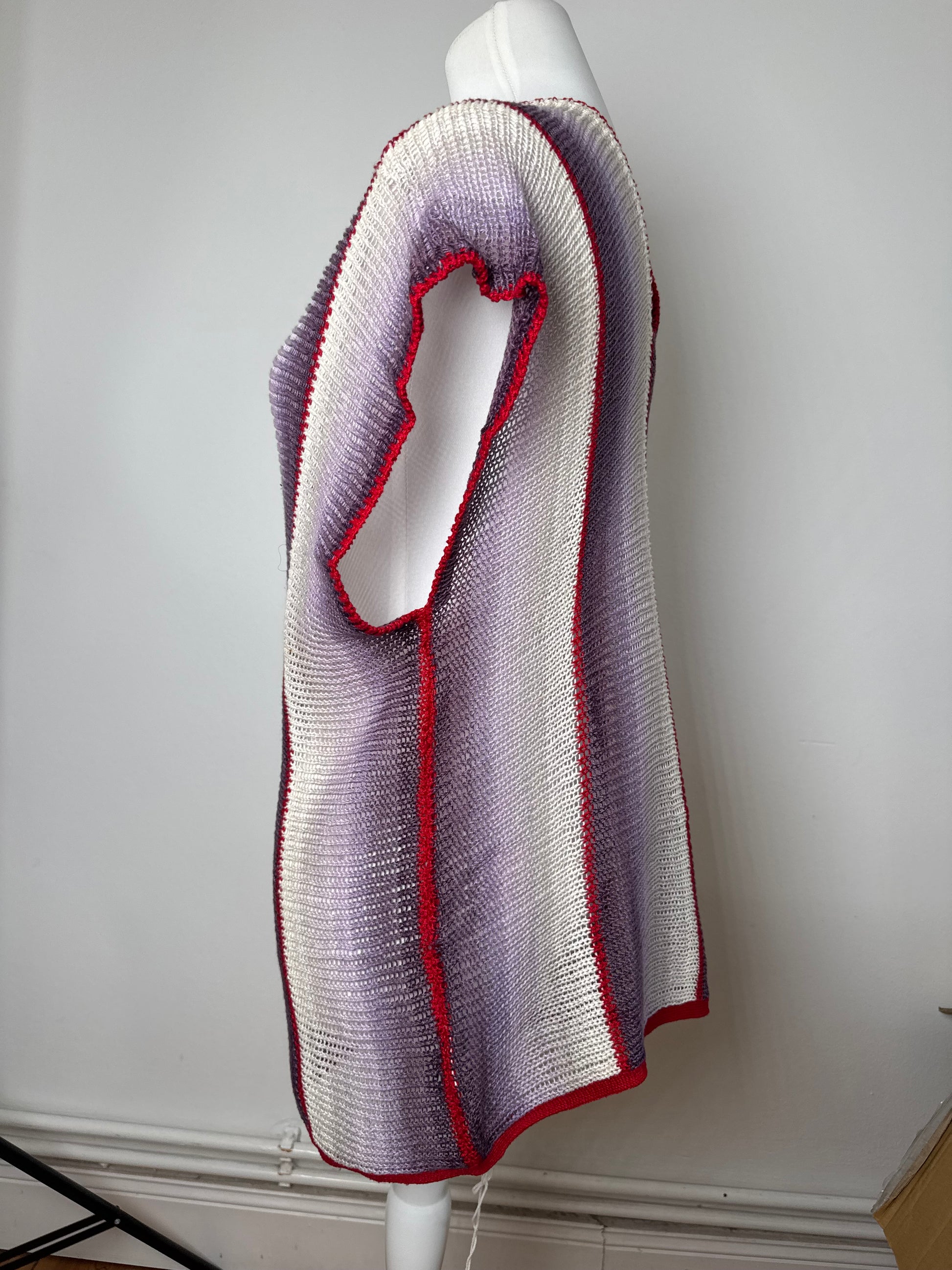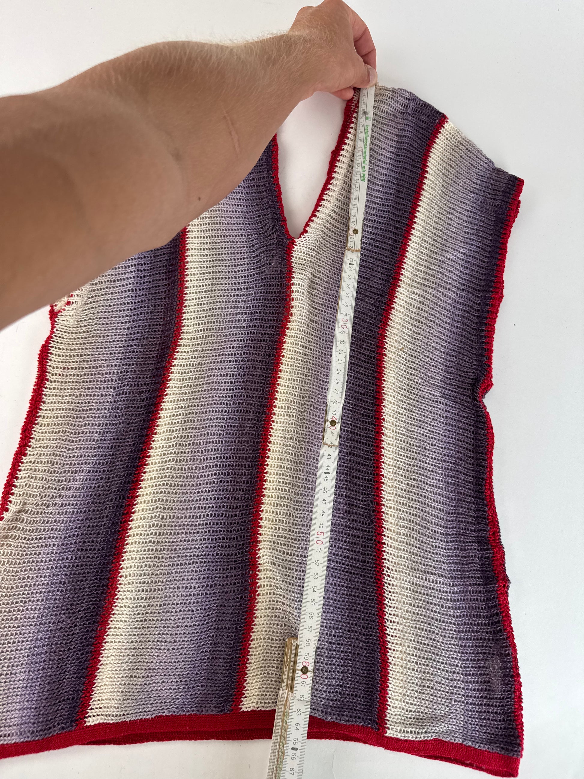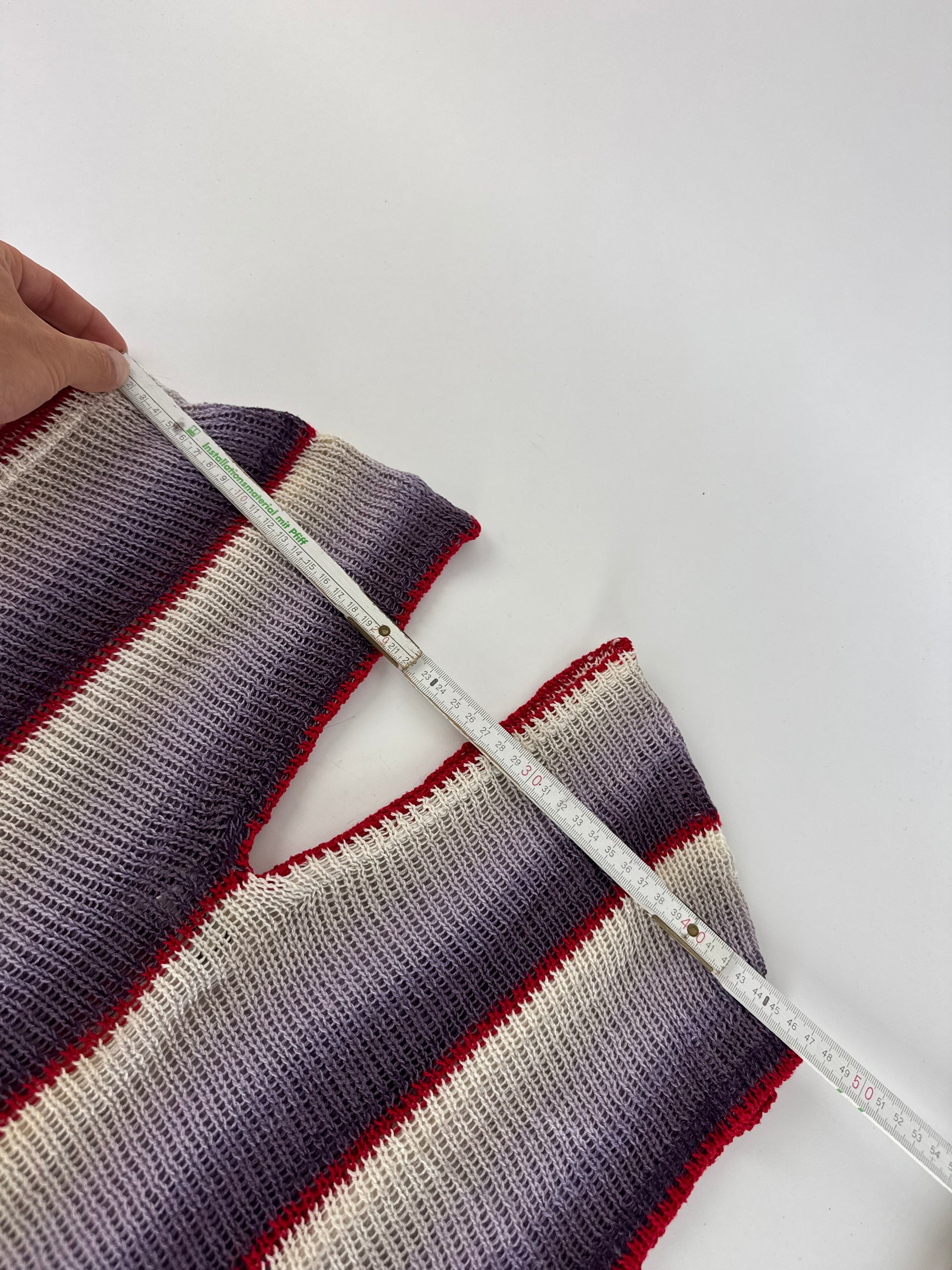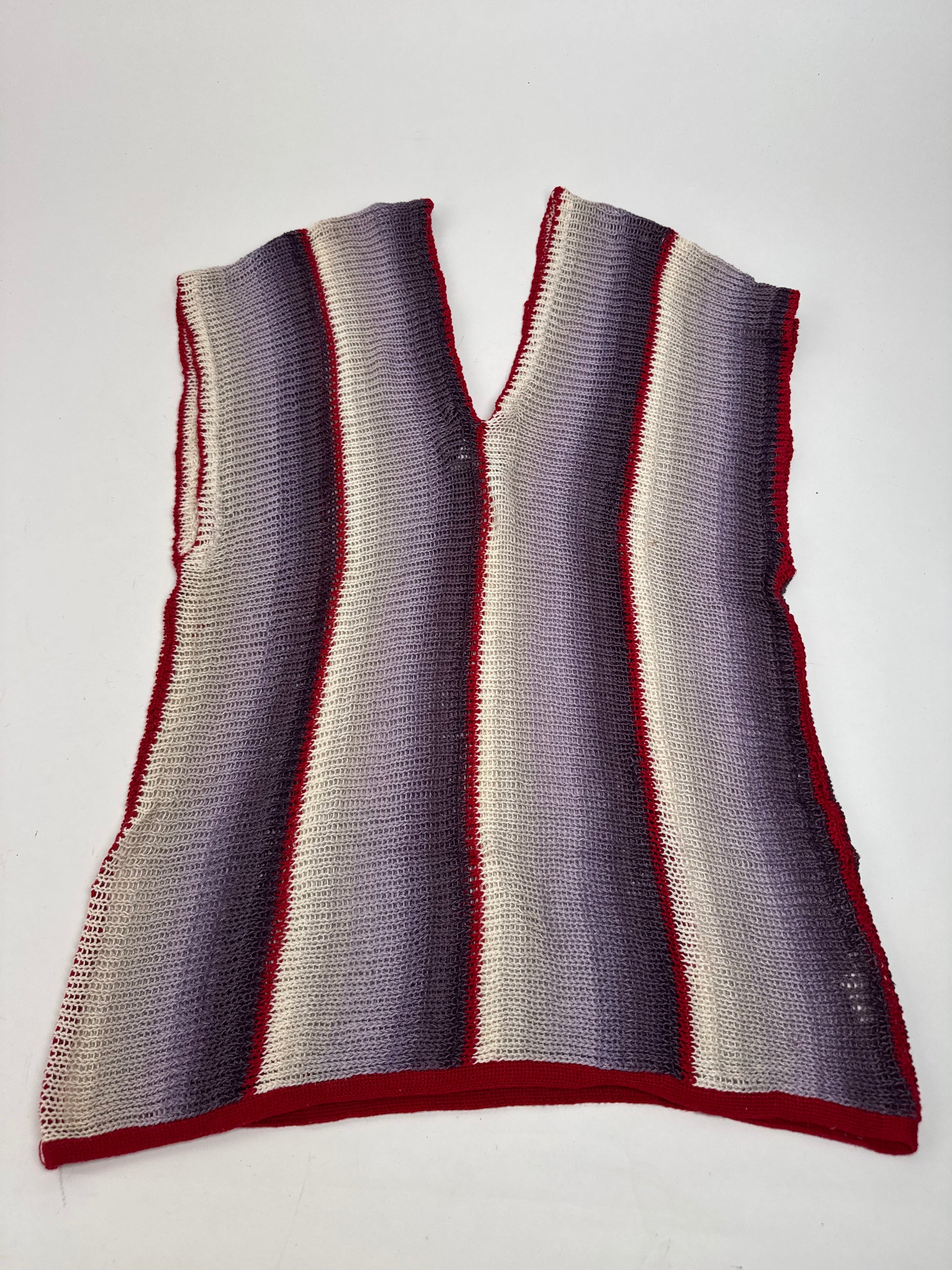 KANSAI YAMAMOTO Vintage Wool Top. This striking vintage top features a bold striped design in red, purple, black, and white. Crafted from wool with a touch of elasticity, the fabric offers both structure and comfort, though the exact composition is unknown due to a missing care label. The design includes a V-neckline and showcases the brand’s signature avant-garde style.