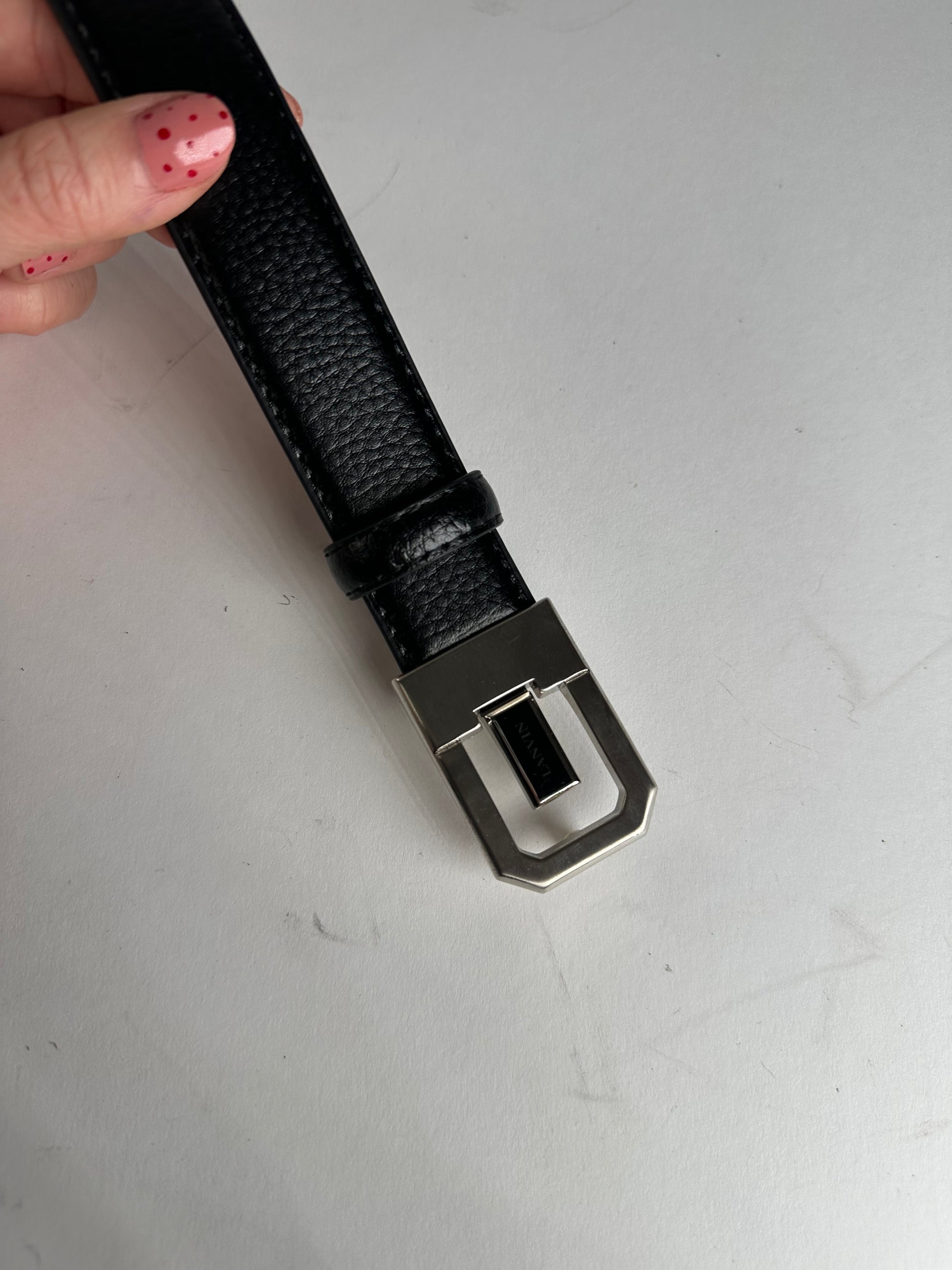 LANVIN Vintage Belt. This distinctive belt features a silver-tone steel buckle with black Lanvin logo detailing. The belt strap has been replaced and is not original from Lanvin. It is now crafted of black leather in a snakeskin pattern. The holes still need to be punched. Suitable for unisex use.