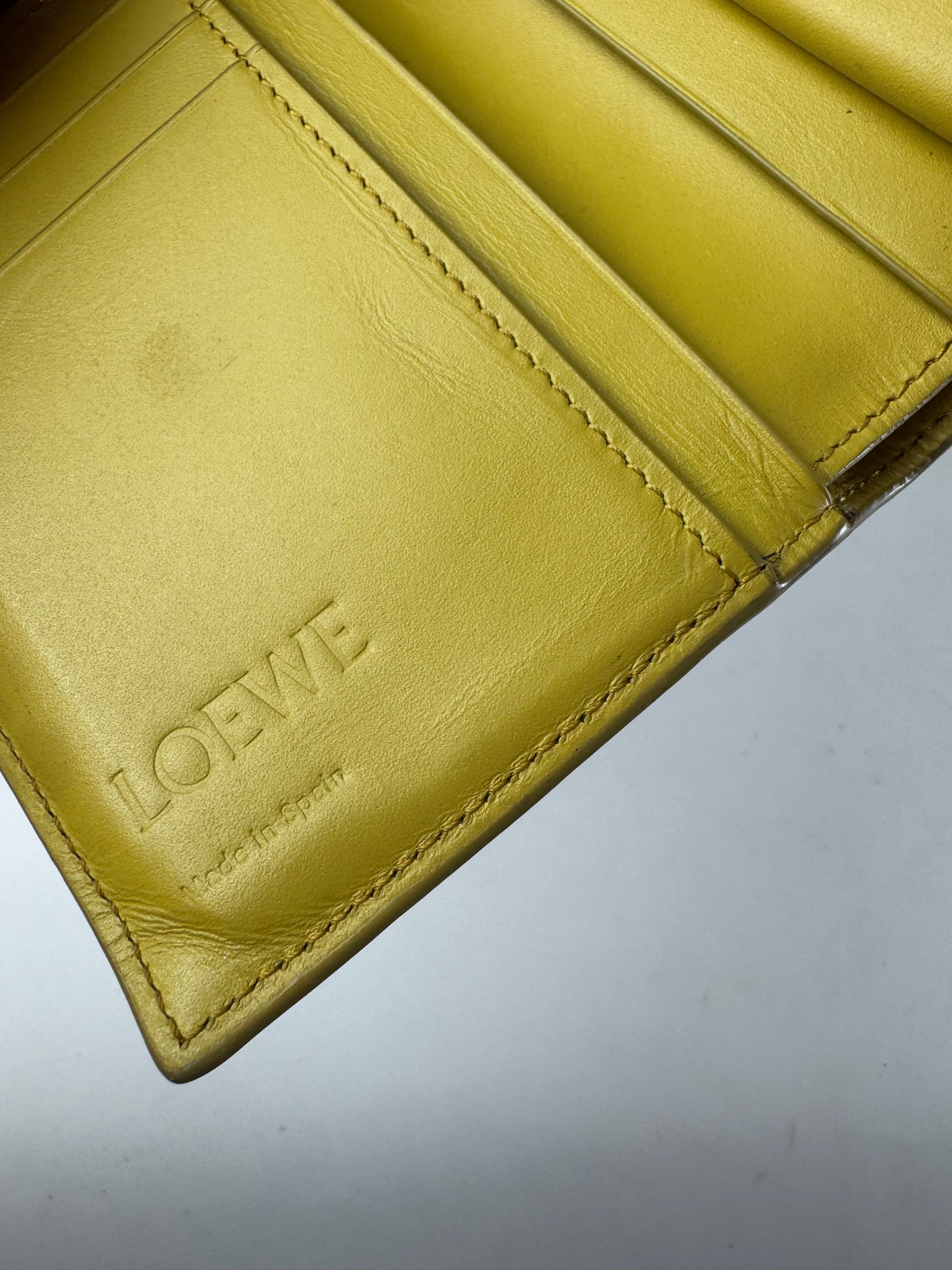 LOEWE MADRID Vintage Leather Wallet. This elegant vintage wallet is crafted from yellow leather and features the iconic Loewe Anagram logo in yellow-toned coated steel at the snap-button closure. Originally founded in Madrid in 1846, Loewe is renowned for its exceptional Spanish leather craftsmanship and timeless, understated luxury.
