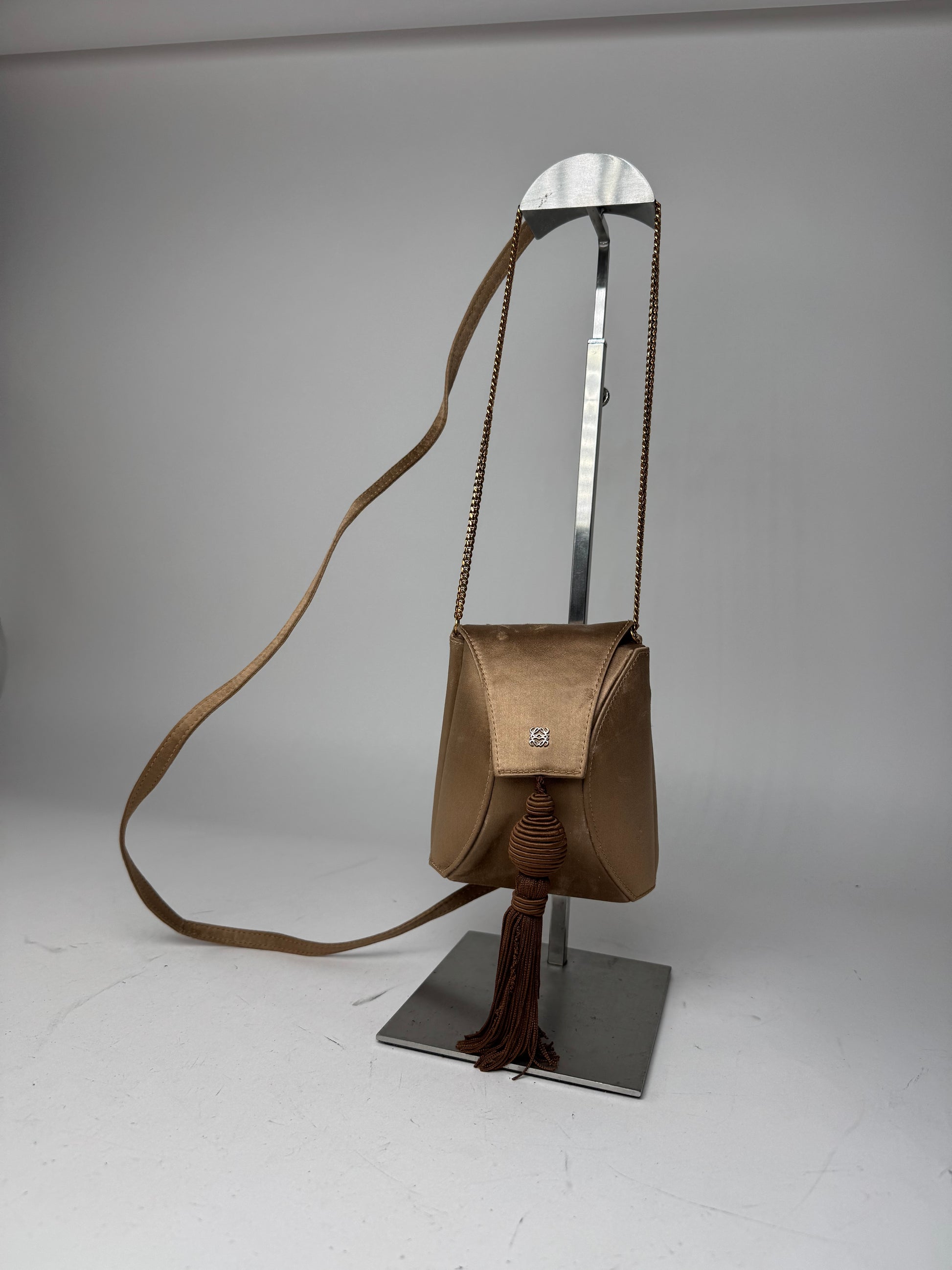 This elegant vintage crossbody bag is finely crafted from gold-toned cotton-blend material and features a distinctive brown leather tassel detail. The design includes a layered gold chain that can be worn over the shoulder or carried by hand, as well as an attached brown leather strap extending to the base, allowing it to be worn crossbody. The bag closes with a magnetic snap and opens to a brown leather interior. Made in Spain, this piece reflects Loewe’s heritage of Spanish luxury craftsmanship.