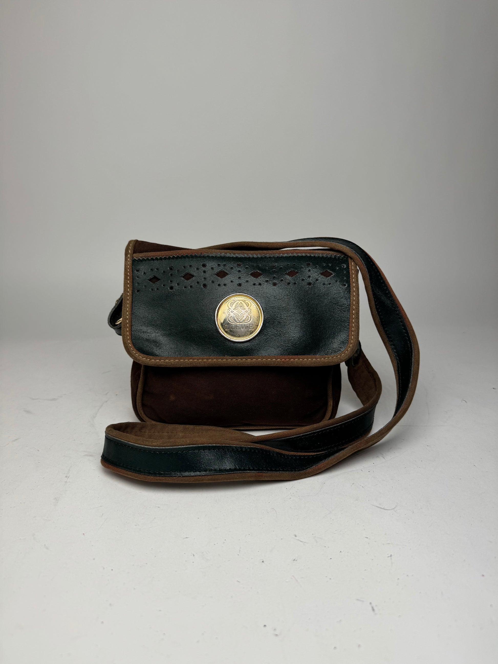 This elegant shoulder bag is finely crafted of green leather and brown canvas, featuring Loewe’s signature Anagram logo in gold and silver-tone steel on the front. Likely dating back to the 1970s, this design captures the spirit of Loewe’s heritage — refined Spanish craftsmanship blended with timeless elegance.